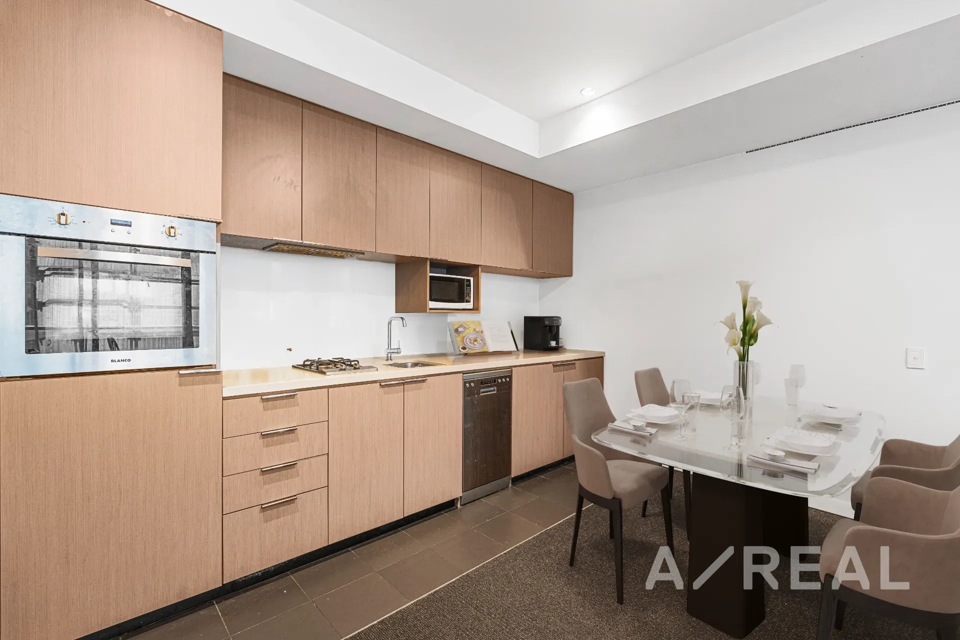 Impeccably presented from start to finish, inviting interiors reveal a free-flowing living/dining area, including a well-appointed stone-topped kitchen, that effortlessly unfolds to a covered balcony, perfect for seamless indoor-outdoor entertaining