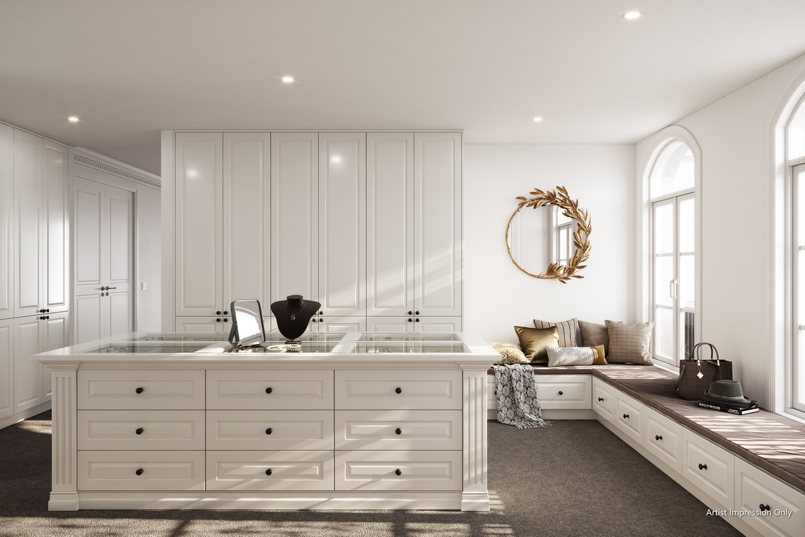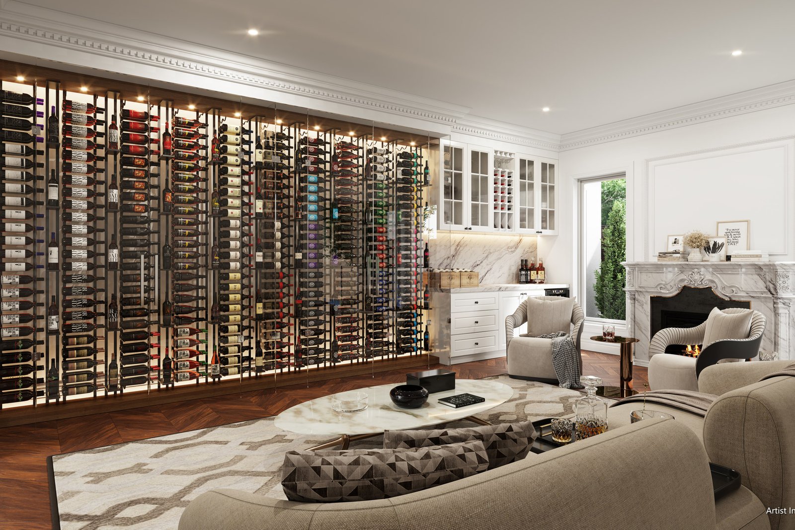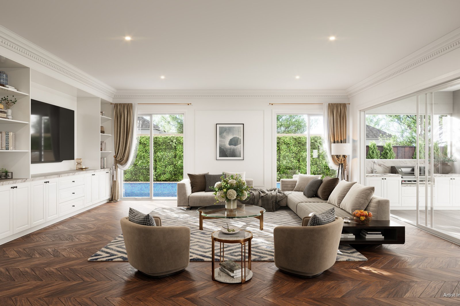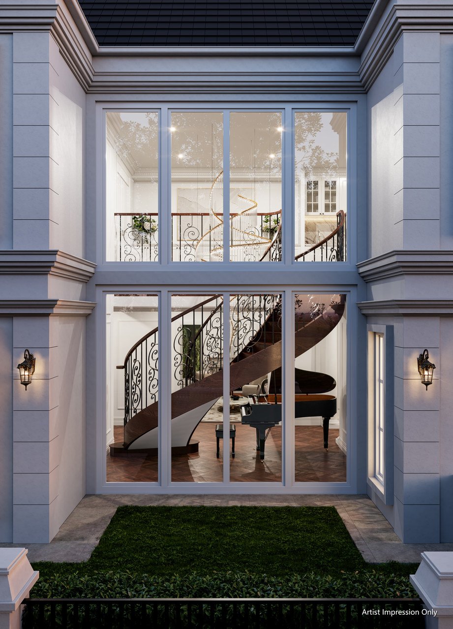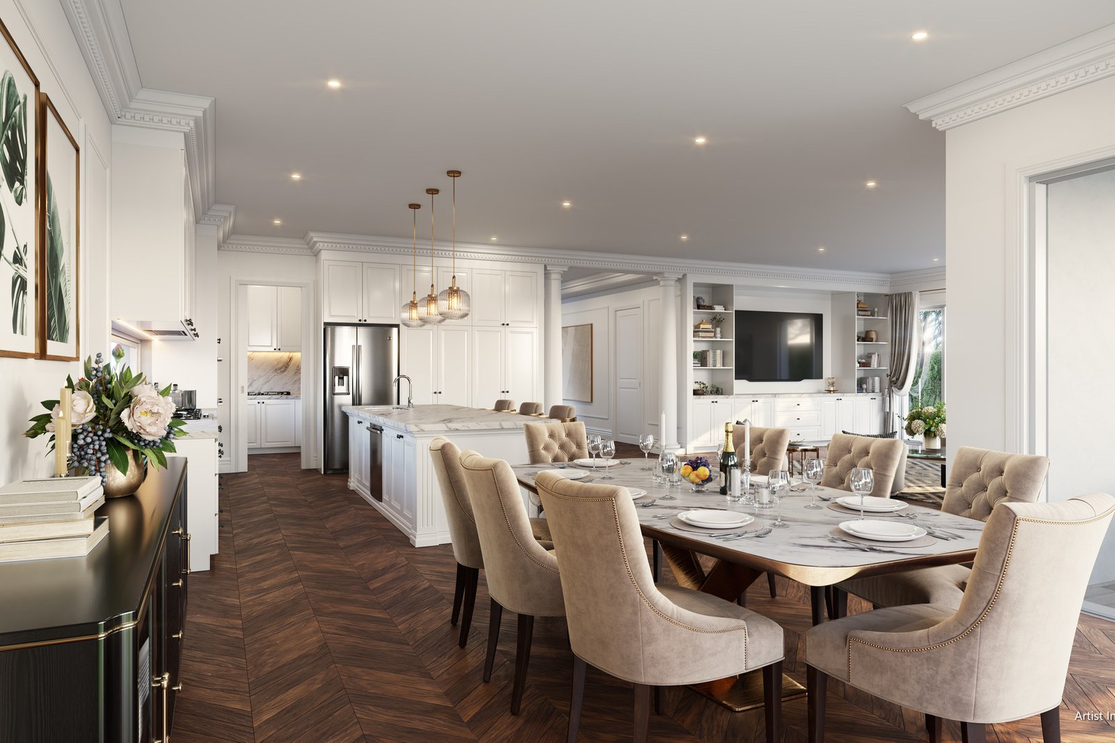 Luxury exudes throughout the interior design, showcasing classic French Provincial living. Decorative lines adorn the ceilings and wall skirting, while European oak and herringbone parquetry flooring enhance the ambiance.