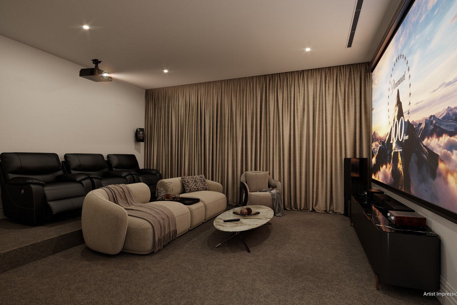 Beyond its impressive exterior, a grand entry welcomes with a decorative spiral staircase alongside floor-to-ceiling double-story windows, while on the other side, a sitting/lounge room showcases a marble fireplace and custom-made glass wine display cabinets. The ground level hosts a sizable guest bedroom with a generous walk-in robe and en-suite bathroom, as well as a theater room complete with a full set of projector, screen, and centralized sound system.