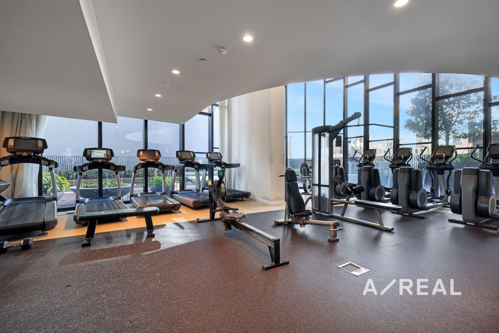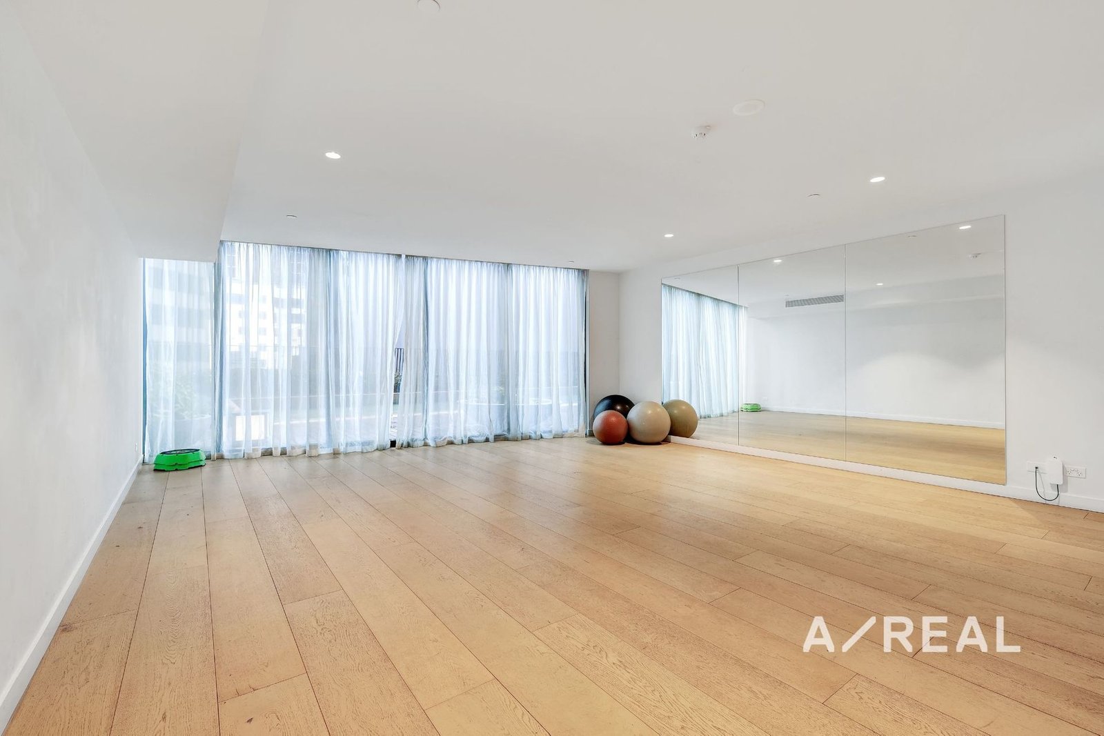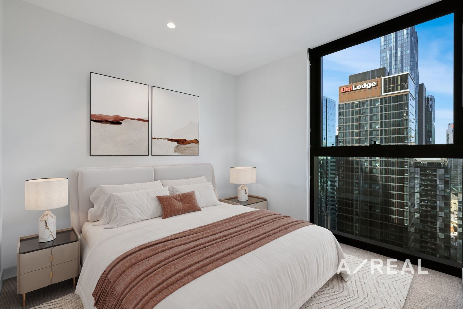 Soft neutral tones, floor-to-ceiling windows and bespoke finishes exude sophistication in the open-plan living/dining area, complemented by a sleek stone-topped kitchen featuring stainless steel appliances, split system heating/AC, secure intercom entry and balcony.
