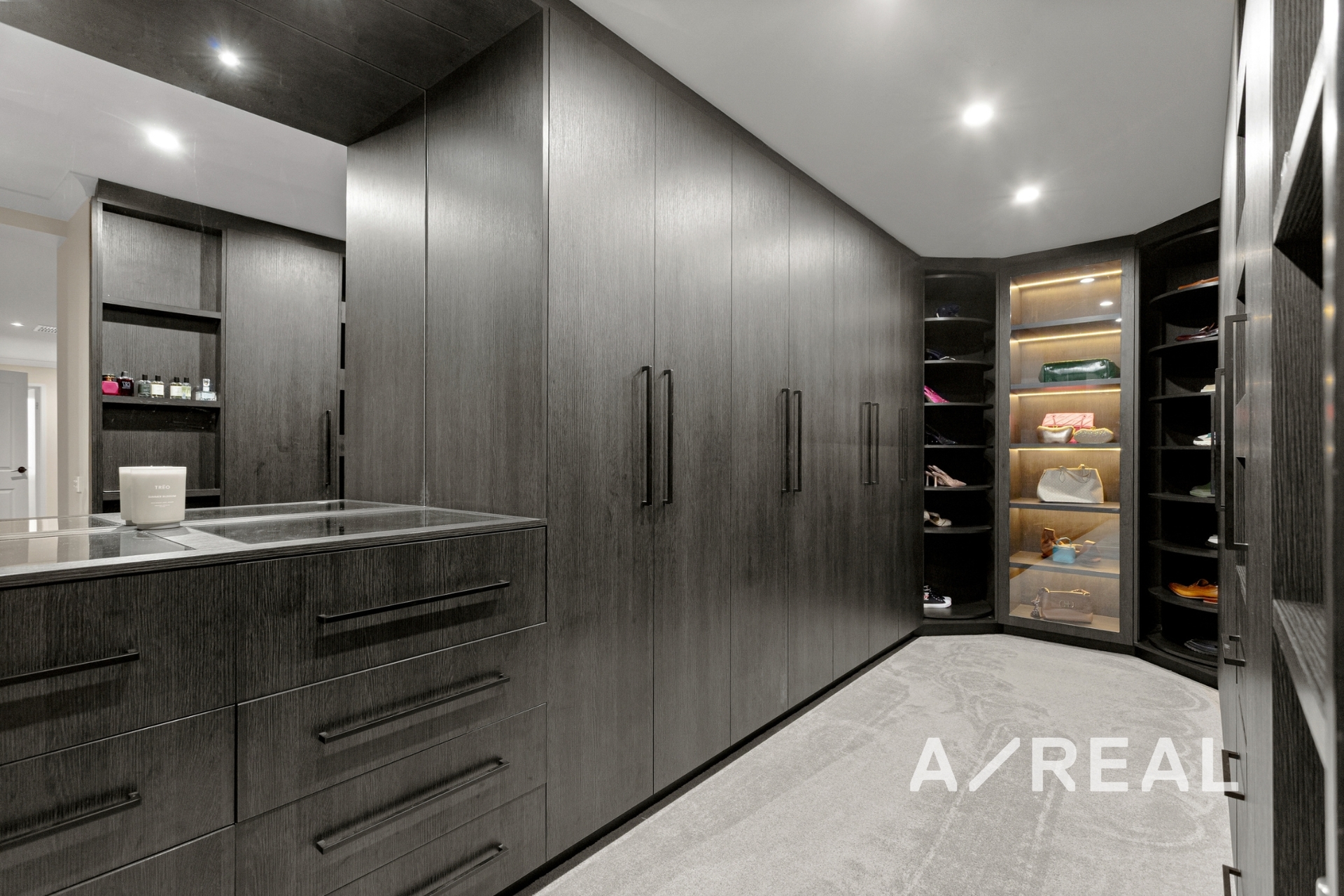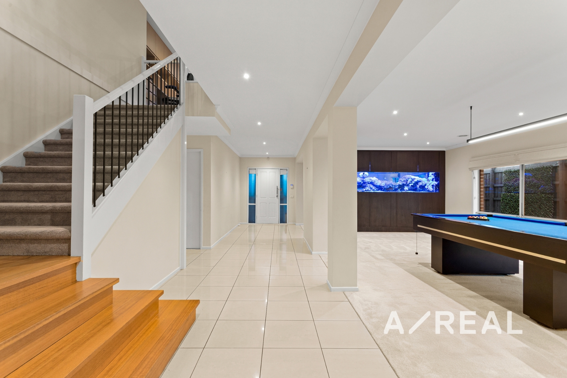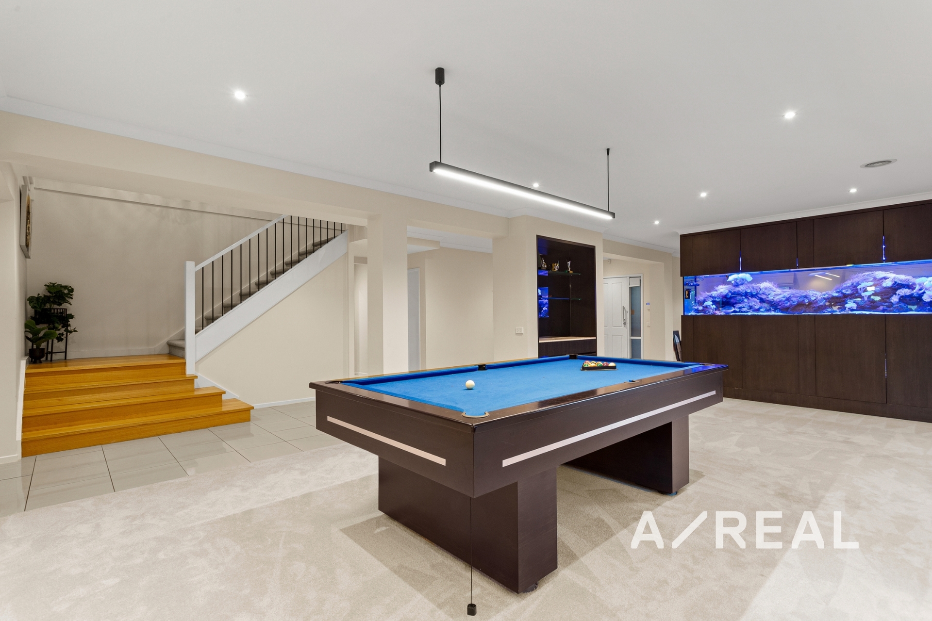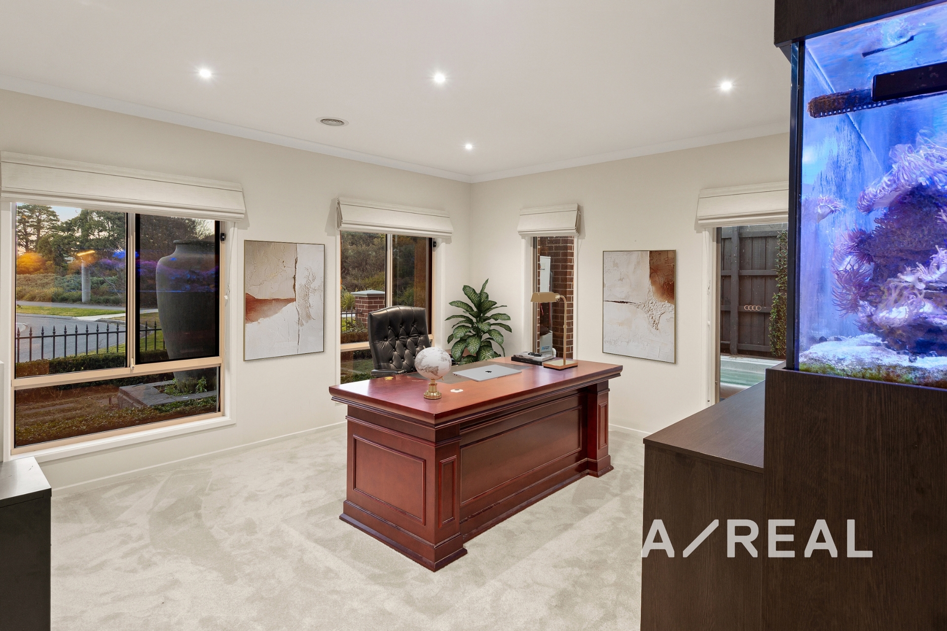 The ground floor also includes a formal lounge and dining area, separated by a spectacular marine-grade integrated aquarium, adding a unique touch of tranquility and grandeur. Upstairs, the home continues to impress with a large children's retreat featuring a built-in study, and four generous bedrooms, including a palatial master suite. Here you'll find a private parents' retreat, a luxurious ensuite with a free-standing bath and double vanity, and an incredible custom-designed dressing room with his-and-hers robes and bespoke cabinetry.