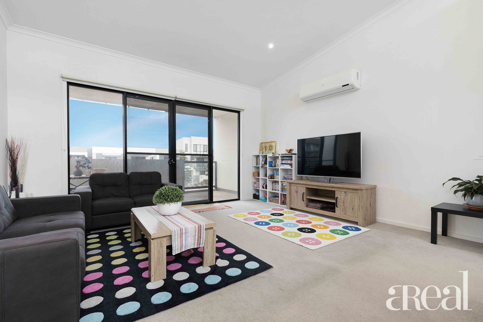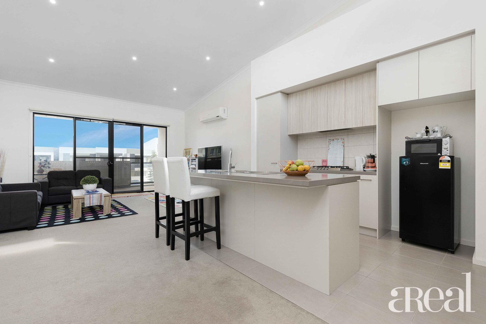 Light-filled living area with access through the glass sliding door to the balcony, with the ocean round the corner
