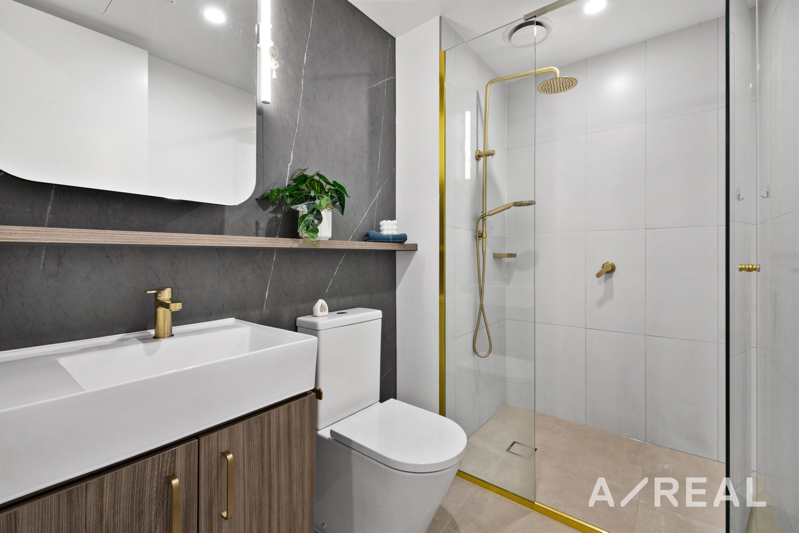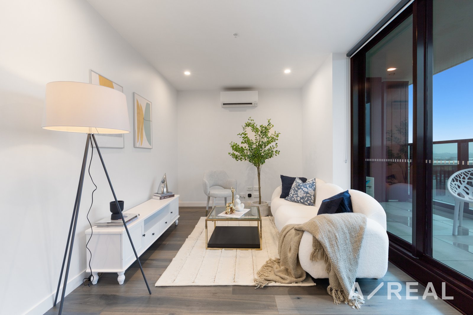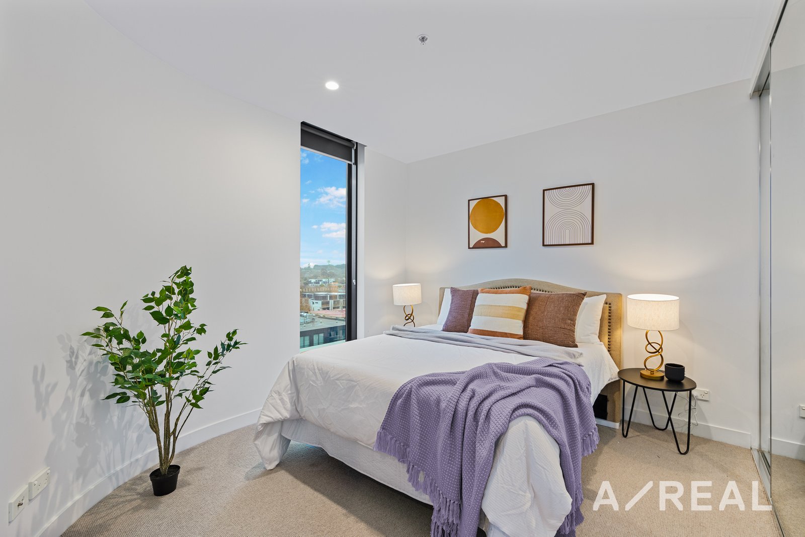 Sliding doors extend the space out onto a delightful balcony with far-reaching views, while floor-to-ceiling windows encourage natural light to stream into the generously sized bedroom, serviced by mirrored built-in robes and a style-focused adorned bathroom with Englefield brass tapware.