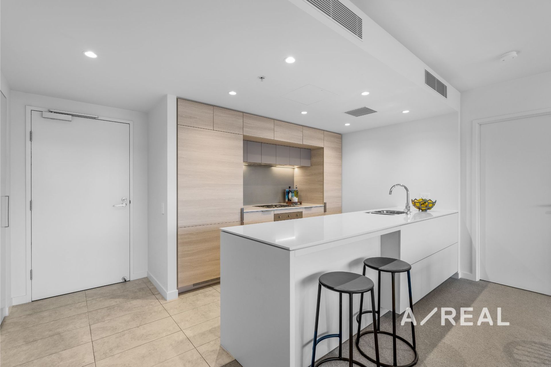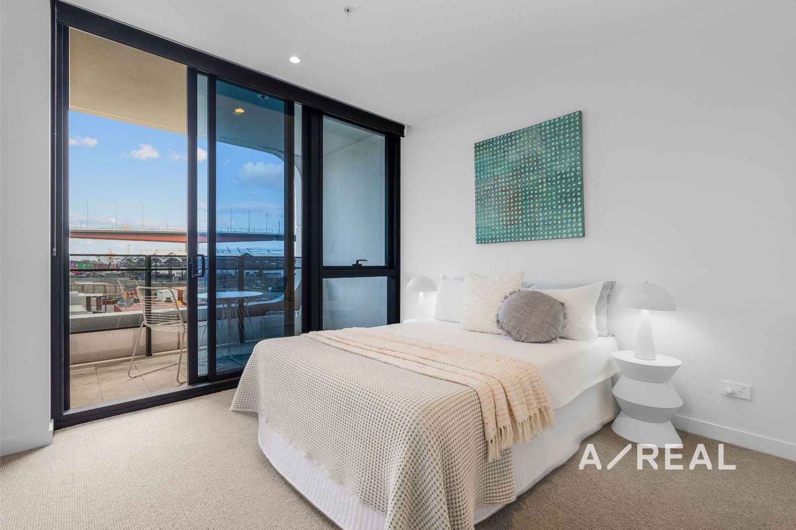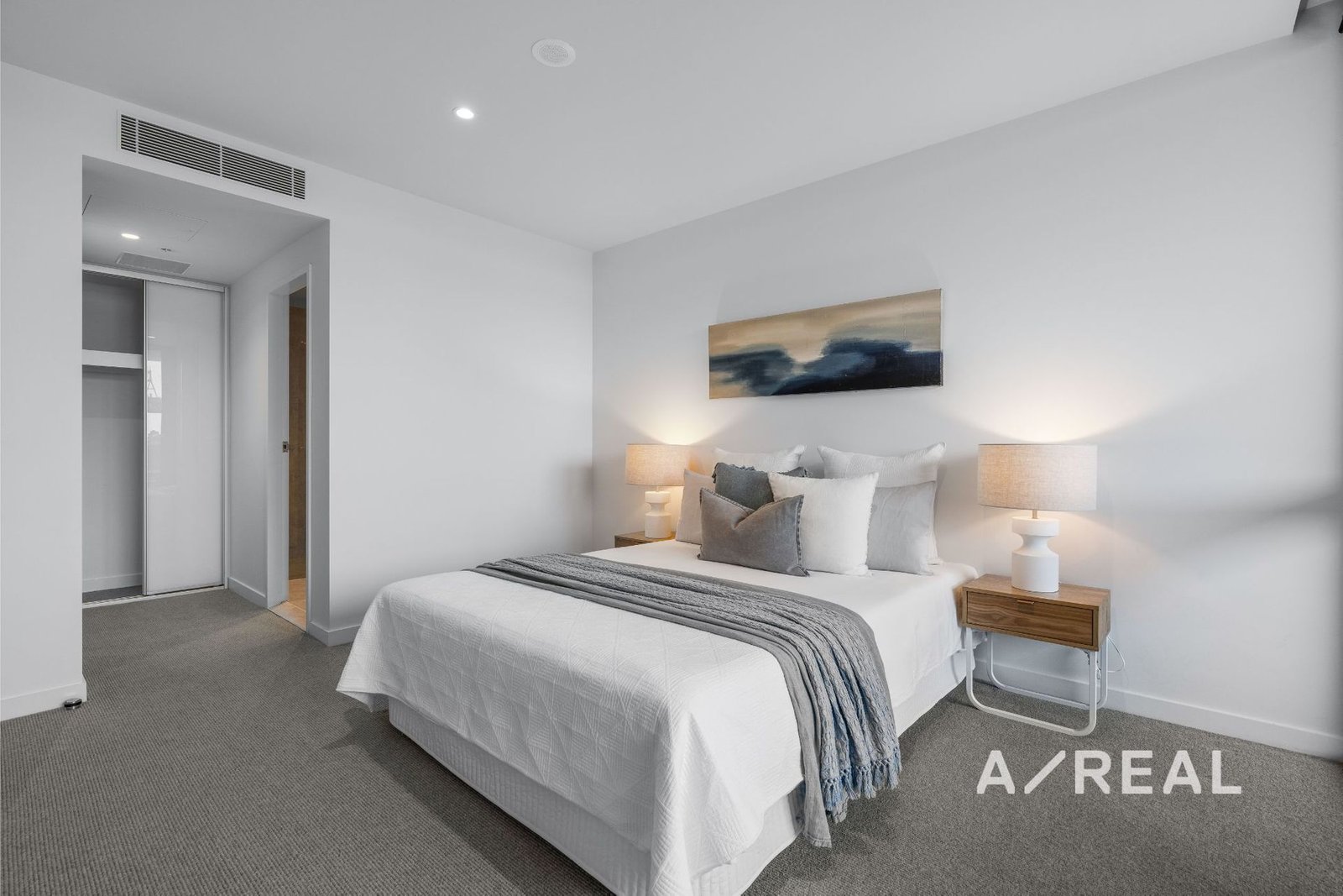 Sleek contemporary interiors are flooded with natural light and offer open-plan living/dining, complemented by a deluxe stone-topped kitchen, ducted heating/AC, two over-sized bedrooms each fitted with BIRs and balcony access (main with striking ensuite), plus a bespoke bathroom.