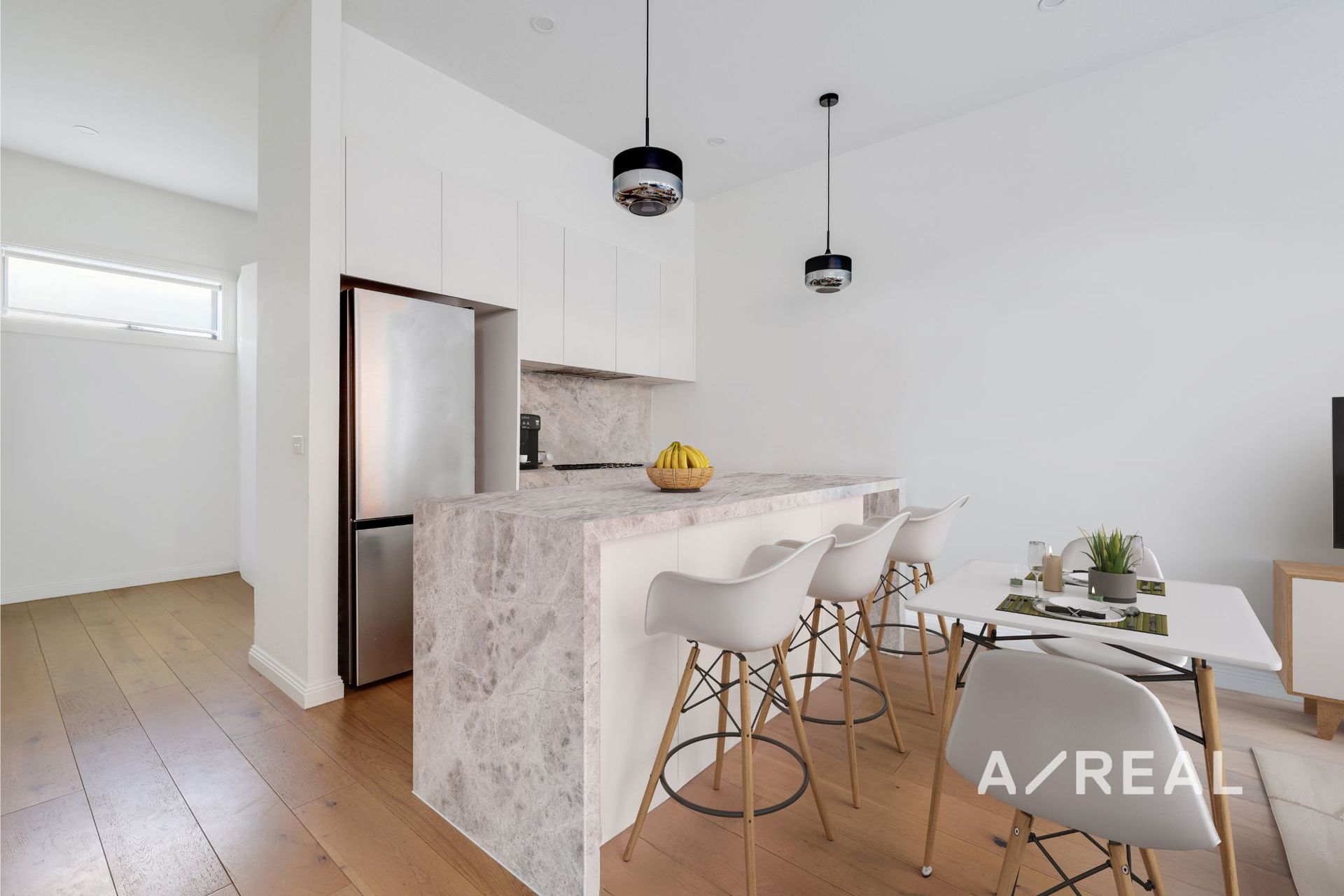 Welcomed by timber floors, 3m ceilings and saturating natural light, a modern vibe and inviting ambience enhances the sun-flooded open-plan layout, merging with s striking, well-equipped kitchen showcasing natural marble benchtops, premium Miele appliances and ample storage.