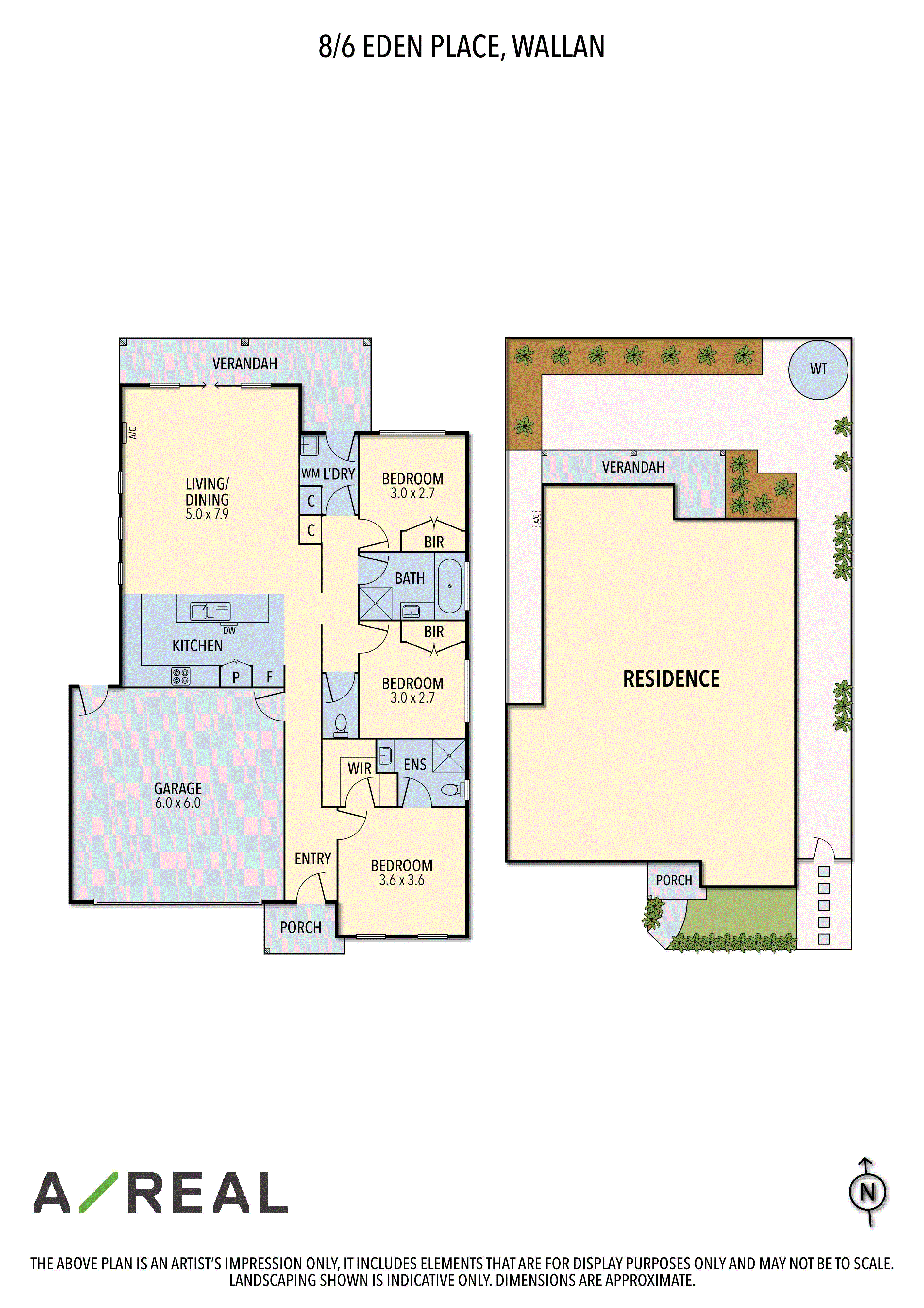 Welcome to 8/6 Eden Place, Wallan - This home offering the perfect balance of comfort, space, and low-maintenance living. Ideally positioned in a quiet, private pocket of Wallan, this property is perfect for first-home buyers, investors, or downsizers looking for a move-in-ready home. Boasting three generous bedrooms, the master features a walk-in robe and private ensuite, while the additional two bedrooms include built-in robes and are serviced by a central bathroom with a full-size bath and separate toilet. The heart of the home is a spacious open-plan living and dining area, seamlessly connected to a modern kitchen complete with stainless steel appliances, breakfast island, and dishwasher - ideal for family living and entertaining. Sliding doors open out to a rear verandah and a fully fenced courtyard, providing a peaceful outdoor retreat surrounded by neat, low-maintenance gardens and a water tank.