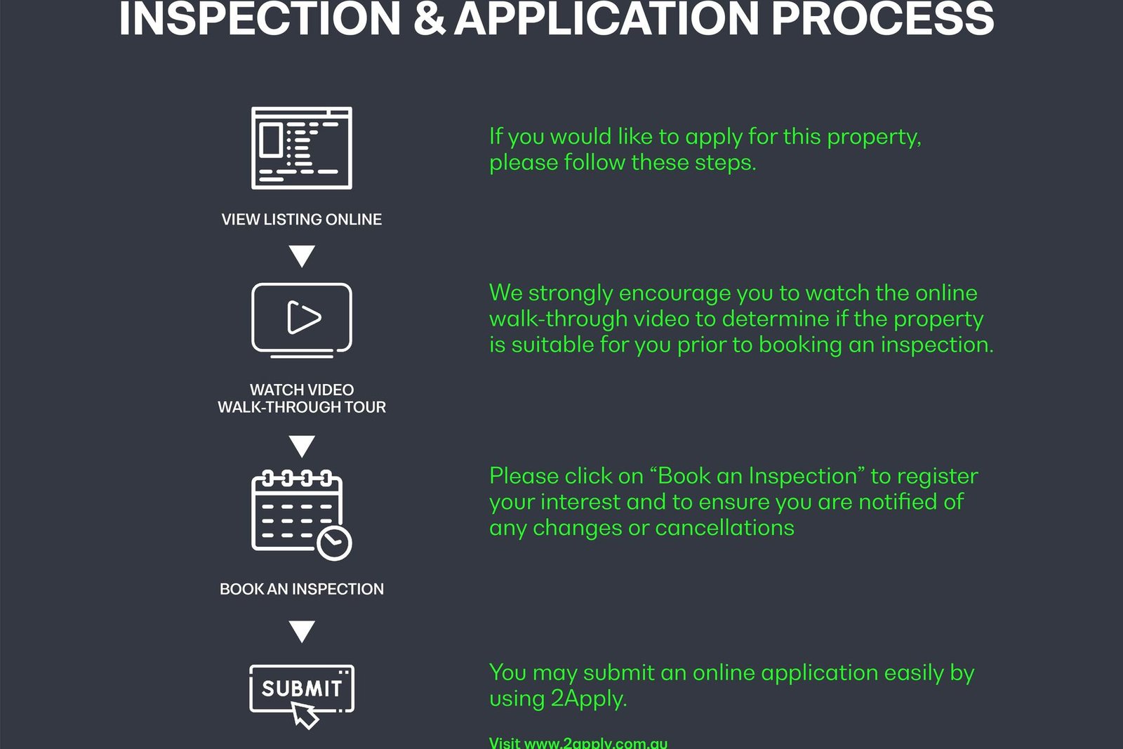 To apply for this property, please enter your details to register for an inspection (if you do not register you will not receive updates regarding any changes and/or cancellations). Please note: we are unable to accept tenancy applications until the property has been inspected. Simply click on EMAIL AGENT, enter your details and receive instant details of the inspection times. We look forward to meeting you at the inspection!