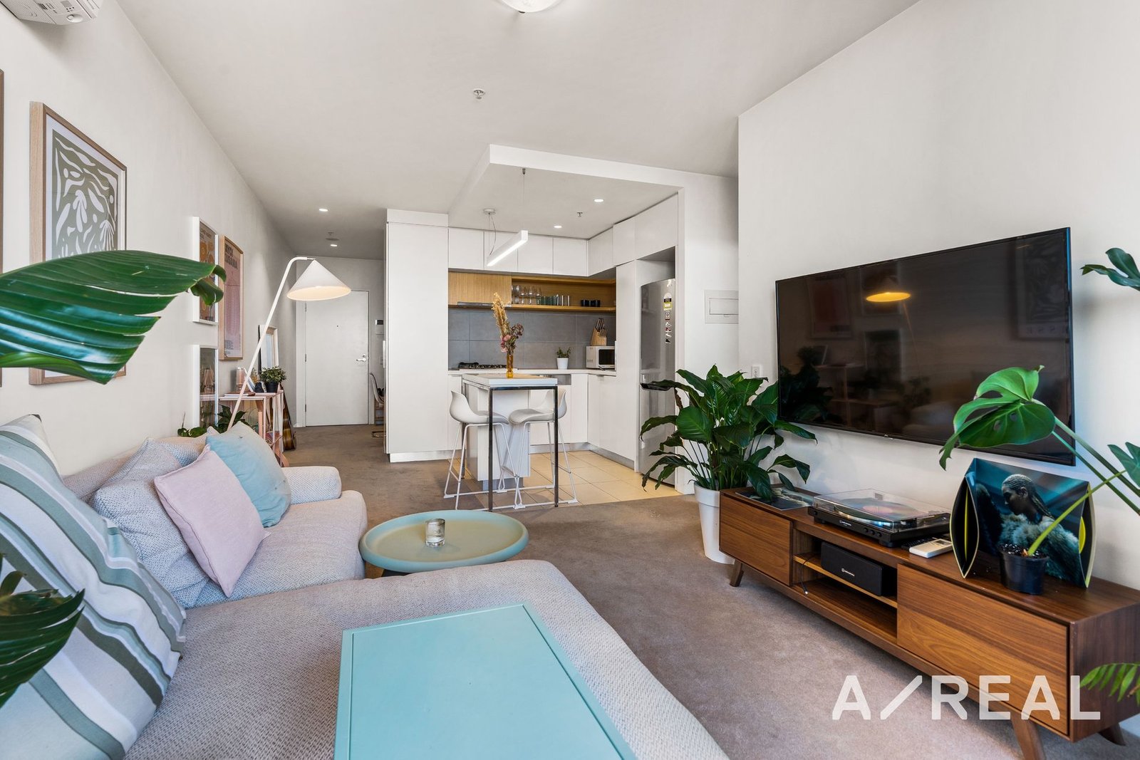 The stylish kitchen features all you need to prepare delicious meals including a gas cooktop, dishwasher, ample storage space, and an island with seating, and flowing from here is the spacious air-conditioned living room that invites you to sit back and relax.