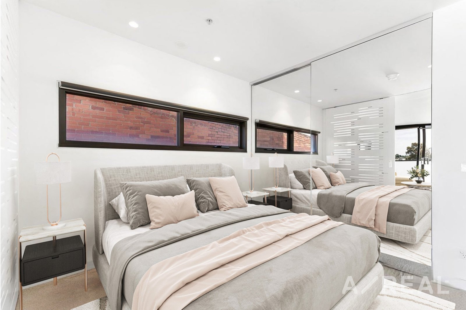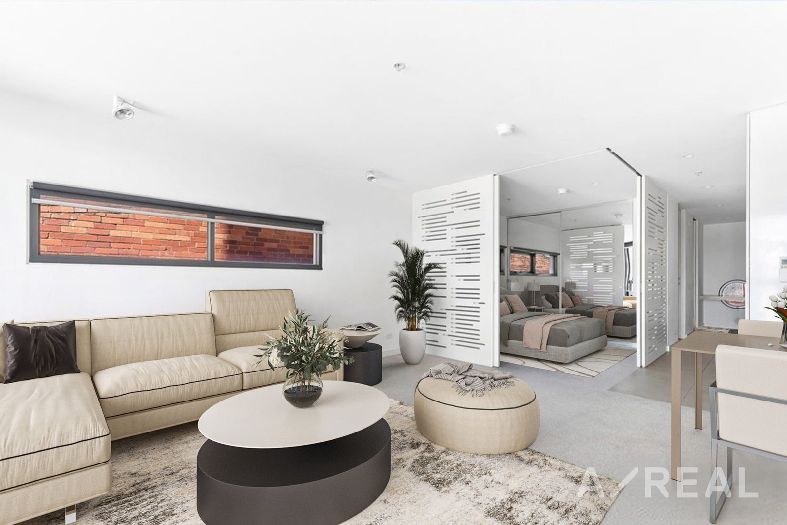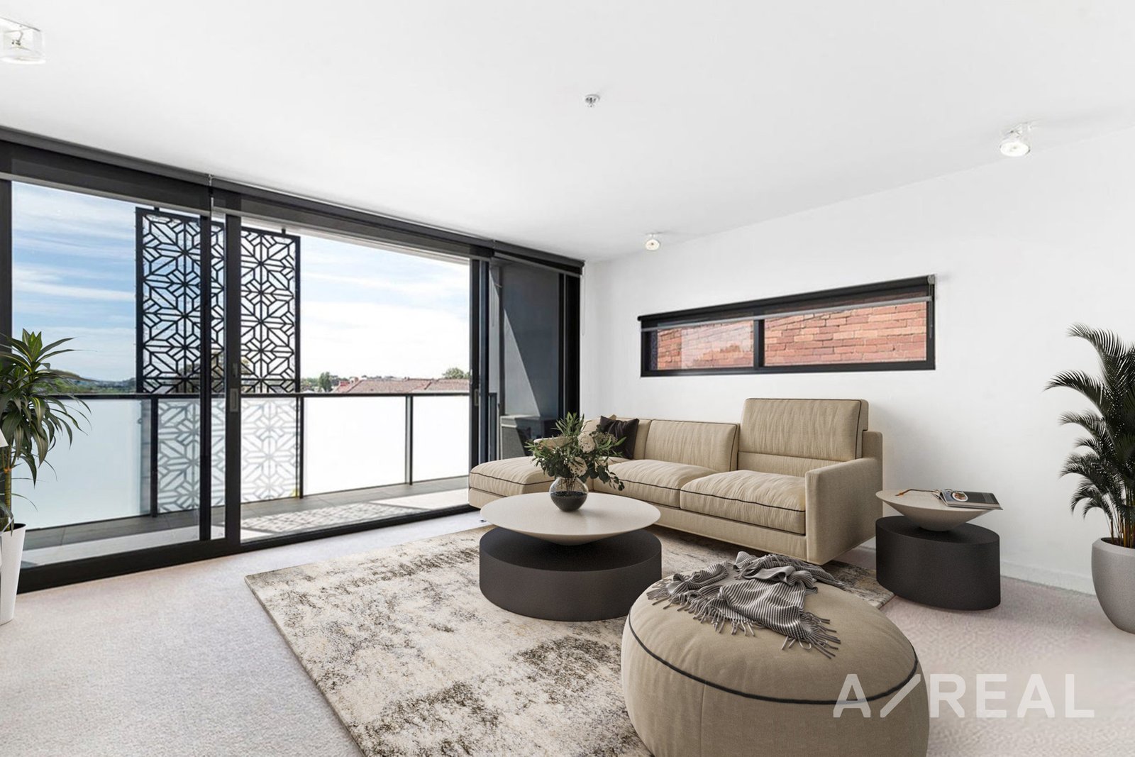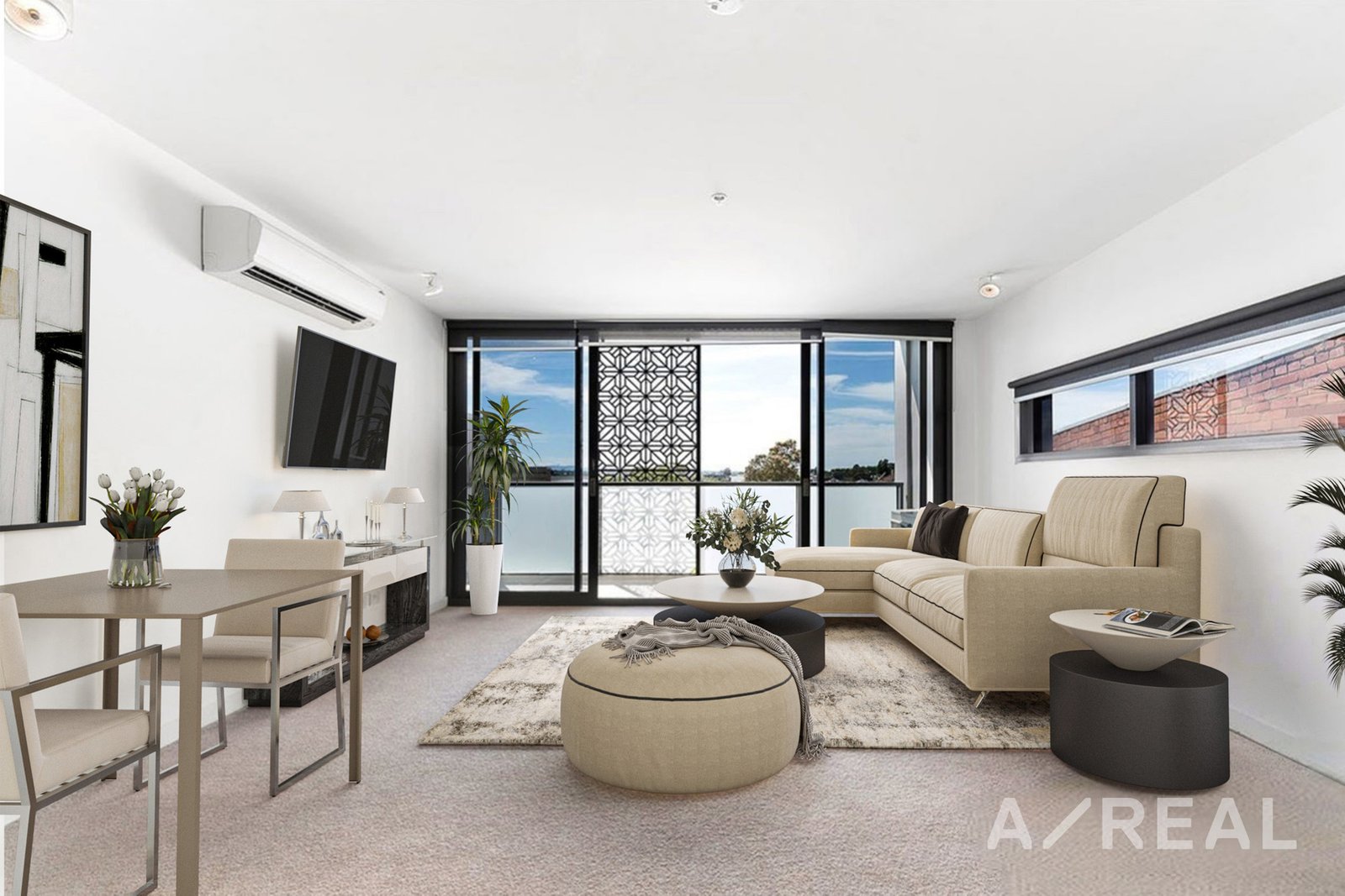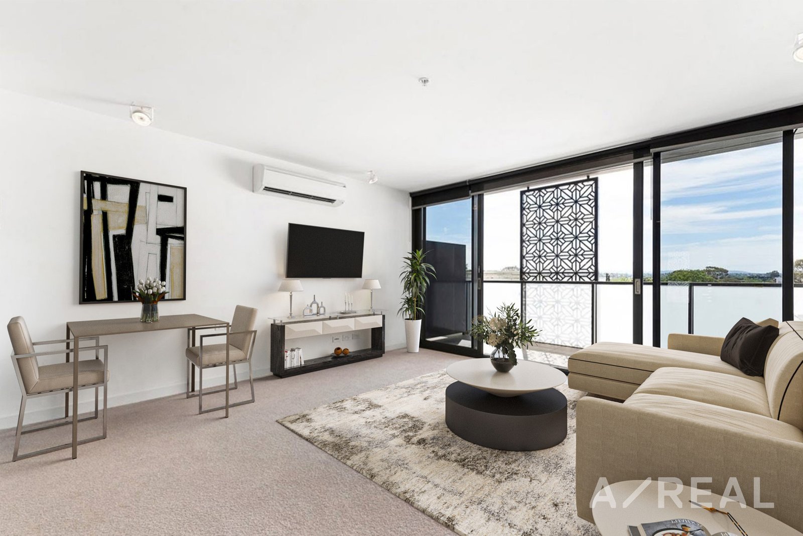 The master bedroom boasts a mirrored built-in robe, while the second bedroom features ample cupboards and a versatile wall bed. A thoughtfully designed study area provides a dedicated workspace, and a sunlit balcony extends from the main living area, perfect for relaxation or entertaining.