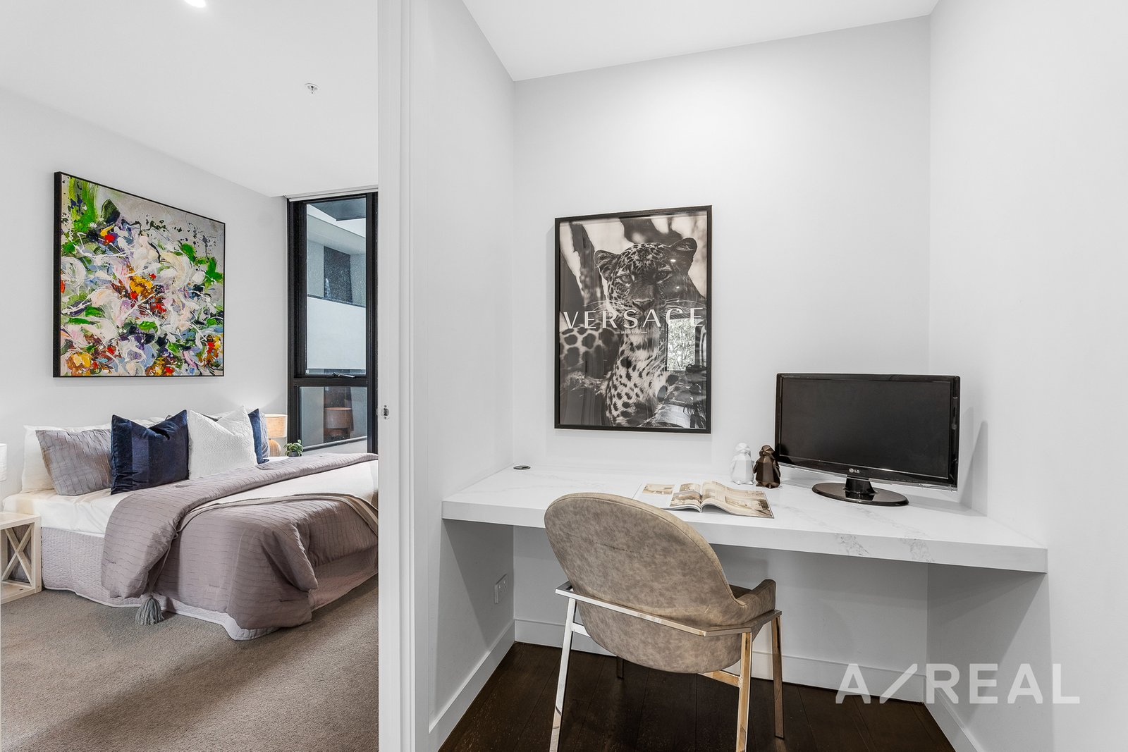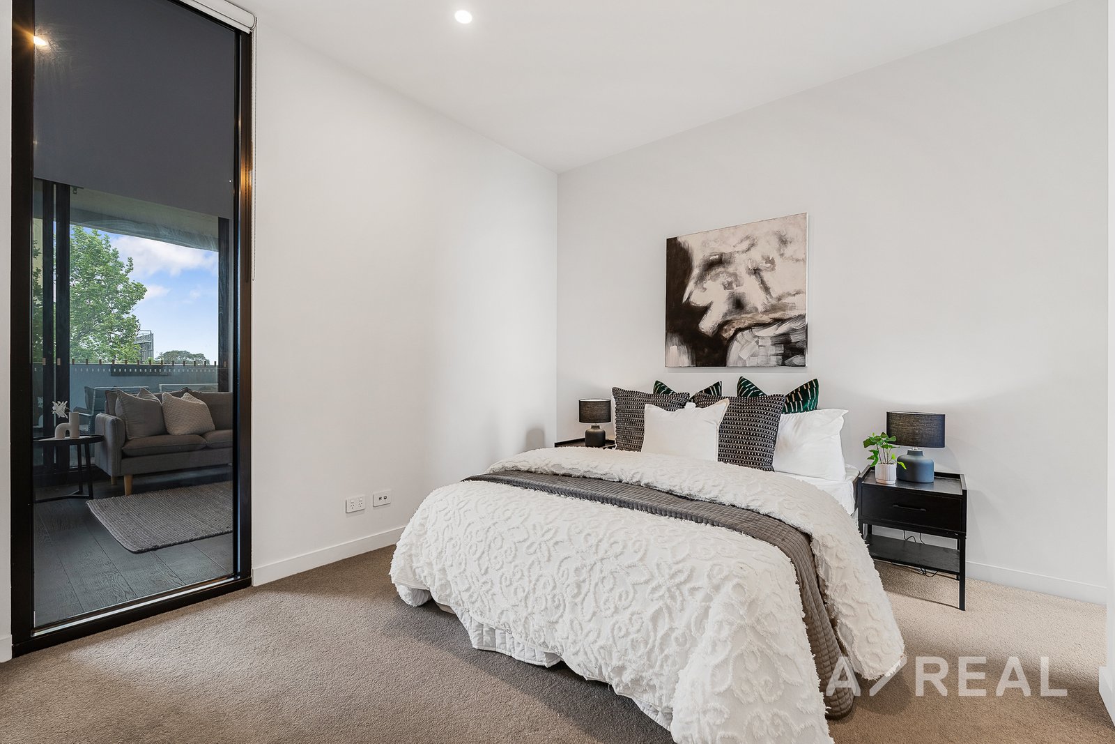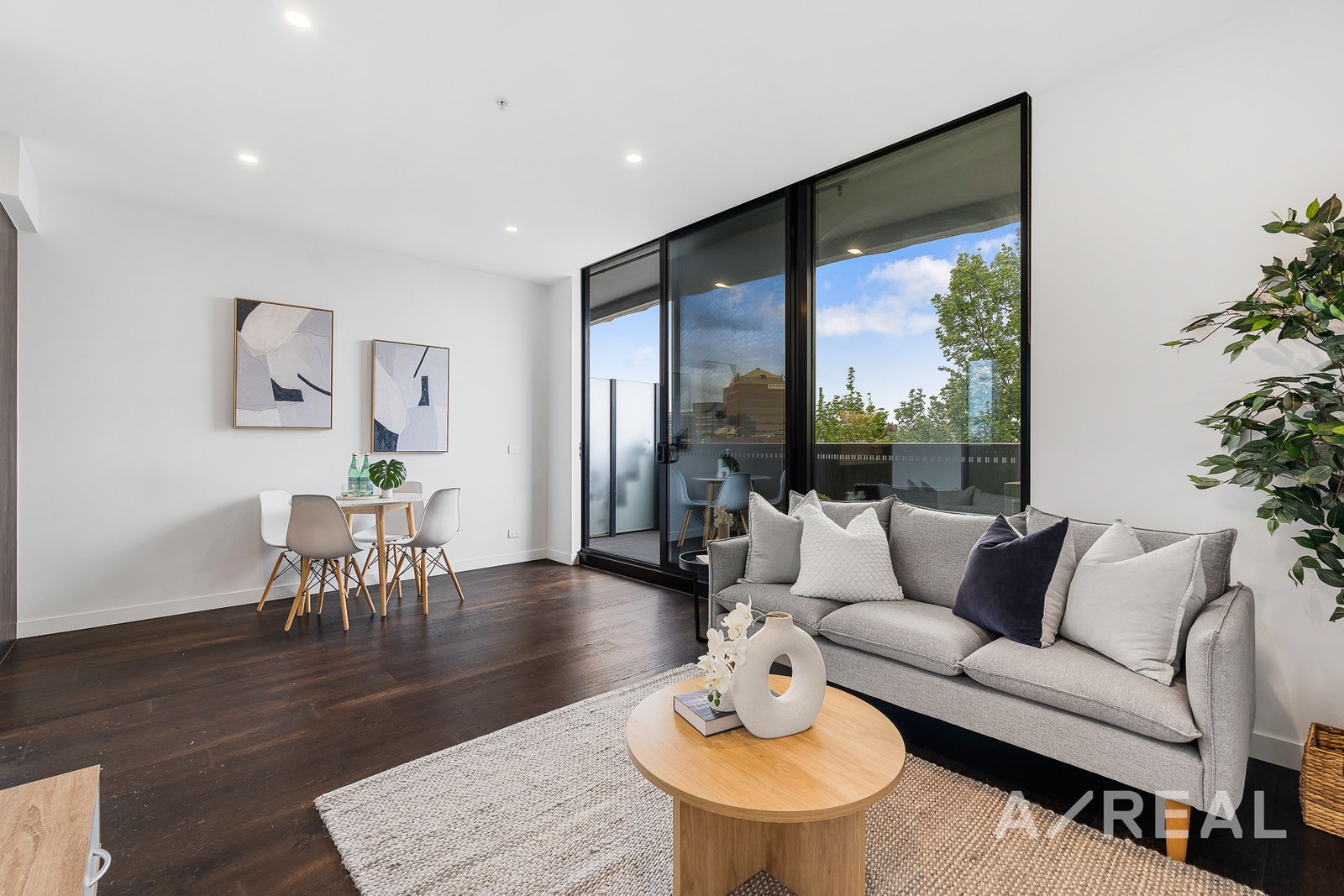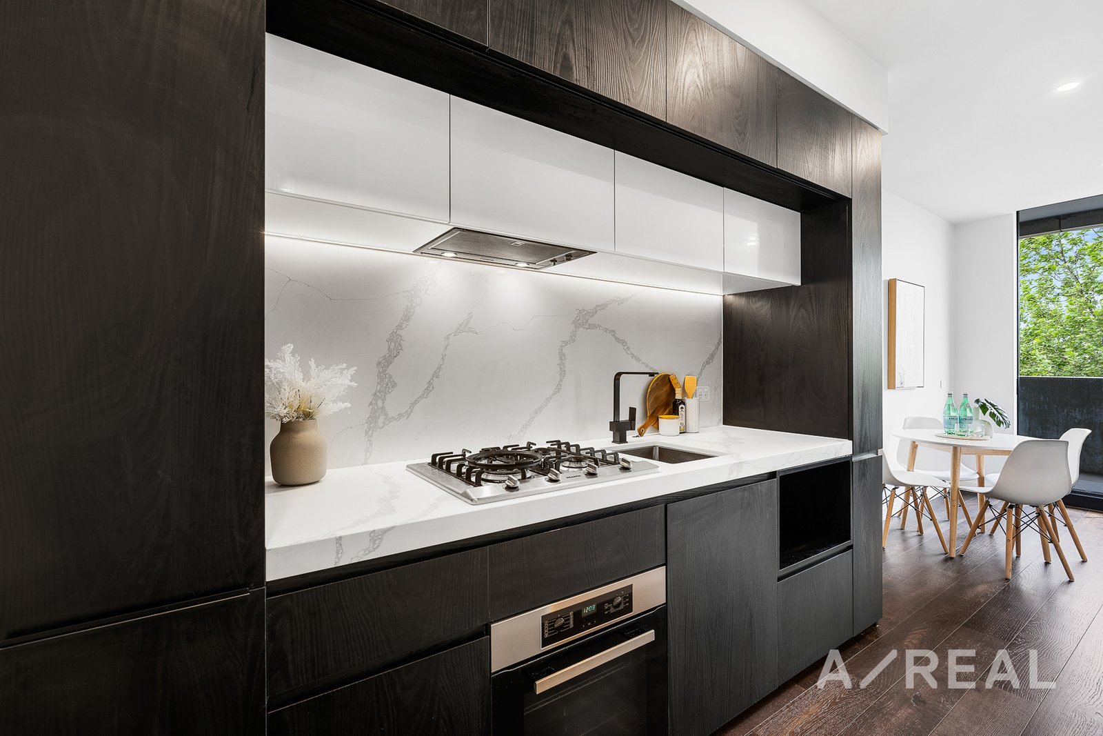 Upon entering, you'll be greeted by dark timber floors that lead you into a sleek and contemporary space. The stylish, handleless black kitchen is a standout feature, boasting ample cupboard space, sparkling white marble splashback and countertops, gas cooking, and integrated appliances that cater to your culinary needs. The open-concept design seamlessly connects the kitchen to the living and dining areas, creating an inviting atmosphere for entertaining and relaxation. And you can simply step out to the sunny balcony and take in the views anytime.