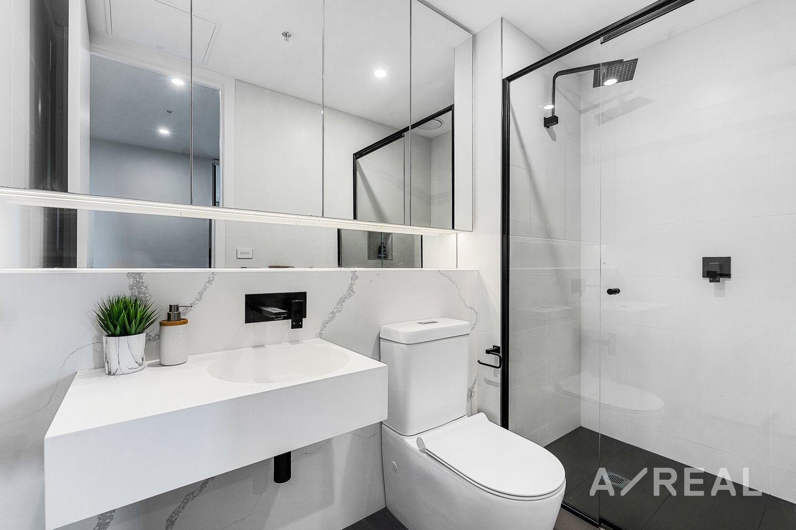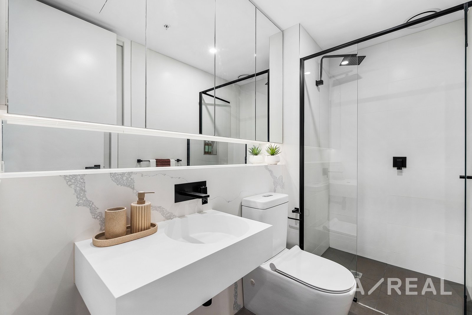 Both bathrooms exude luxury with their crisp white aesthetics, offering ample storage and generous mirror space. The master bedroom serves as a private retreat, complete with its own ensuite, while both bedrooms come with built-in robes for tidy storage solutions.