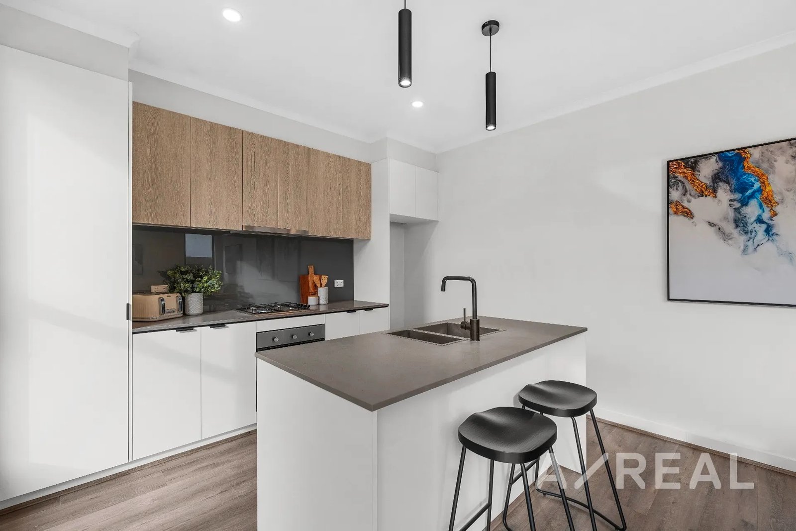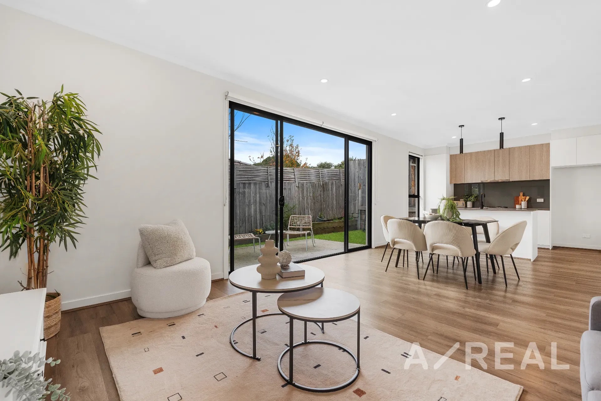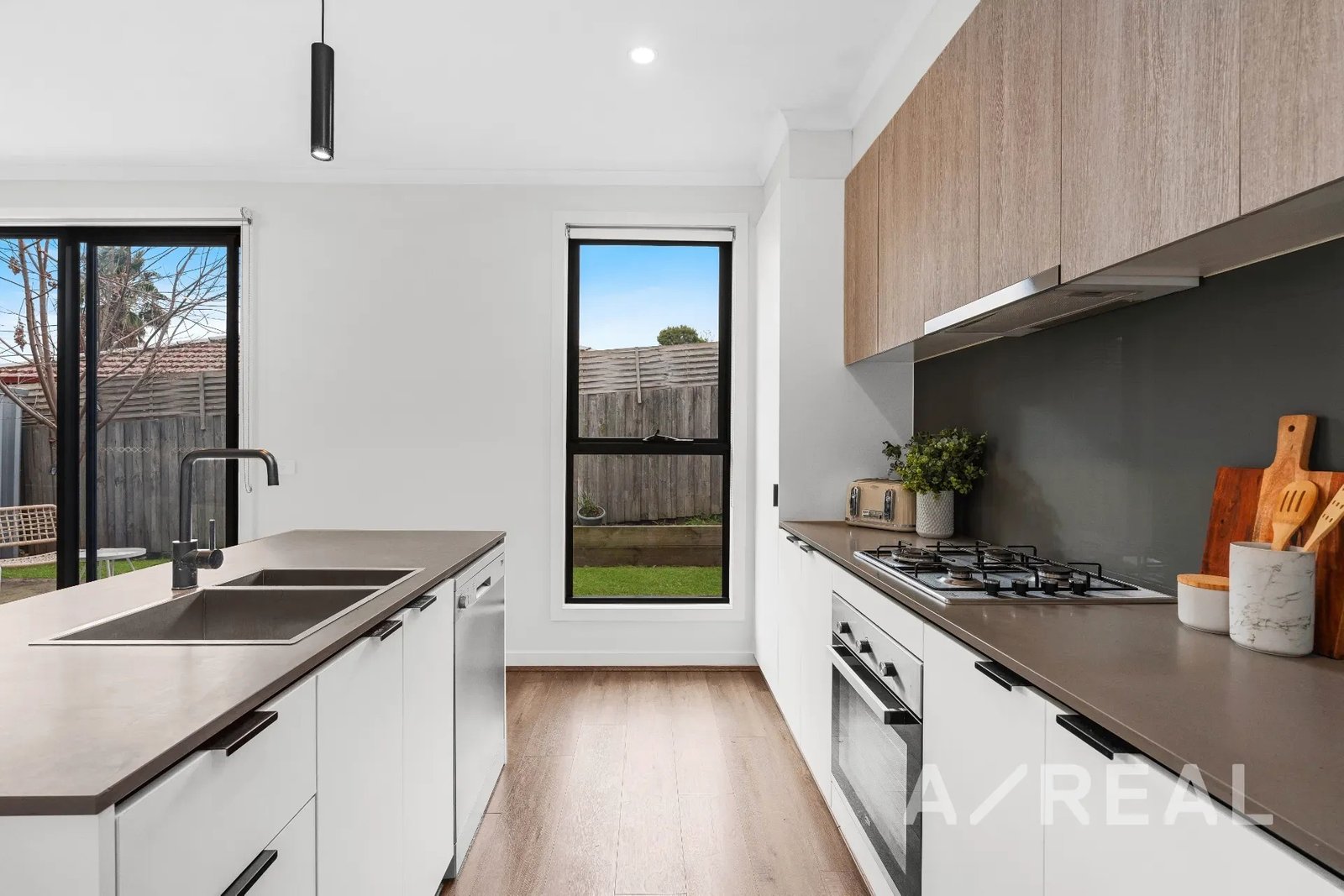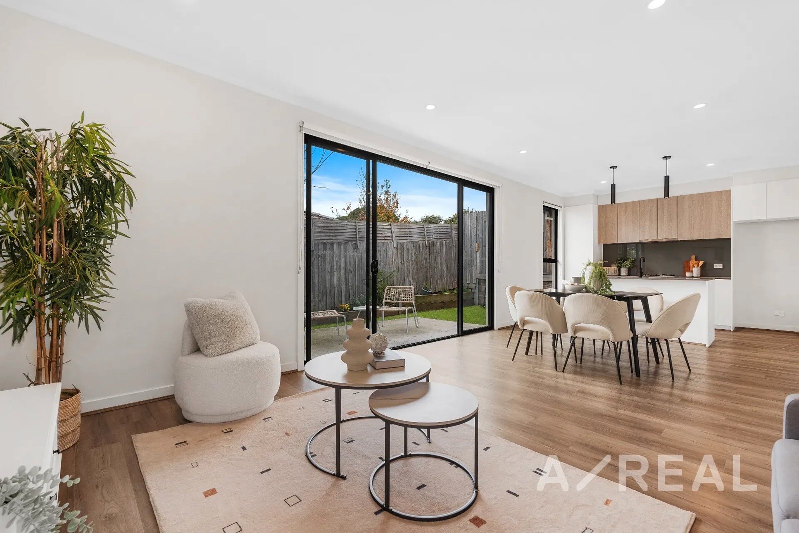 Welcomed by timber floors and oriented to capture saturating northern light, the open-plan living/dining zone is generously proportioned and accompanied by a sleek kitchen boasting stainless steel appliances, stone surfaces and handy island bench.