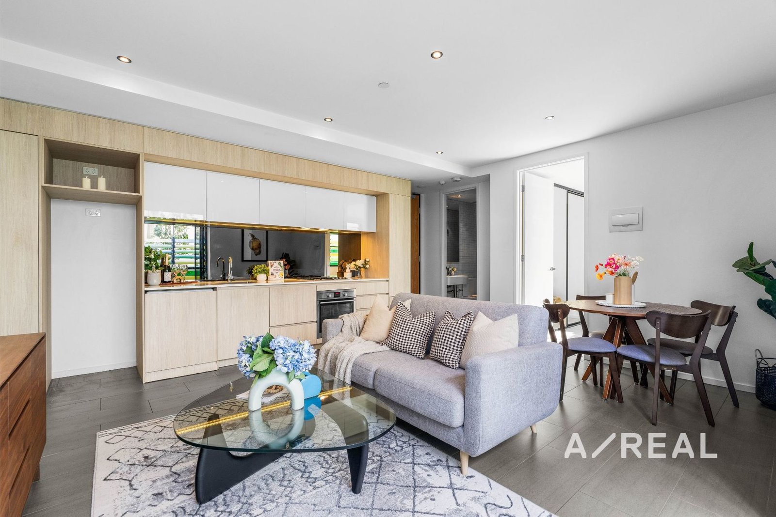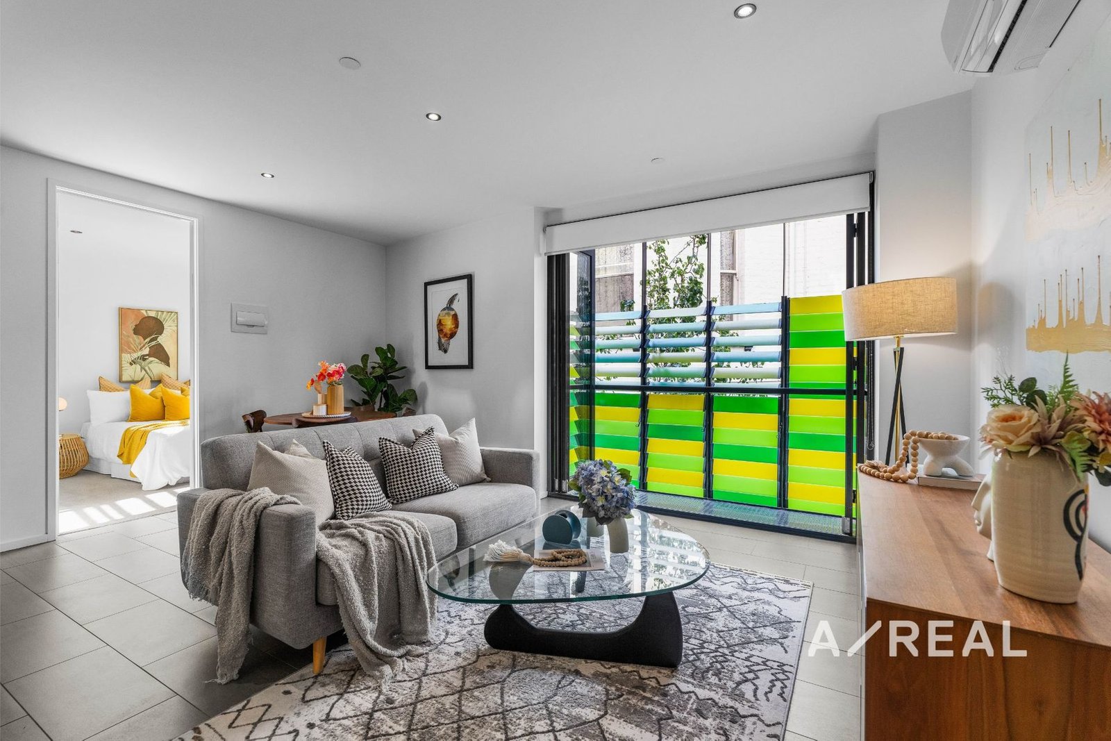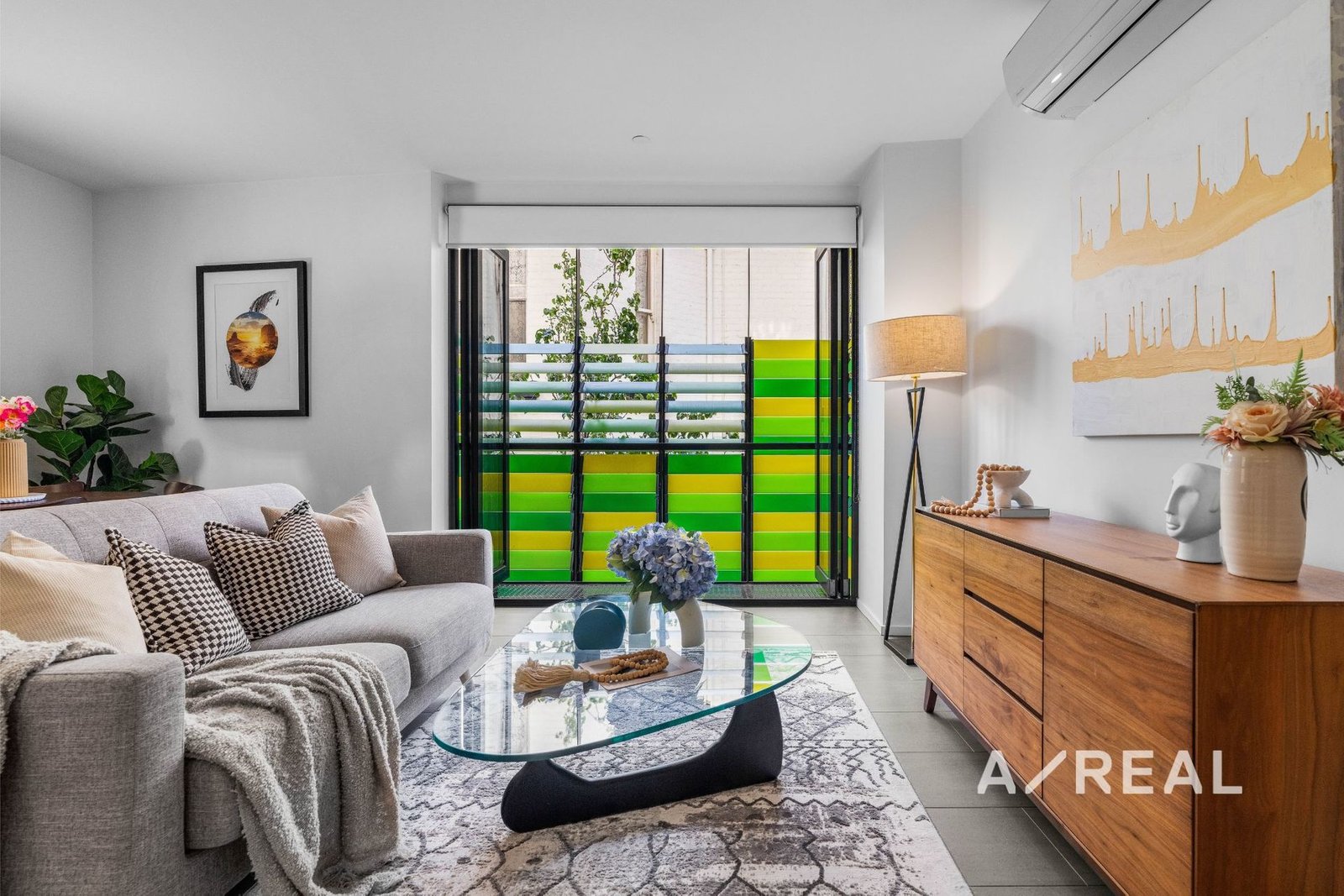 The open-plan design is filled with beautiful all-day sunlight, and is complemented by a striking stone-topped kitchen, balcony, bedroom with BIR, sleek bathroom and split system heating/AC.