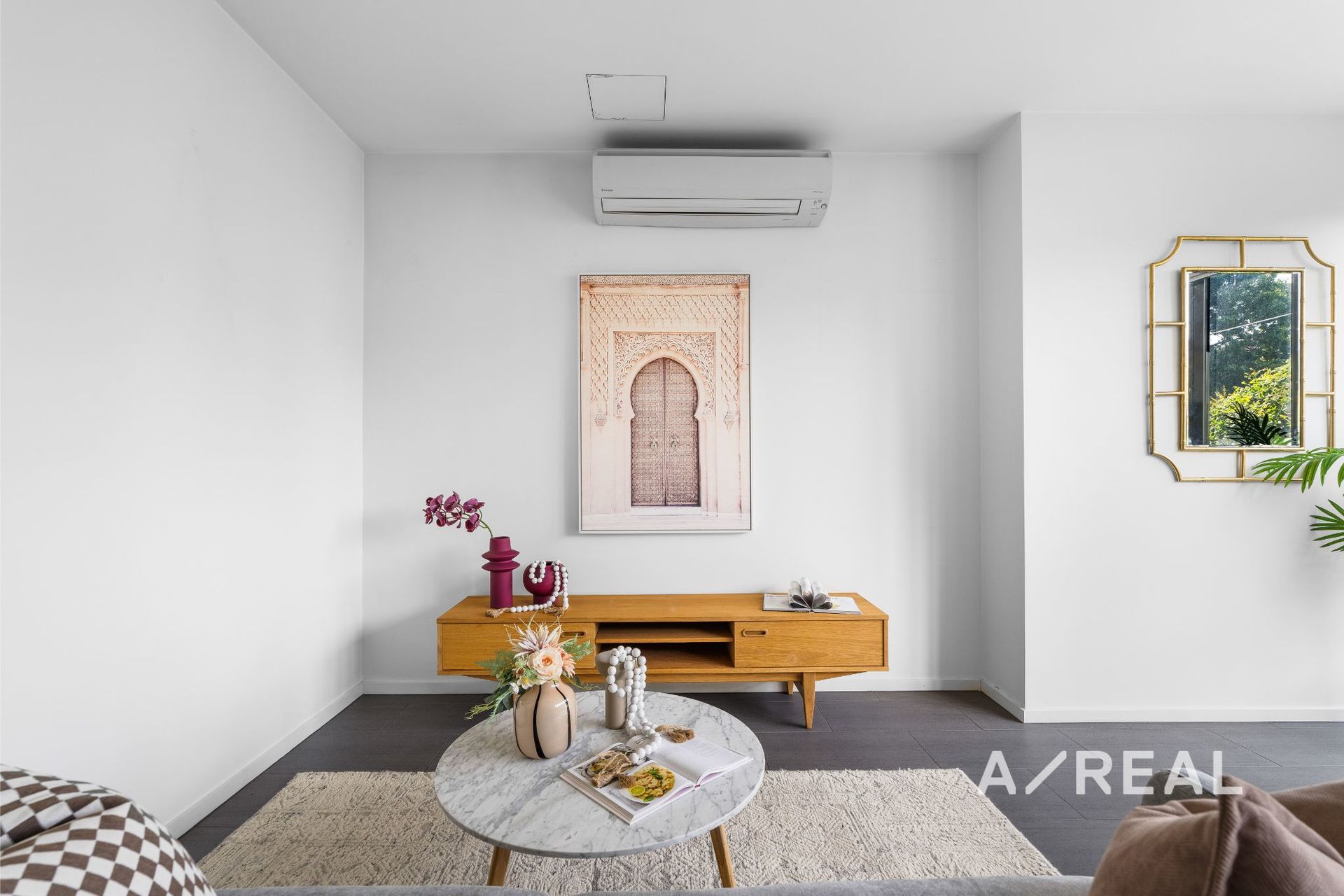 Welcomed by natural light and neutral tones, the open-plan living/dining environment incorporates a gourmet kitchen luxuriously appointed with stone benchtops and ample storage, while split system heating/AC ensures comfort.