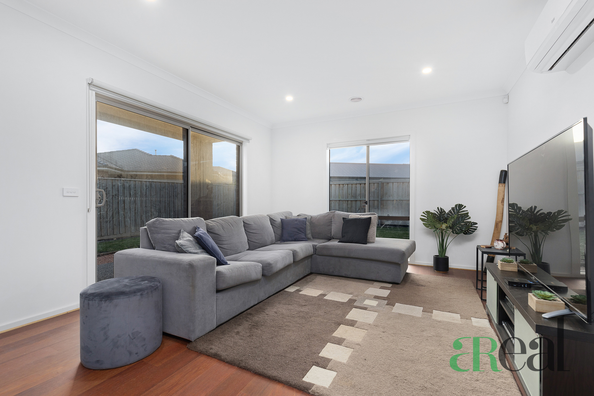 Light-filled living area with access through the glass sliding door to the yard, perfect for entertaining guests at a summer cookout.