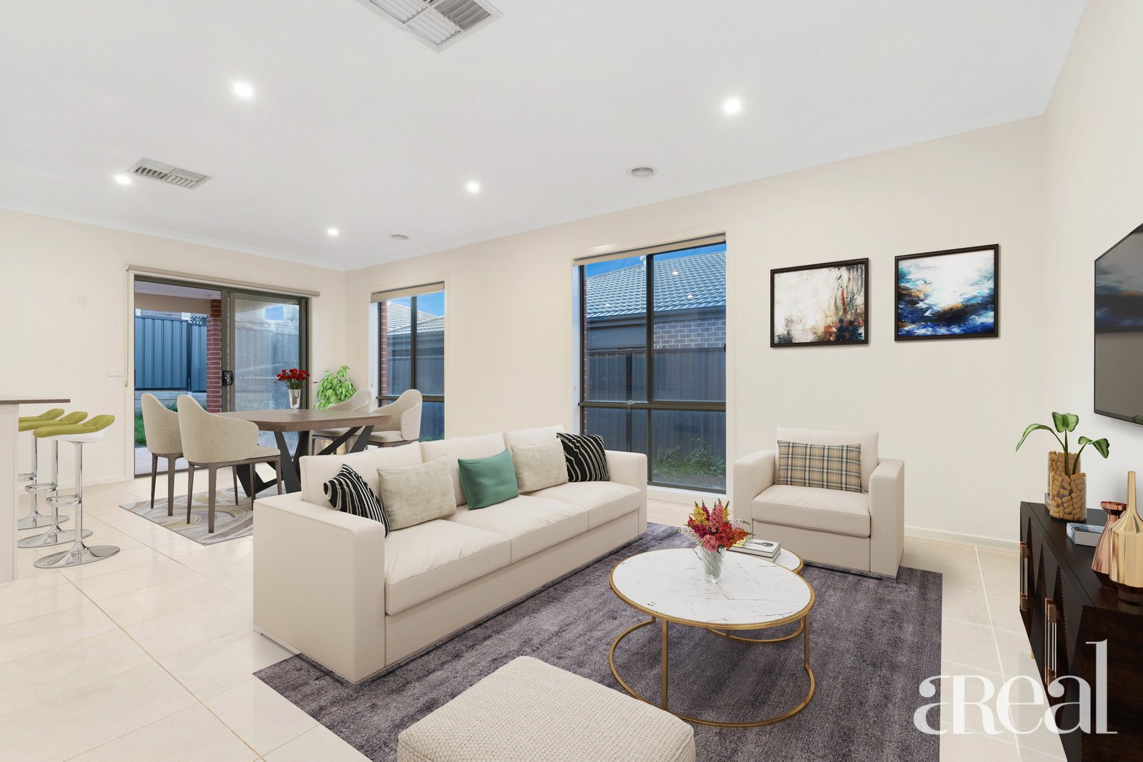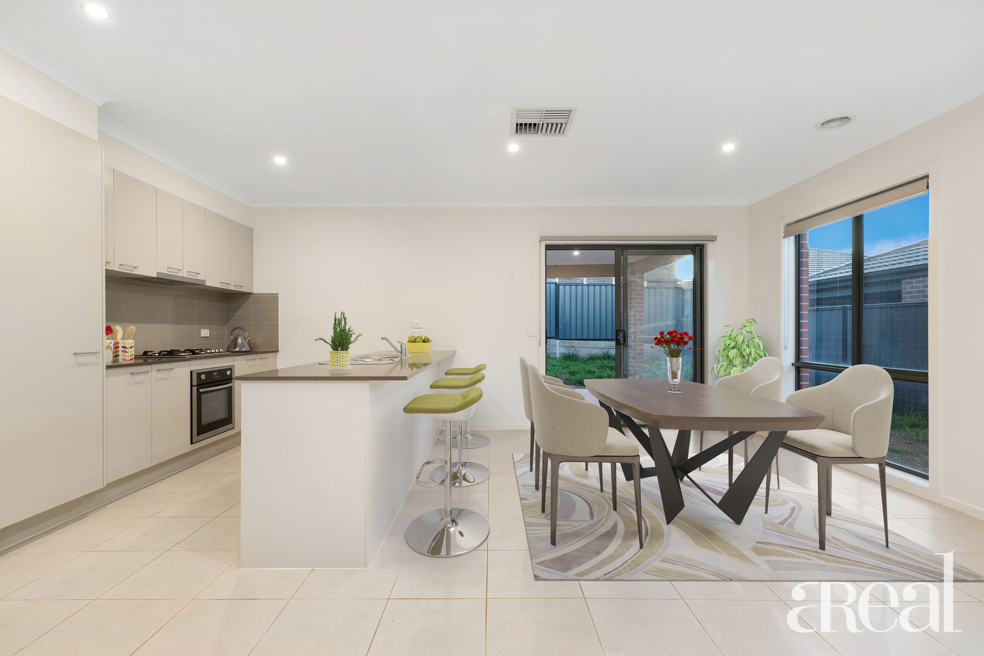 Light-filled living area with access through the glass sliding door to the yard, perfect for entertaining guests at a summer cookout.