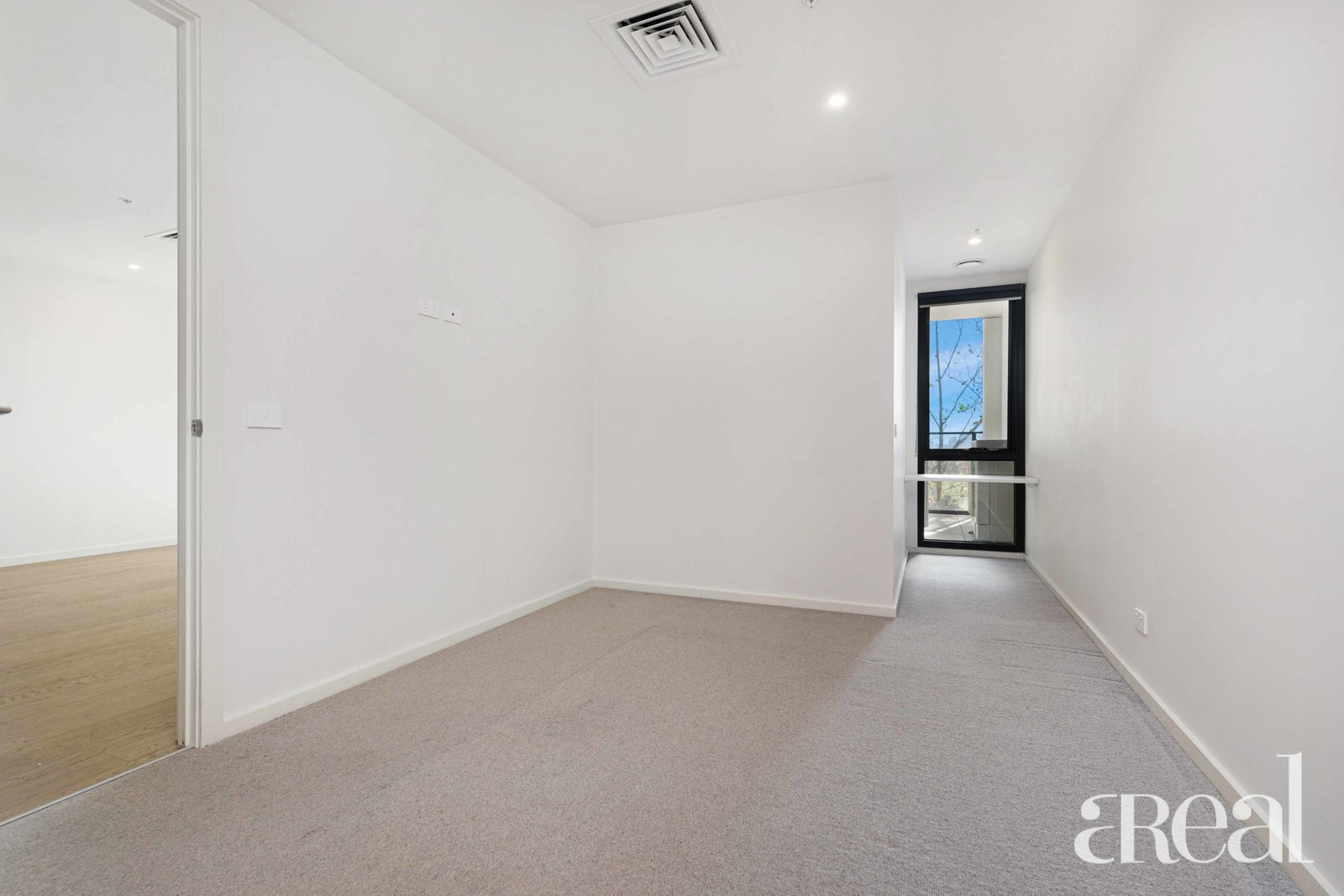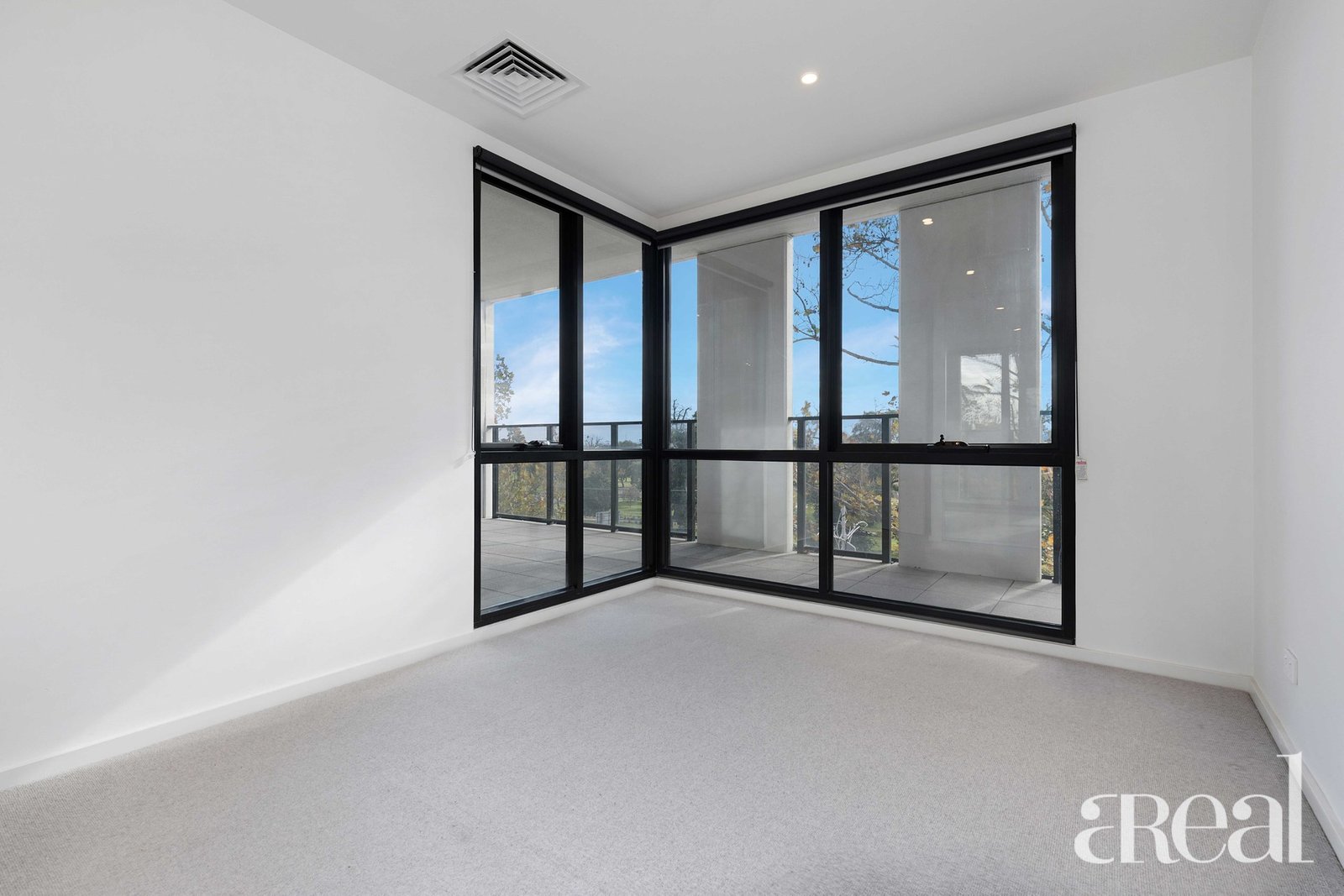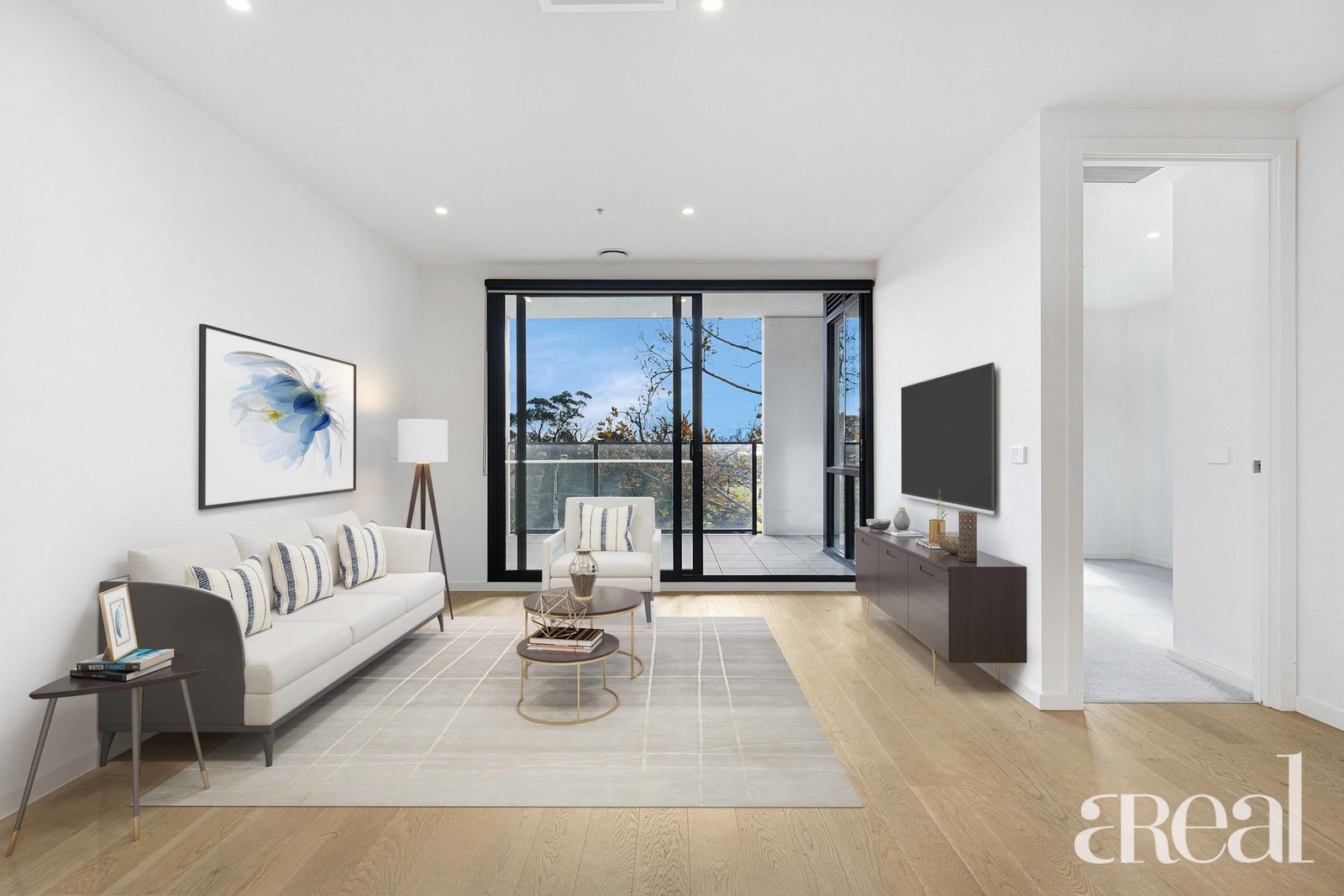 Light-filled living area with access through the glass sliding door to the sizeable balcony with amazing city skyline on one side and the bay on the other side.