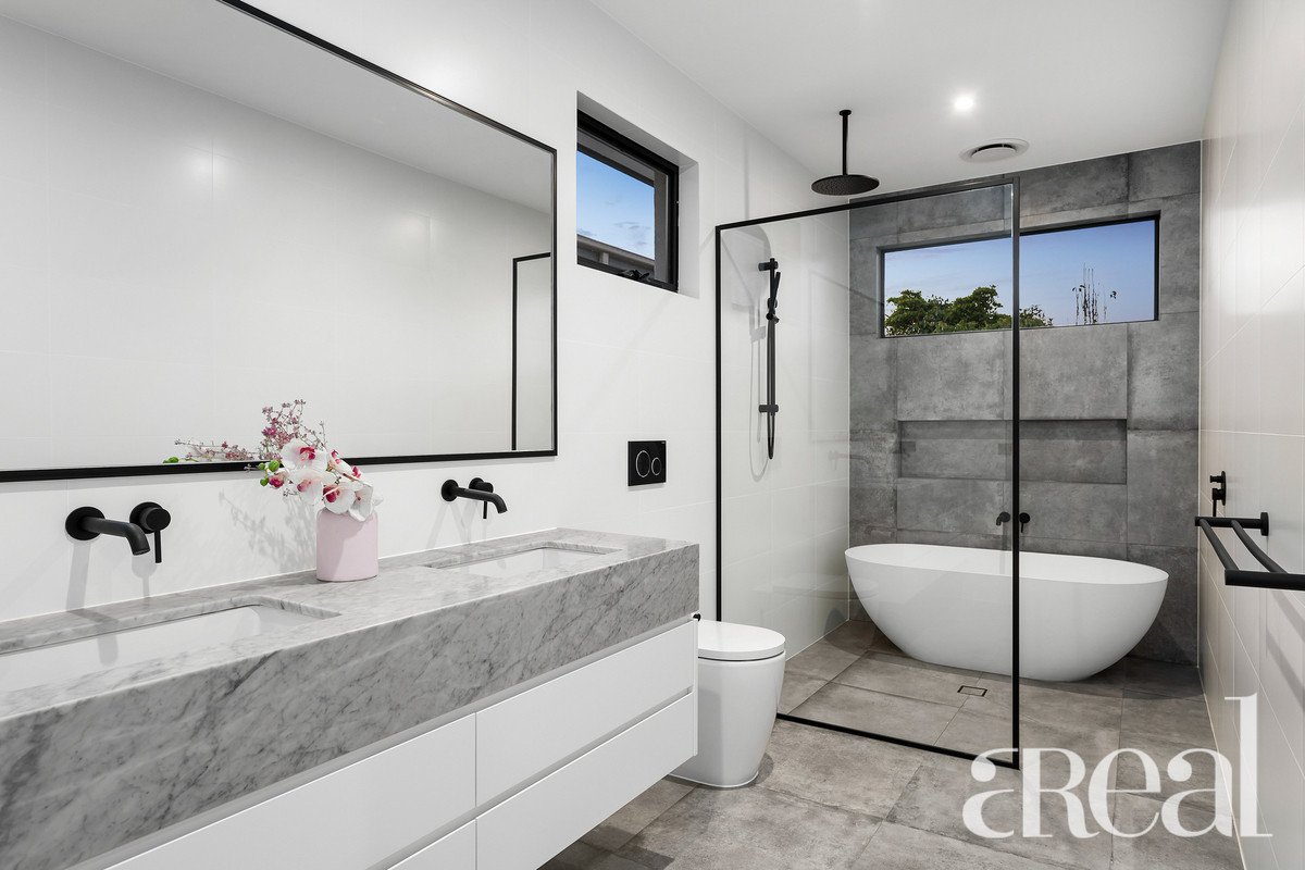 Near-new and crafted for seamless family living with 4 generously devised bedrooms, a teen retreat and 3 fully tiled designer bathrooms with Carrara marble topped, 2-pac vanity boasting rainfall shower and on-trend black matte tapware. All bedrooms enjoy ensuite/semi-ensuite access, including a luxe ground floor and upper master suite; grand master displaying a huge WIR, dual basin vanity, soaker bath. The family bathroom mirrors this opulence with oversized double basin vanity.