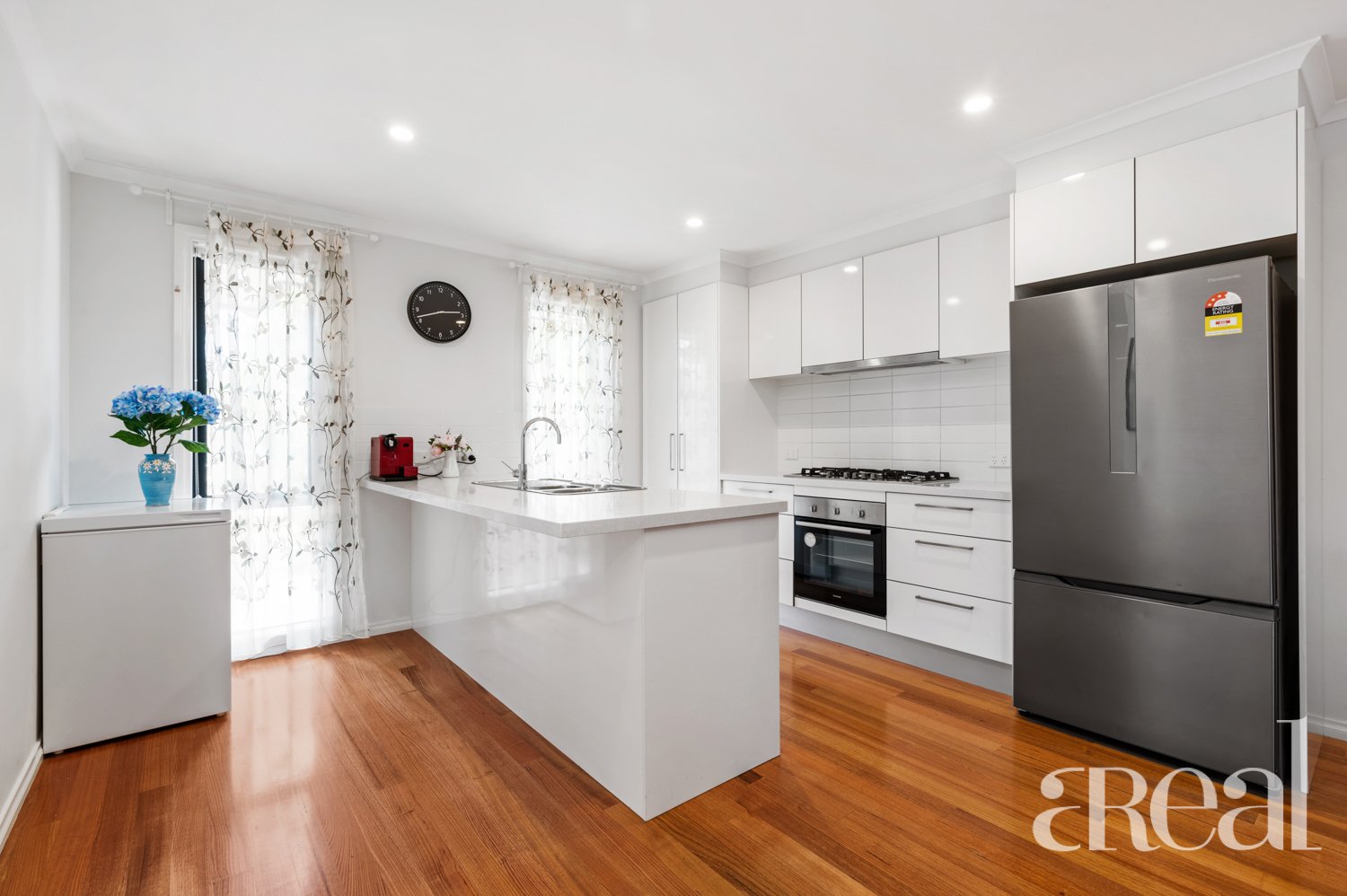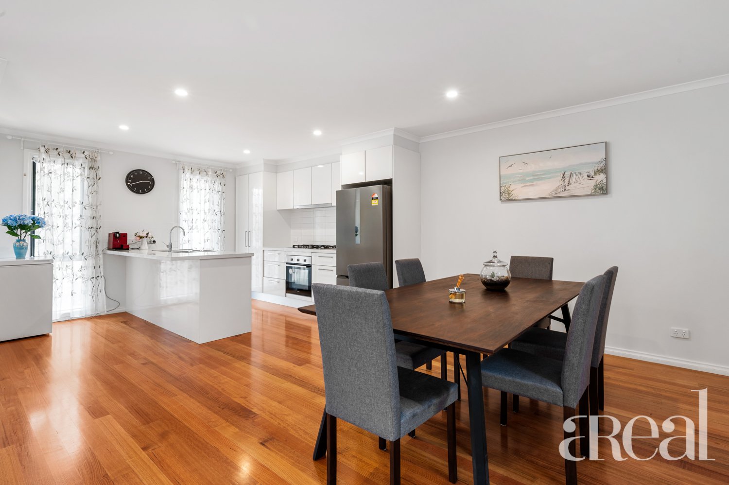 Gleaming timber floors are on show throughout the air-conditioned and open-plan kitchen, dining and living space. Here, you can relax with loved ones in year-round comfort or cook up a storm in the chef's kitchen with stainless steel appliances, a breakfast bar and a tiled backsplash.