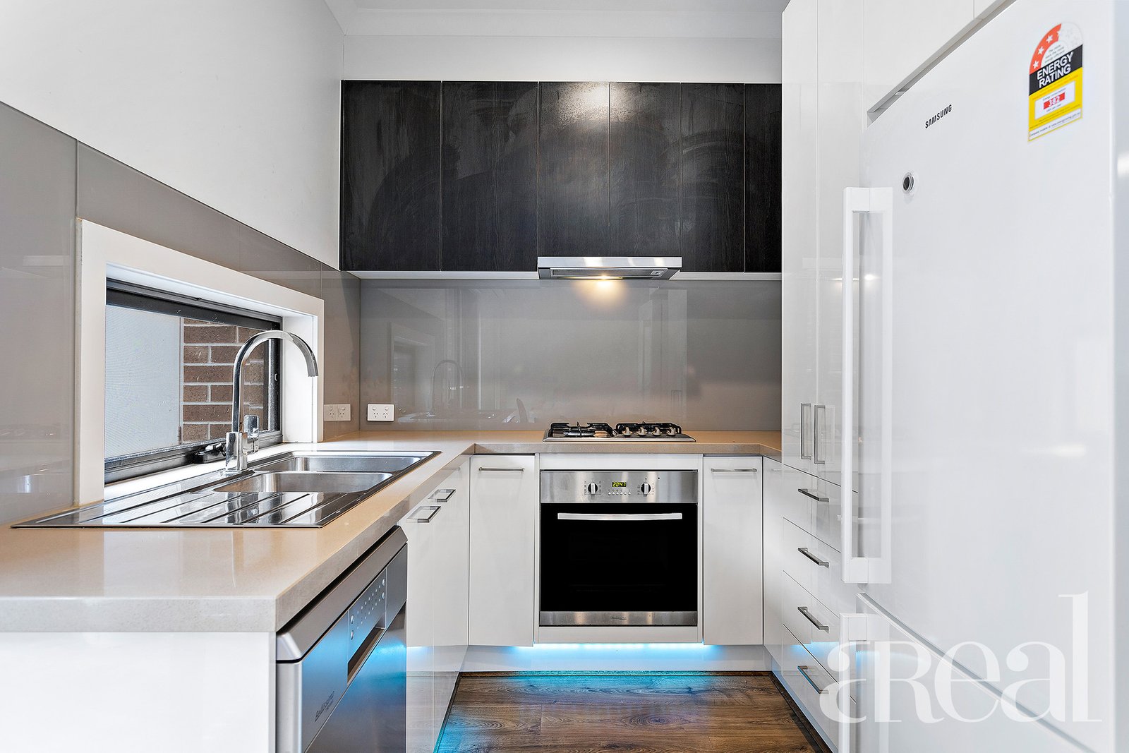 Stainless steel appliances are yours to enjoy in the kitchen, including a dishwasher and a gas cooktop, plus there's a good-size pantry and sleek white cabinetry. A window behind the sinks offers views over the outdoor area and there's LED feature lighting for that sleek modern feel.
