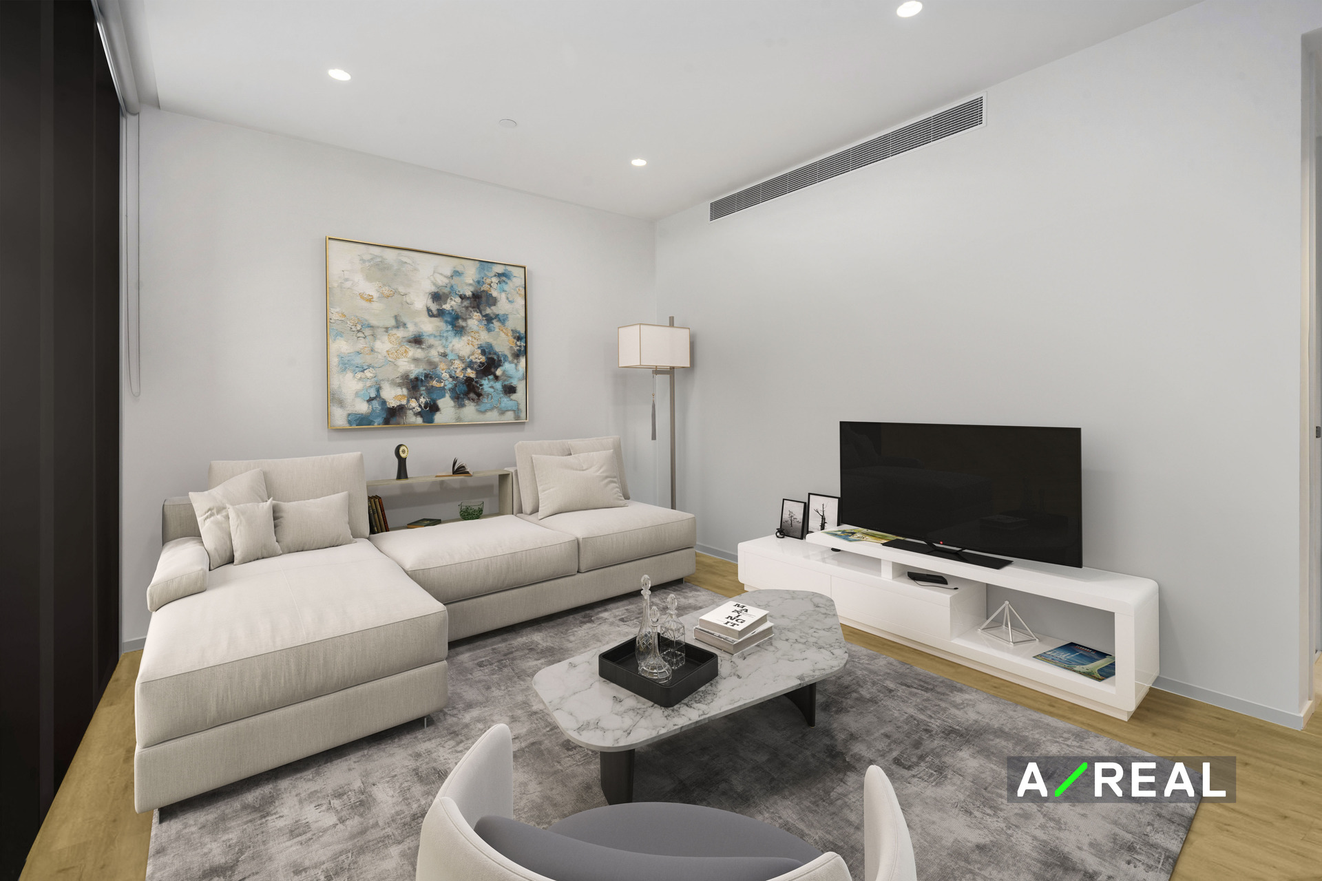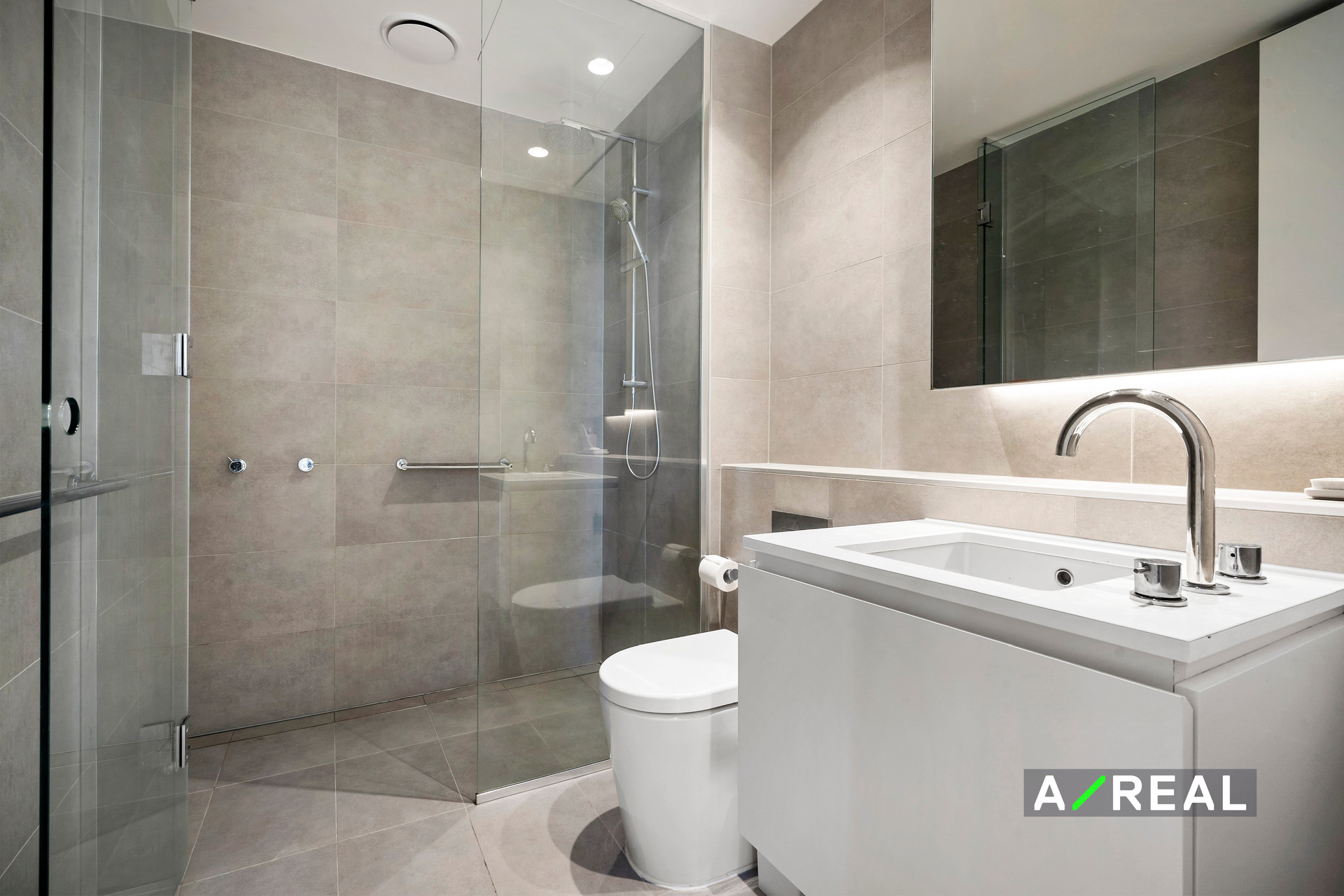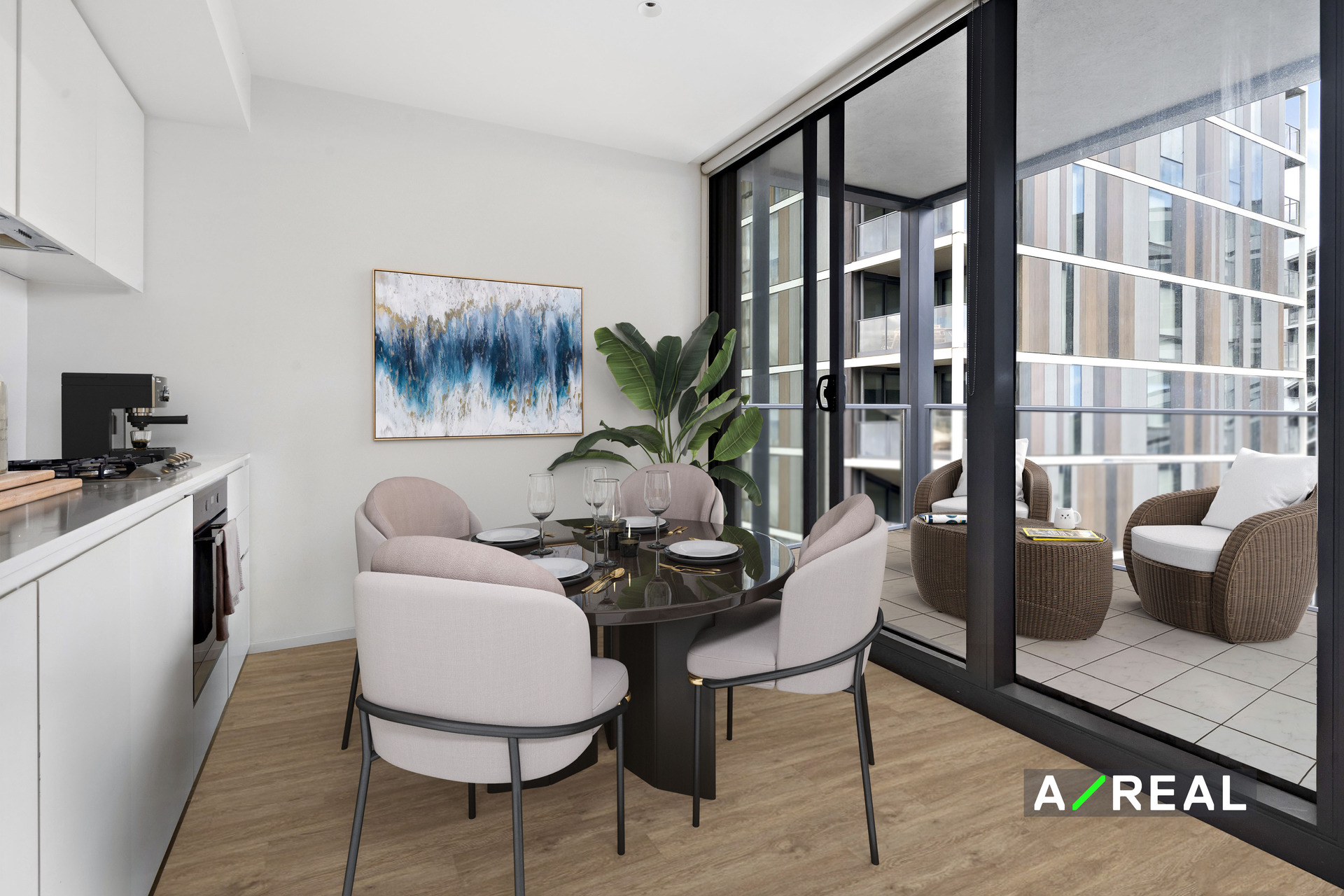 Floor-to-ceiling panels of glass draw soft natural light into the open-plan kitchen, meals and living room where you can kick back and relax after a day spent exploring the city. On-trend wide-plank flooring runs underfoot throughout including in the sleek kitchen with all-white cabinets and a suite of quality appliances including a gas cooktop.