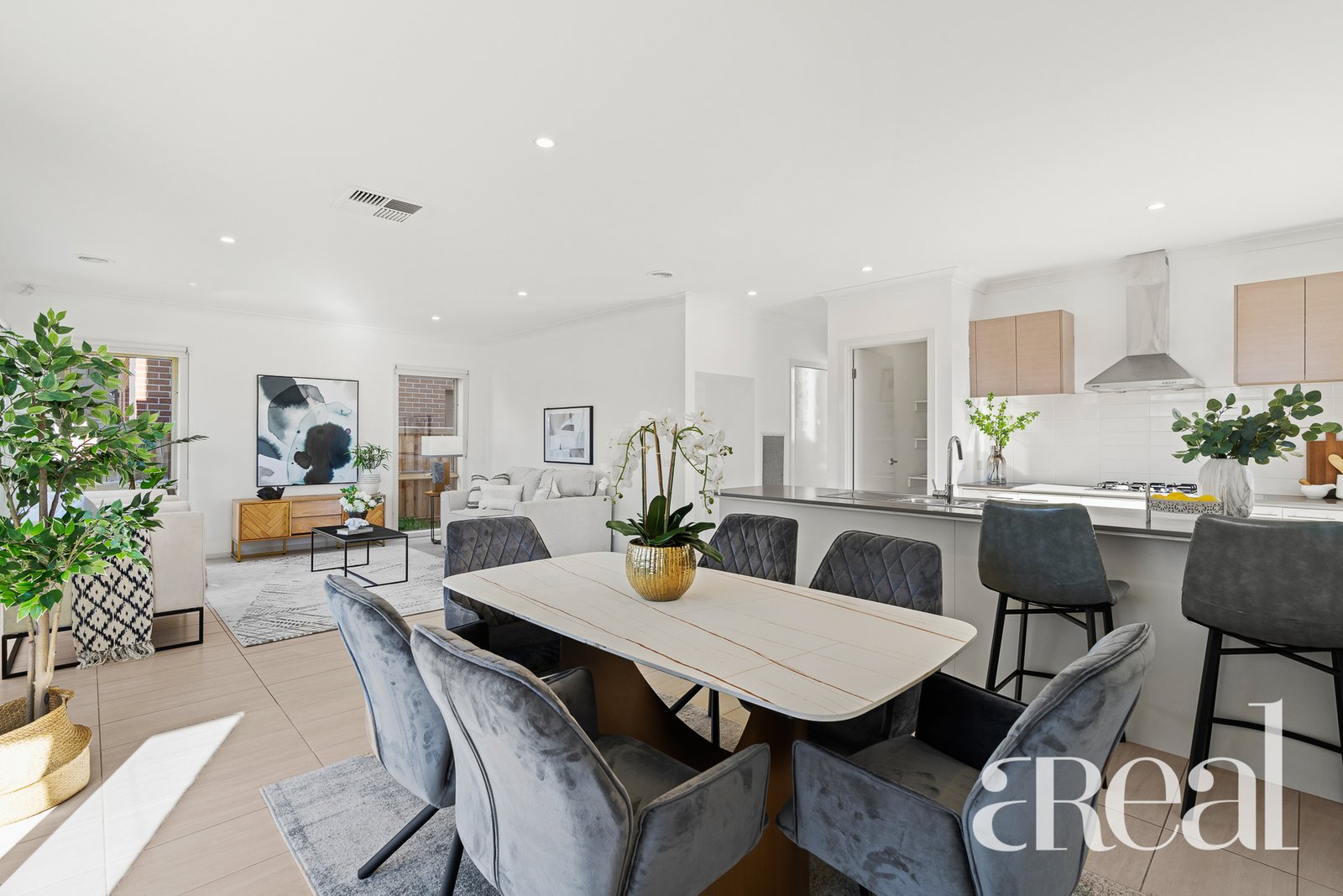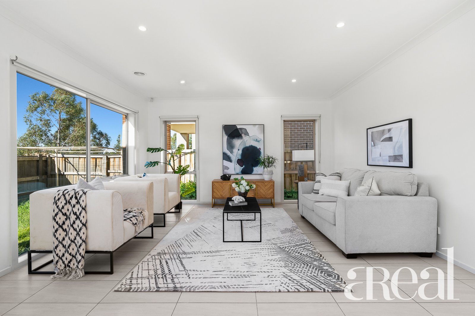 The main level is home to the primary living spaces including the living room, a study and an open-plan kitchen, dining and family room. Large-format tiles flow underfoot while the oversized windows draw in natural light and frame views over the fully fenced backyard.