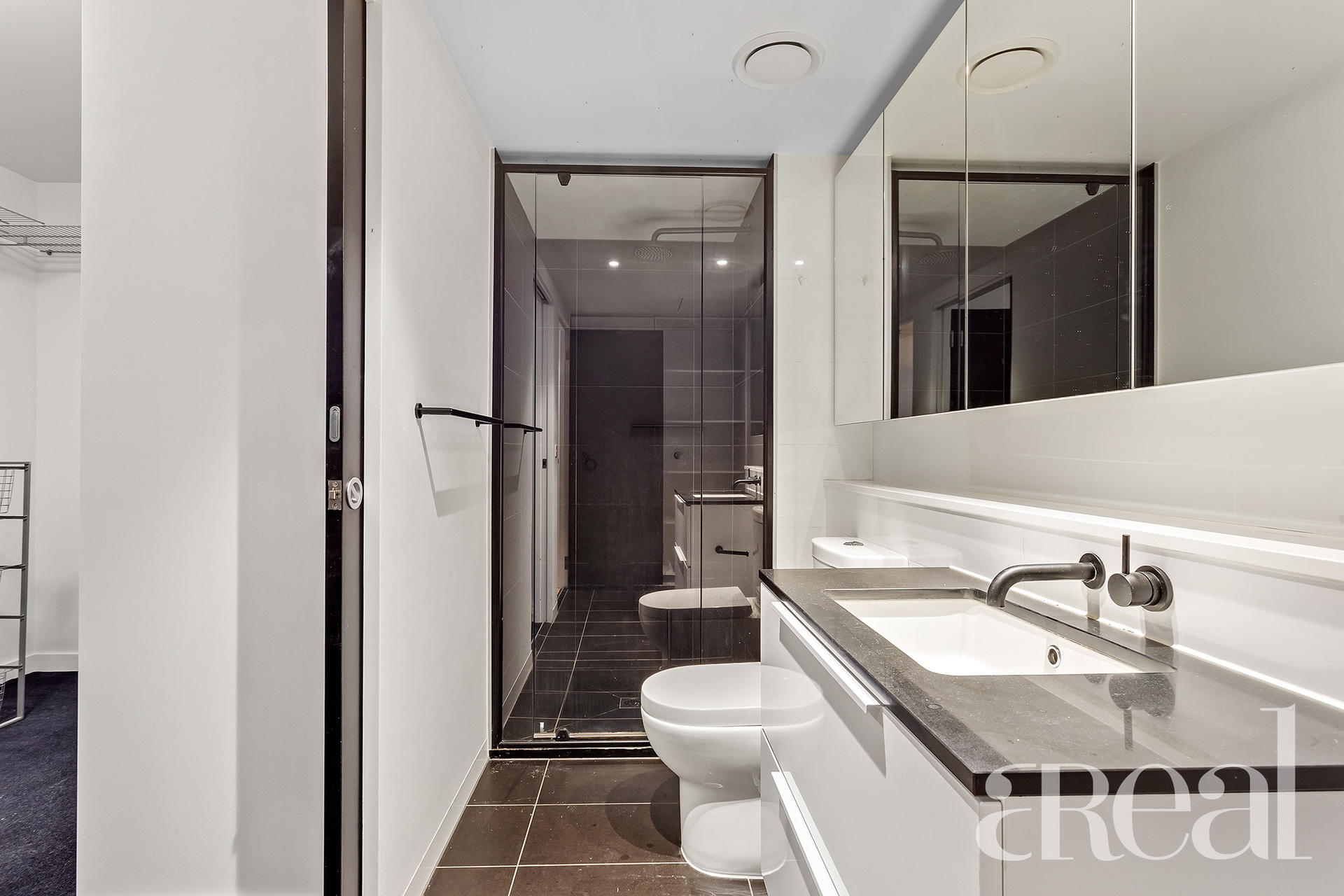 From the gourmet kitchen, you can overlook the living and dining area with a glass sliding door that leads out to the covered entertainer's balcony. Sleek white cabinetry, stone benchtops and elegant black fixtures add instant appeal to this contemporary chef's haven along with the on-trend flooring, mirrored backsplash and suite of stainless steel appliances.