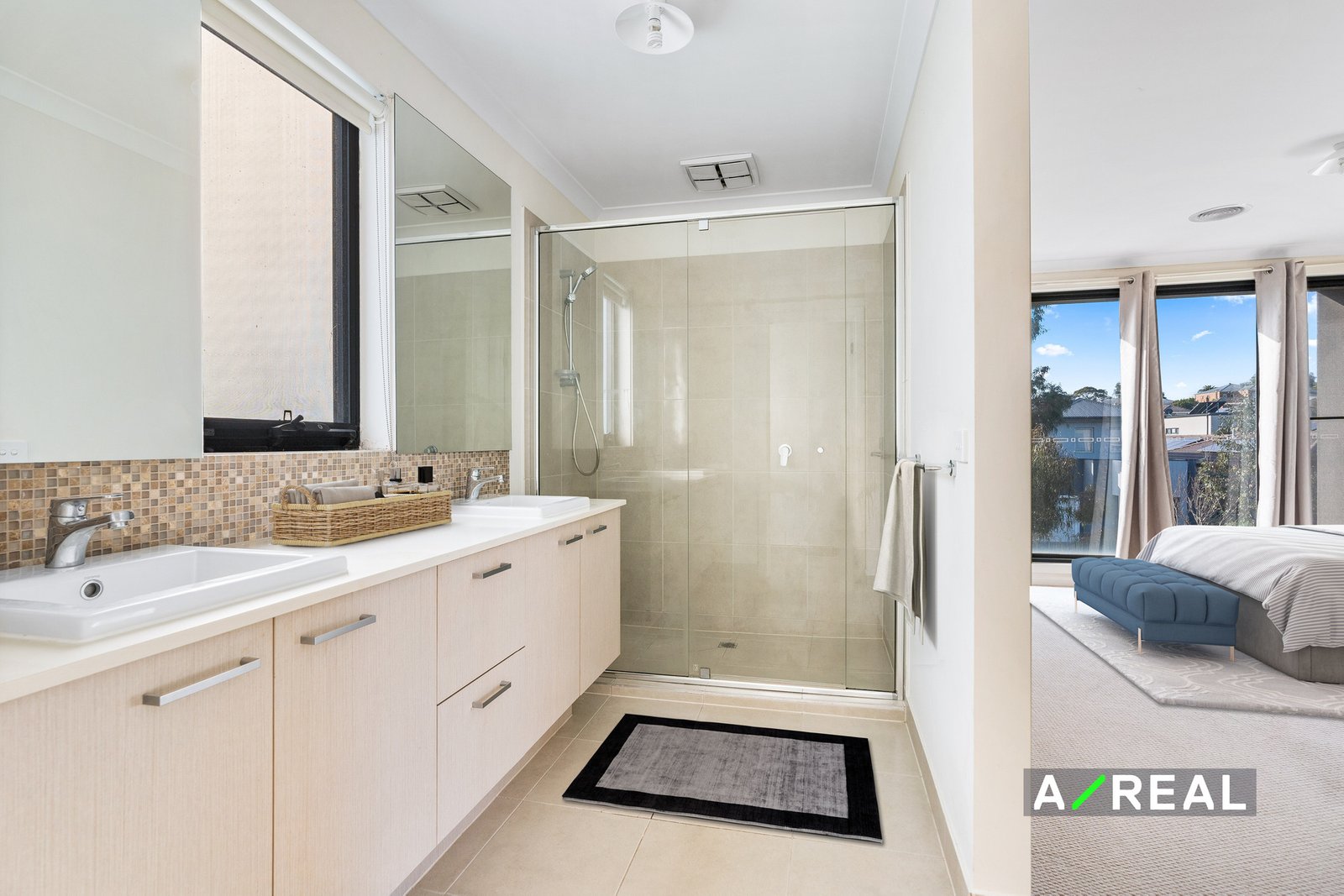 On the upper level, we find another living area or teenage retreat and four bedrooms. There are three family bedrooms all with built-ins and a large bathroom with plenty of space to get ready, a separate bathtub, frameless shower, and a detached toilet so that everyone has privacy. The master bedroom has two walk-in wardrobes set on either side of the suite and an ensuite with double vanity.