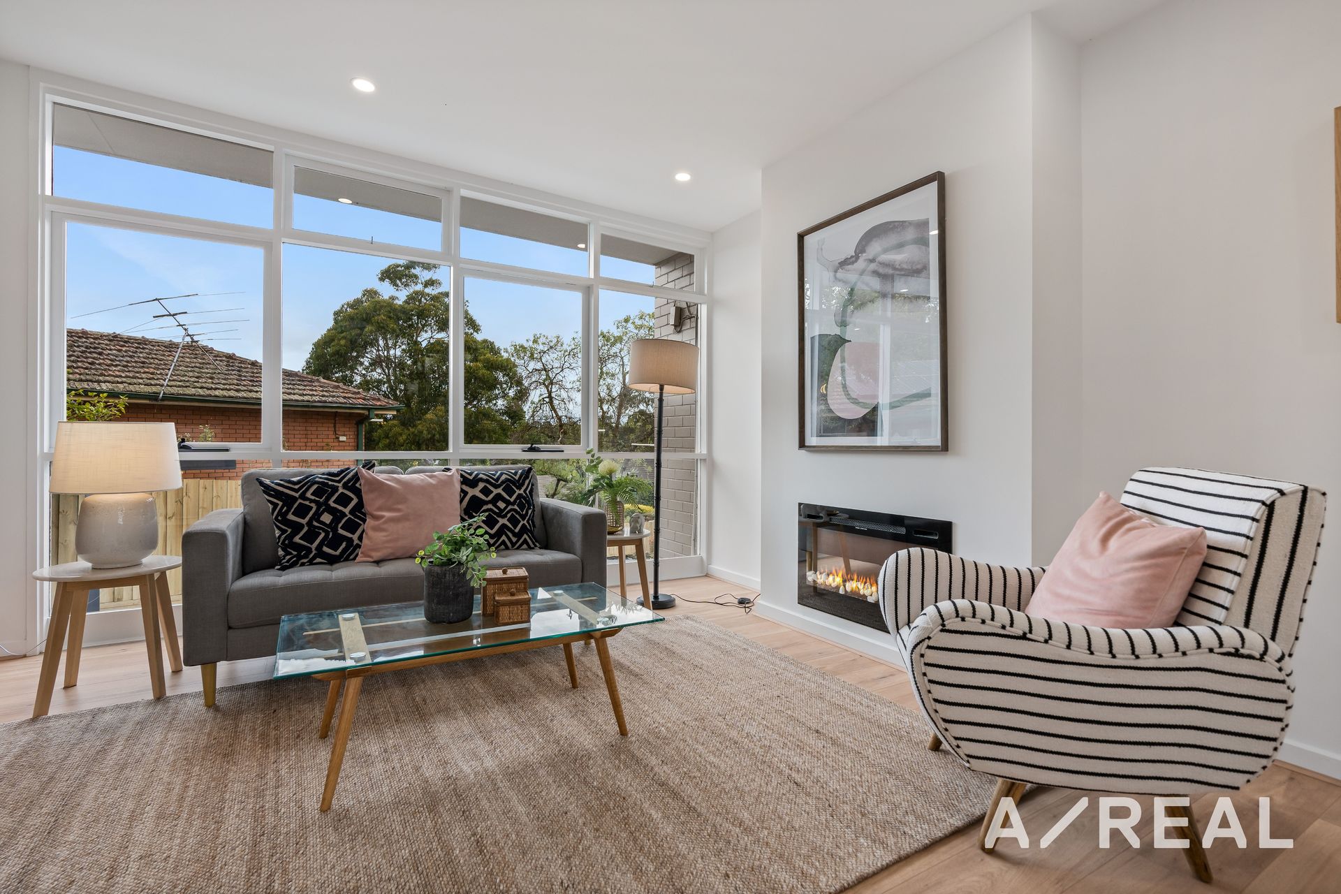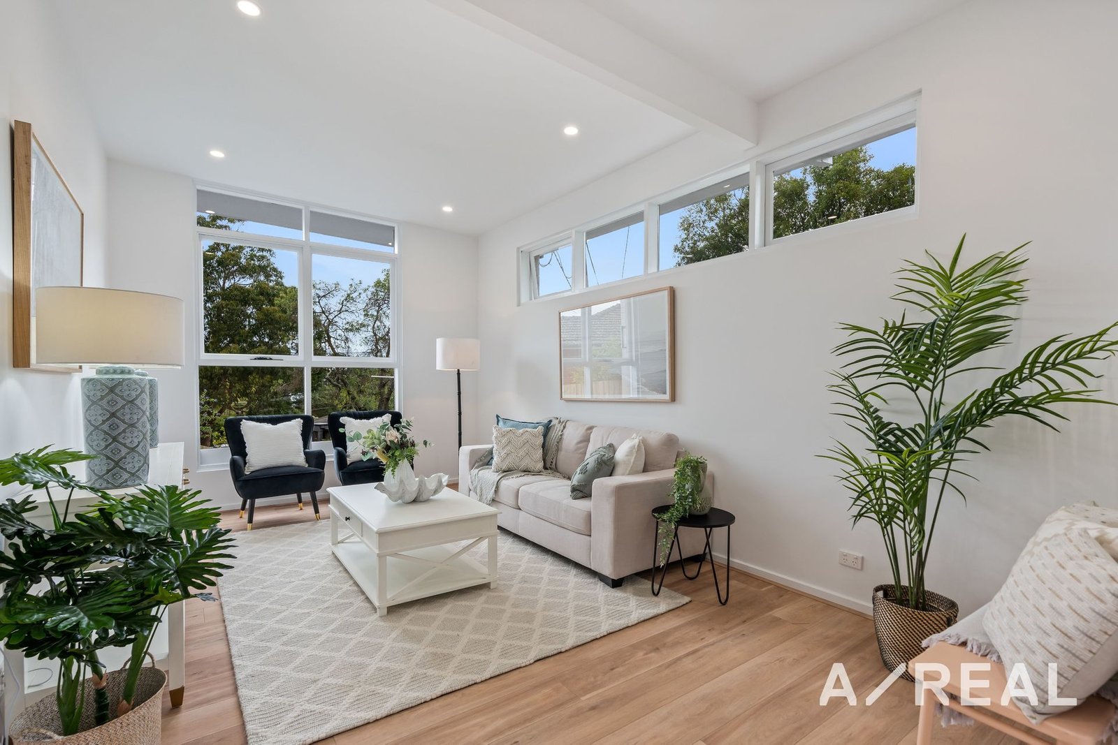 A separate living room is set just off the entry with a tall ceiling and oversized windows that draw in natural light without compromising on privacy.