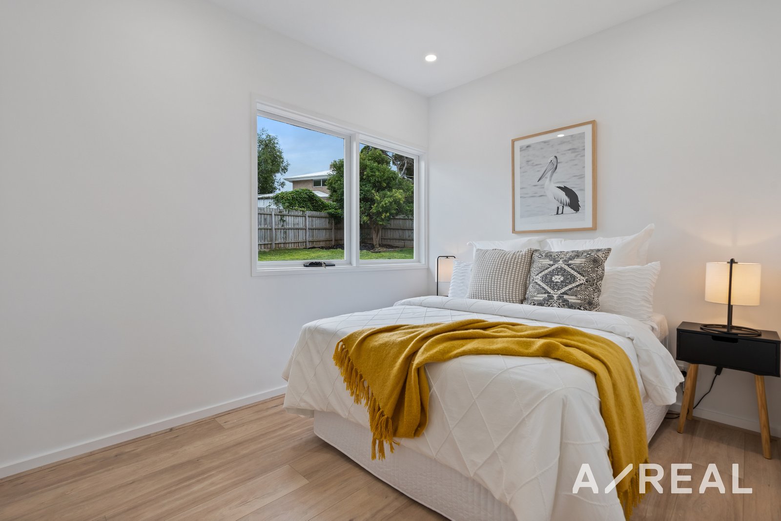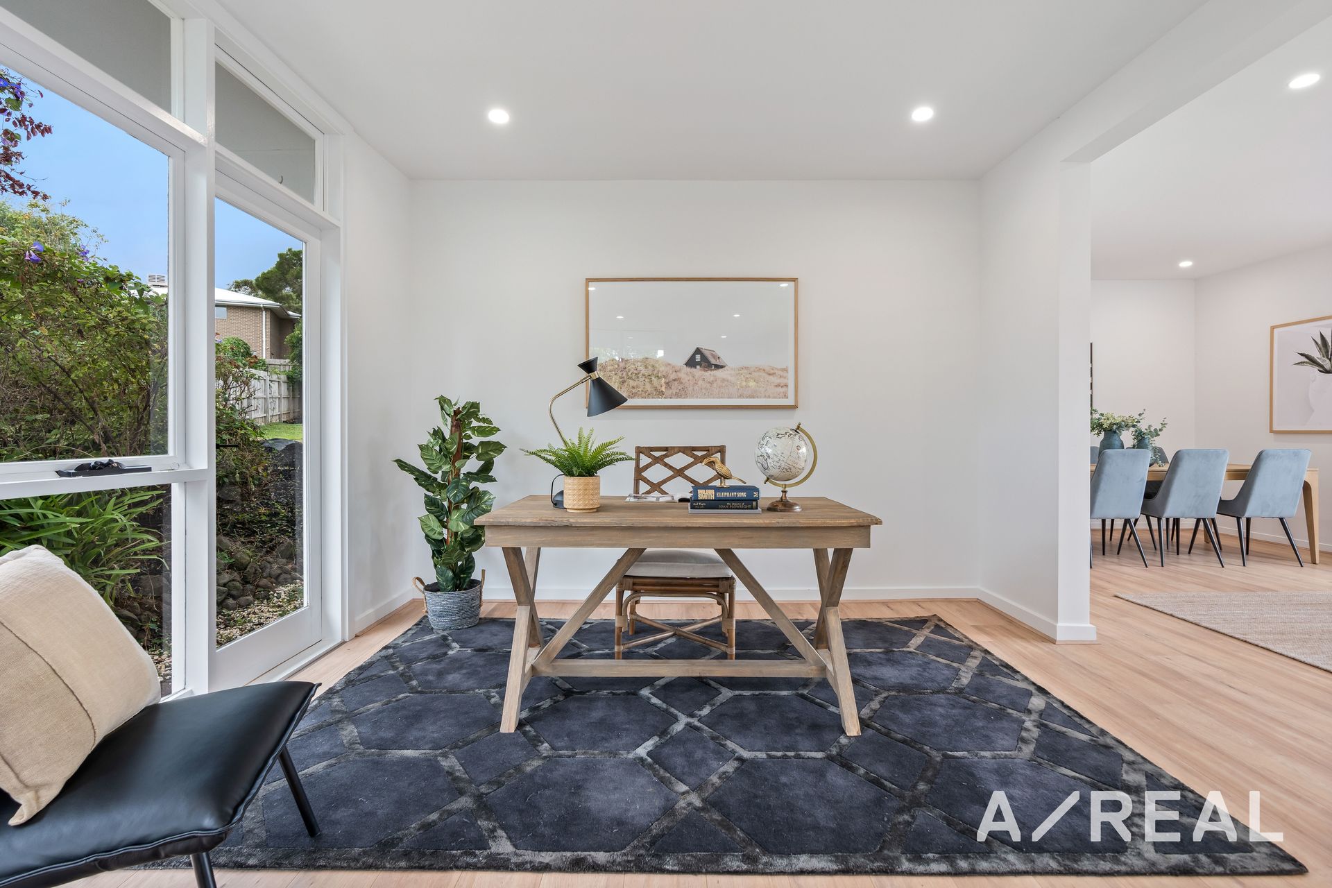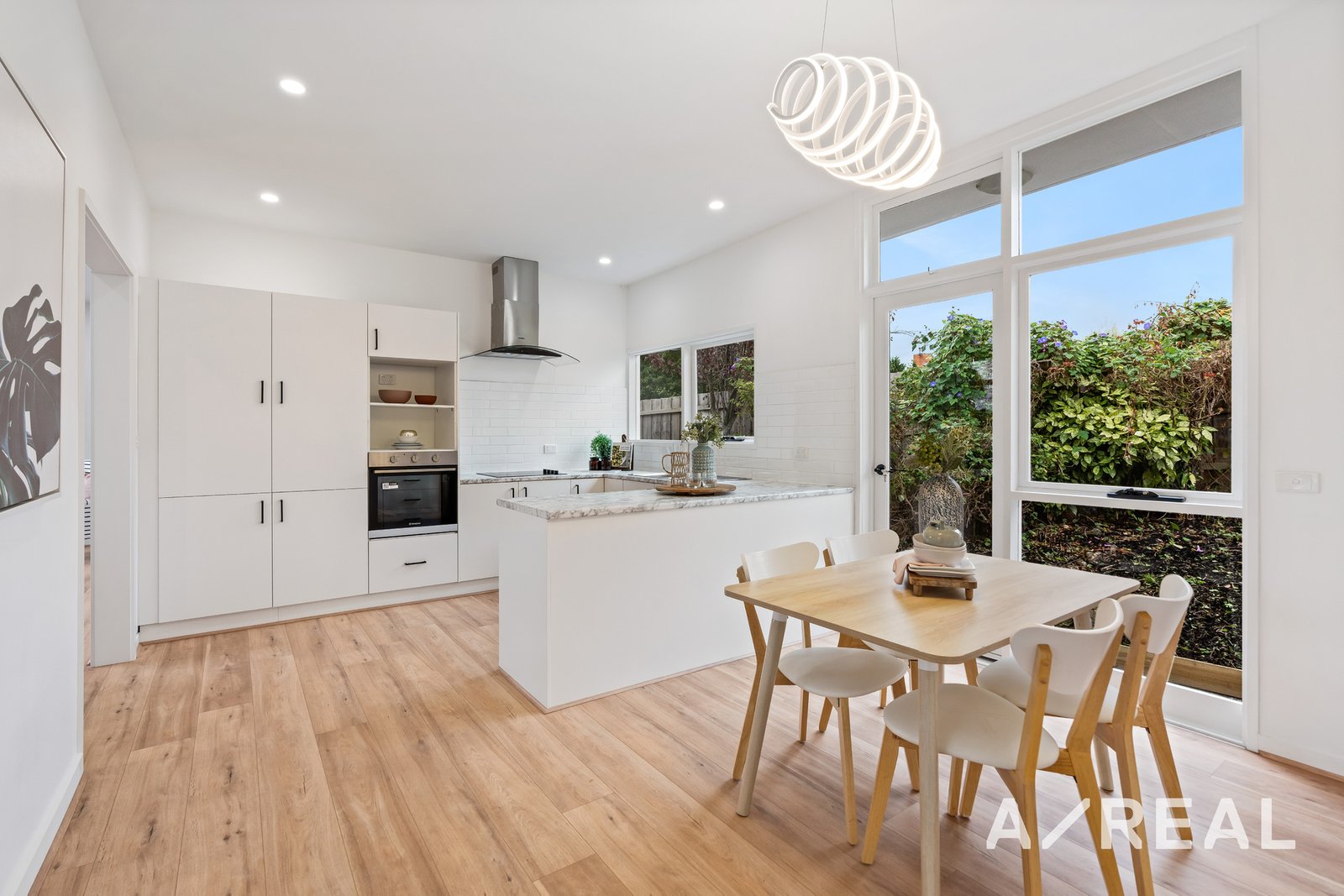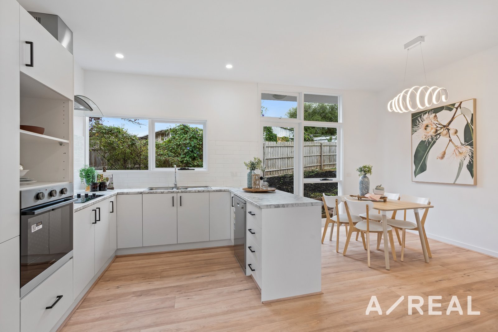 The floorplan has been designed around the central kitchen with stainless steel appliances for the eager cook along with sweeping benchtops, a tiled backsplash and plenty of storage. On-trend wide-plank flooring flows underfoot and continues into the meals area along with the open-plan study, family room and dining area complete with a fireplace.