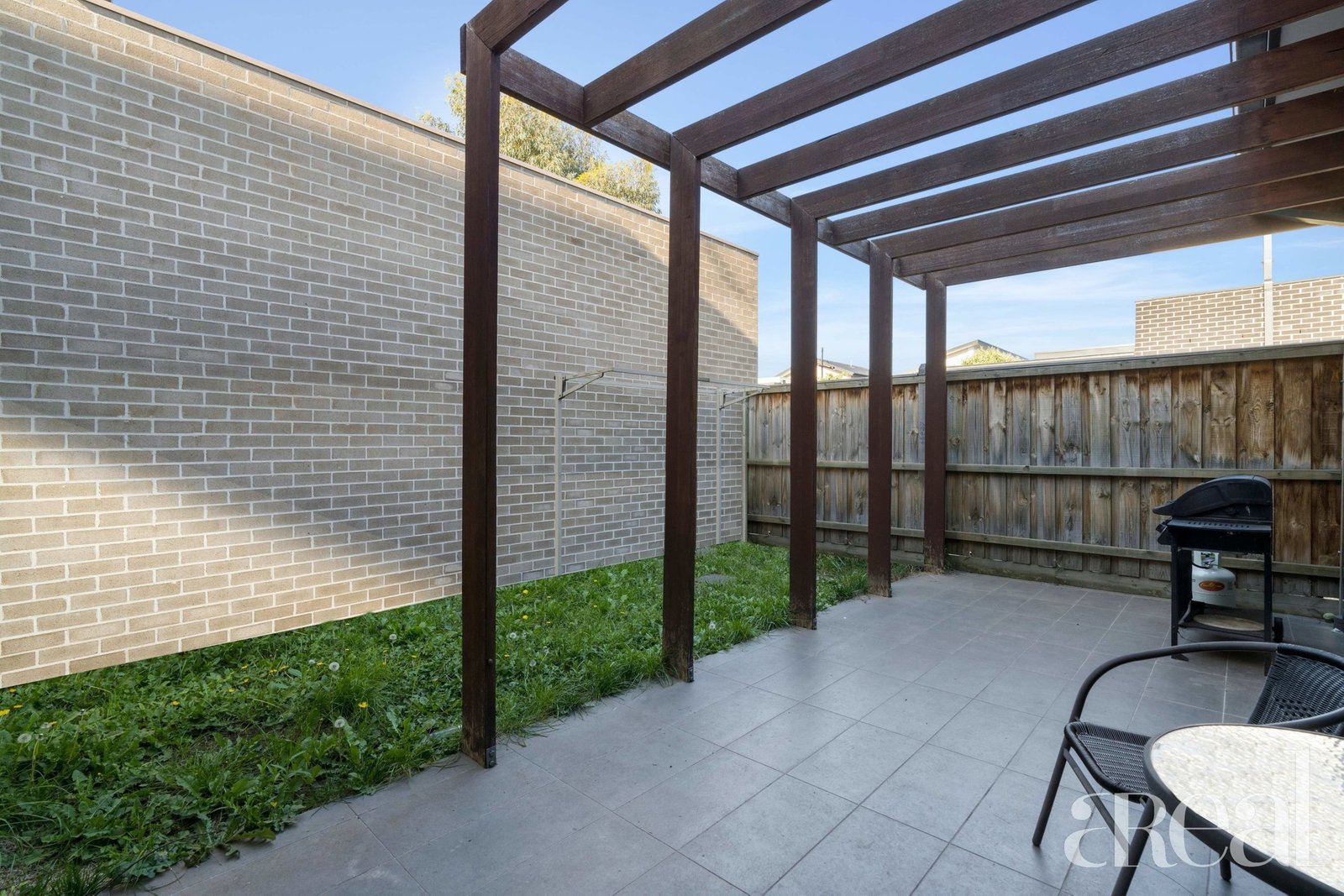 A rear patio is nestled in the private and fenced backyard with a pergola and plenty of space to entertain guests or indulge in a delicious dinner under the stars.