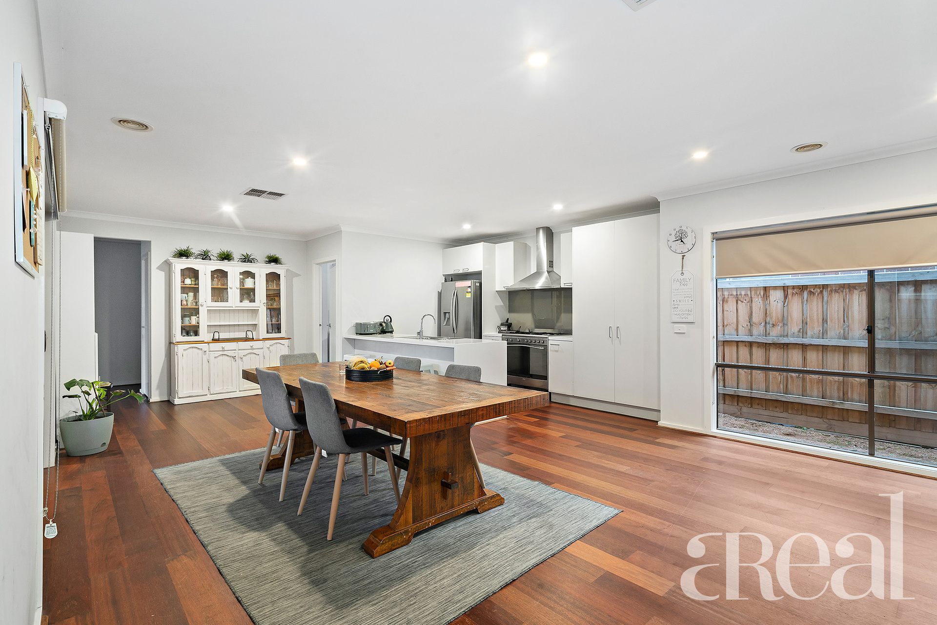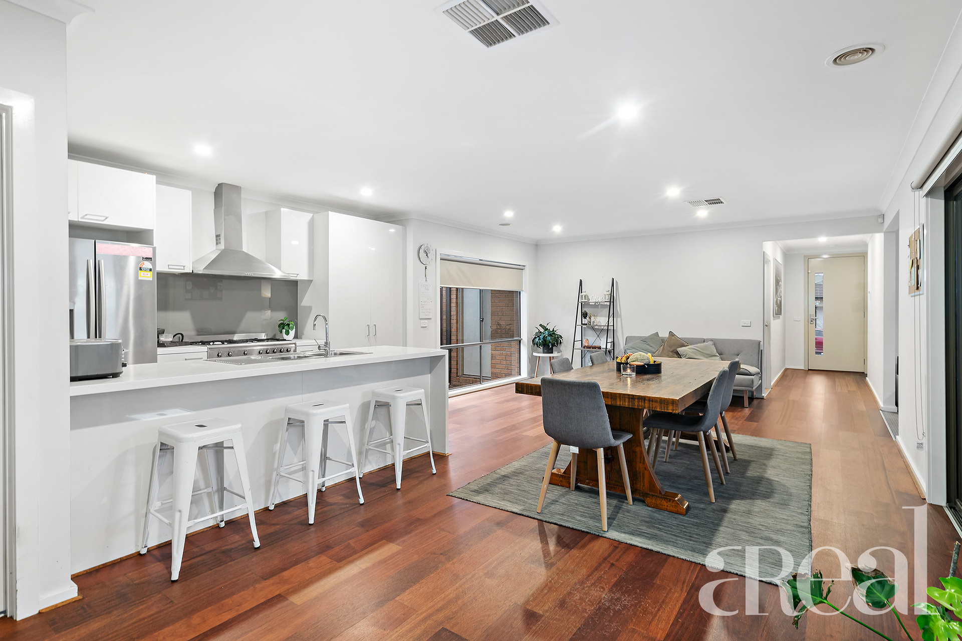 Depending on the occasion, you can spread out and relax in the open-plan kitchen, meals and family zone or gather with loved ones in the light-filled living room. The all-white kitchen feels sleek and stylish with a waterfall-edge benchtop, stainless steel appliances, gleaming white cabinets, a dishwasher and a breakfast bar.