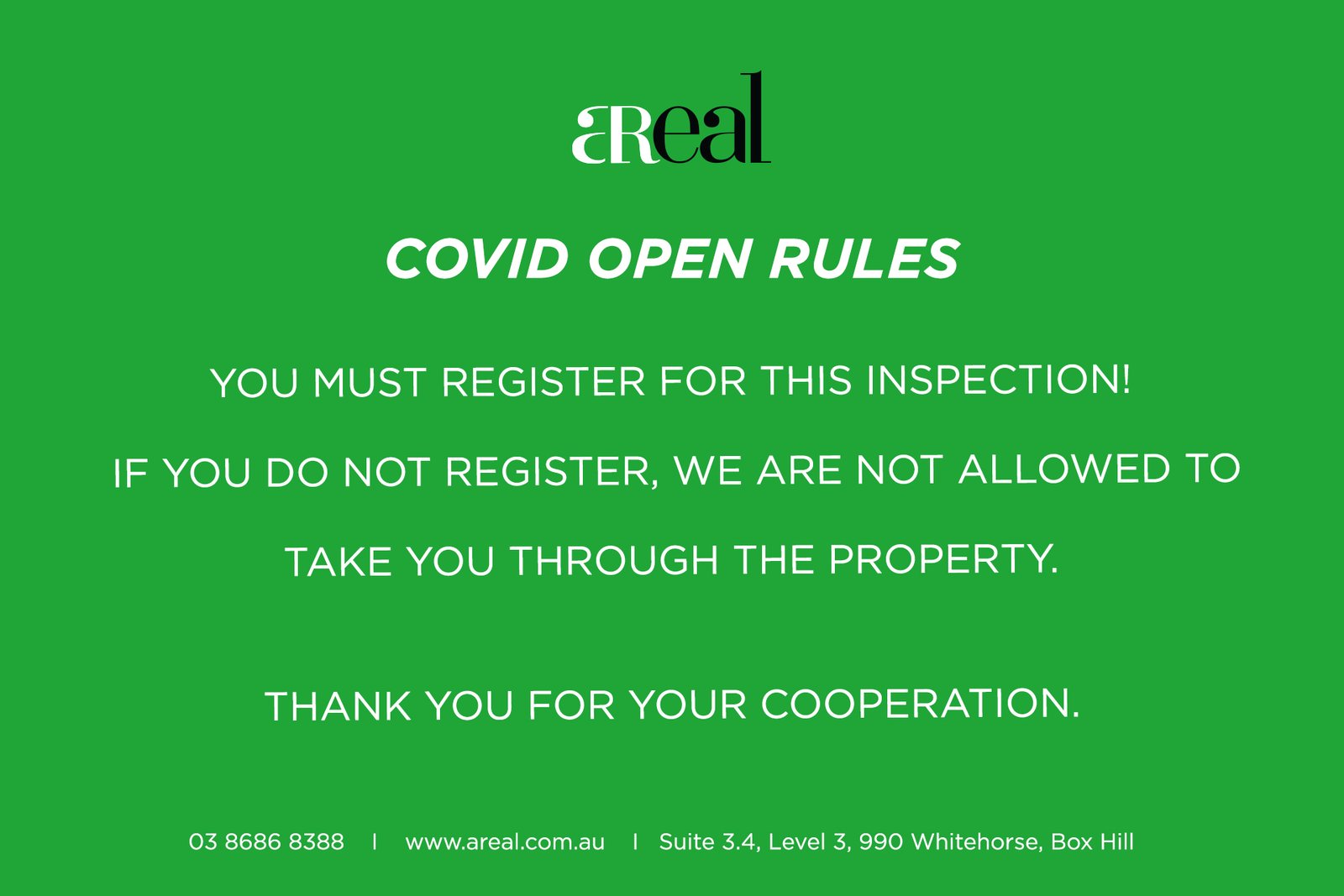 YOU MUST REGISTER FOR THIS INSPECTION! IF YOU DO NOT REGISTER, WE ARE NOT ALLOWED TO TAKE YOU THROUGH THE PROPERTY. THANK YOU FOR YOUR COOPERATION.