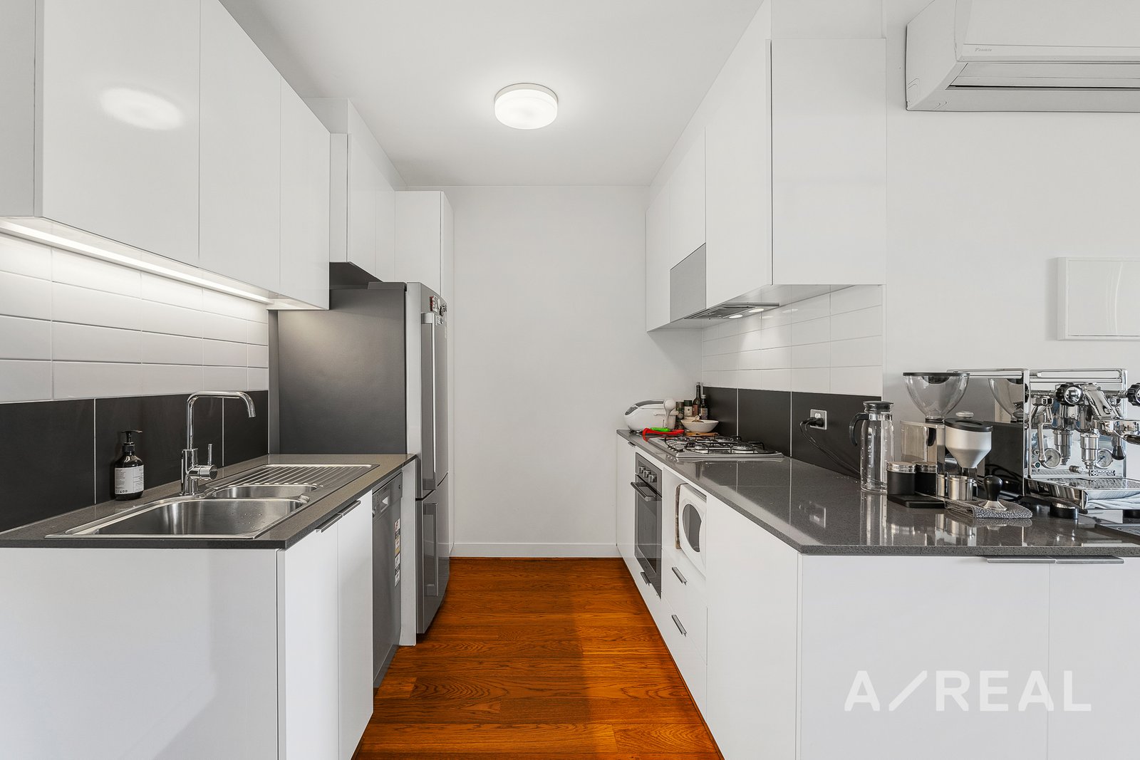 As you step inside, you'll be greeted by a spacious and air-conditioned living area that flows seamlessly to a private balcony, offering leafy views and a serene atmosphere. The interior has stylish timber floors and a contemporary modern aesthetic. The large kitchen is a chef's dream, with an extended breakfast bar – the ideal spot for a coffee machine, ample cupboard and bench space, stainless steel appliances, a double sink, and gas cooking.