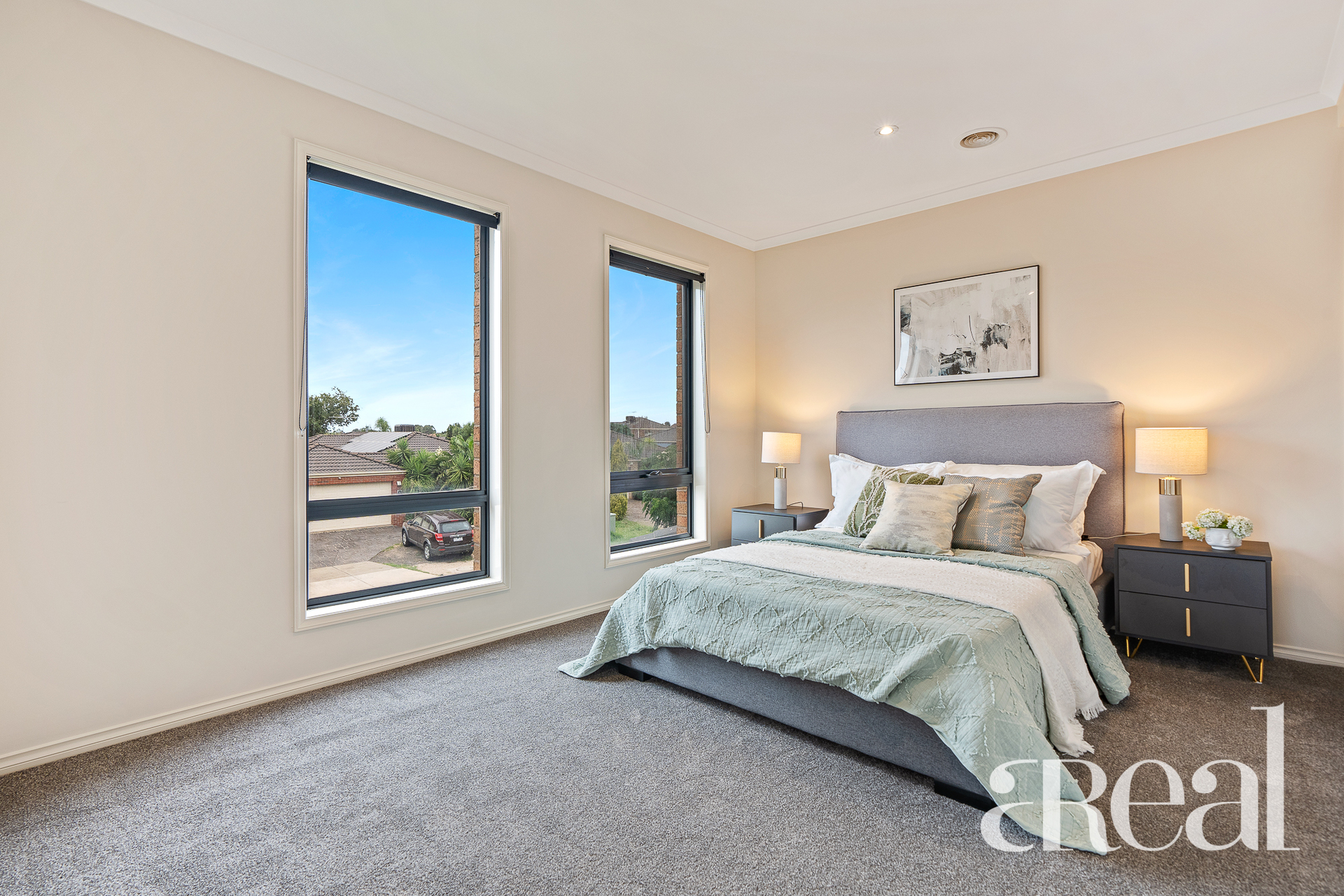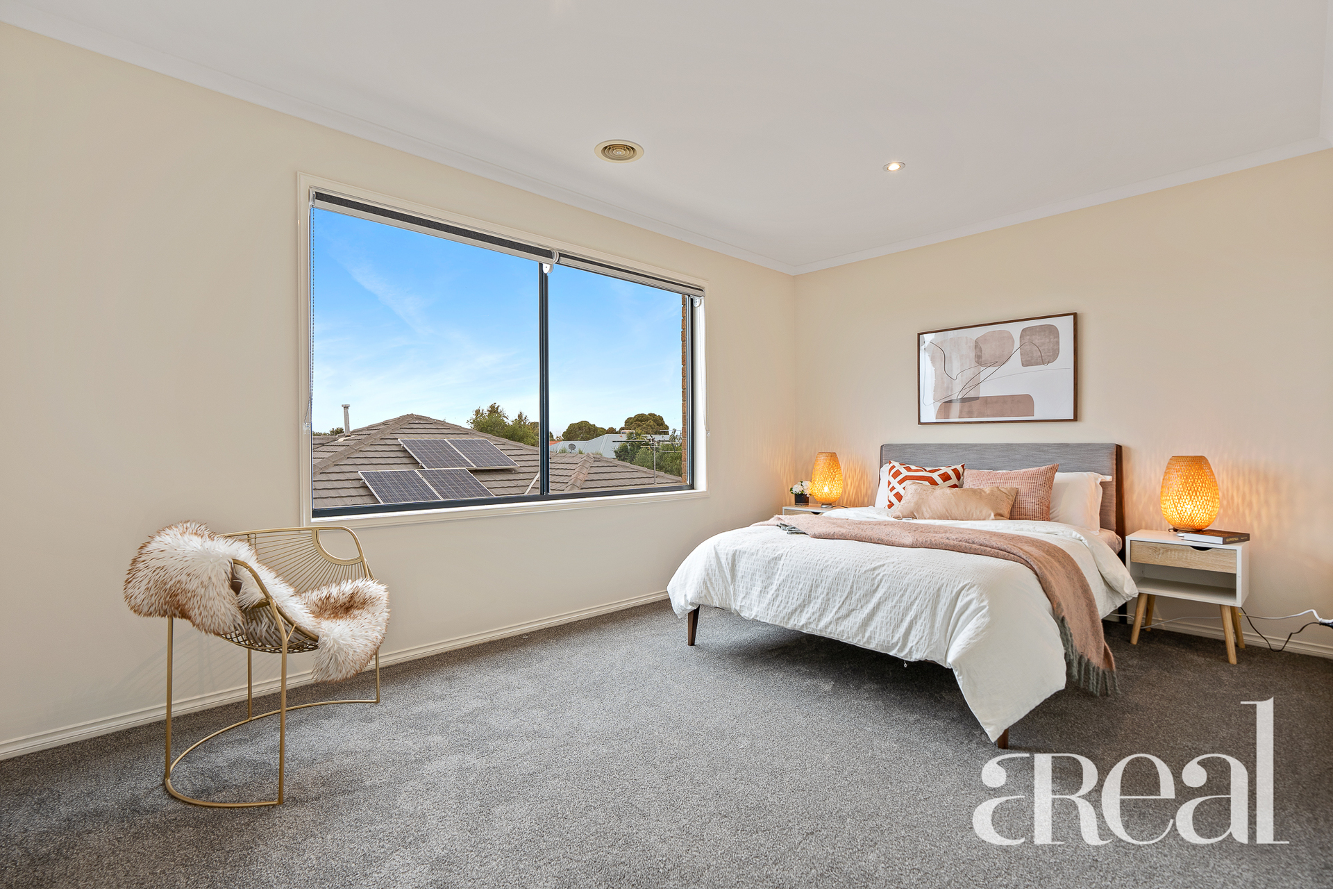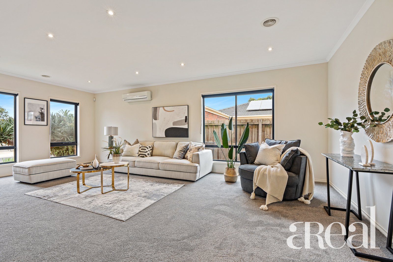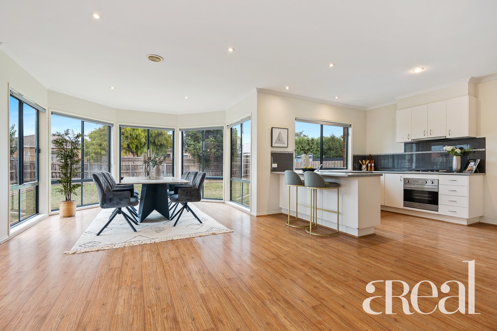 The ground floor is open, generous and light-filled with a large living room set just off the entry. Split system air-conditioning and plush carpet await in this cosy space or you can move through to the open-plan kitchen, dining and family room with oversized windows that frame views of the backyard.