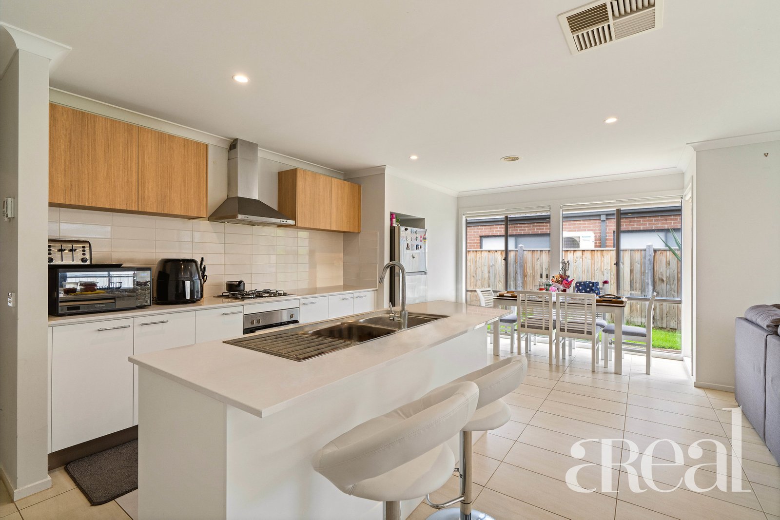 A centre island is set in the heart of the kitchen and provides the perfect place for guests to gather as you cook up a storm. There are stainless steel appliances, a tiled backsplash and an abundance of storage while the eager cook can also overlook the dining area, perfect when hosting your next dinner party.