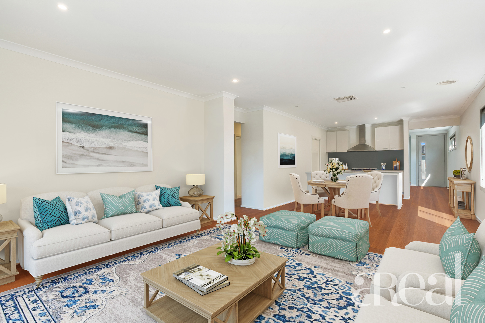To the right of the entry, you will find a light-filled and open living room where you can kick back and relax with loved ones, catch up on your favourite TV shows or simply unwind at the end of the day. From here, the free-flowing floorplan draws you into the spacious kitchen, dining and family room with timber floors and direct access to the covered patio.
