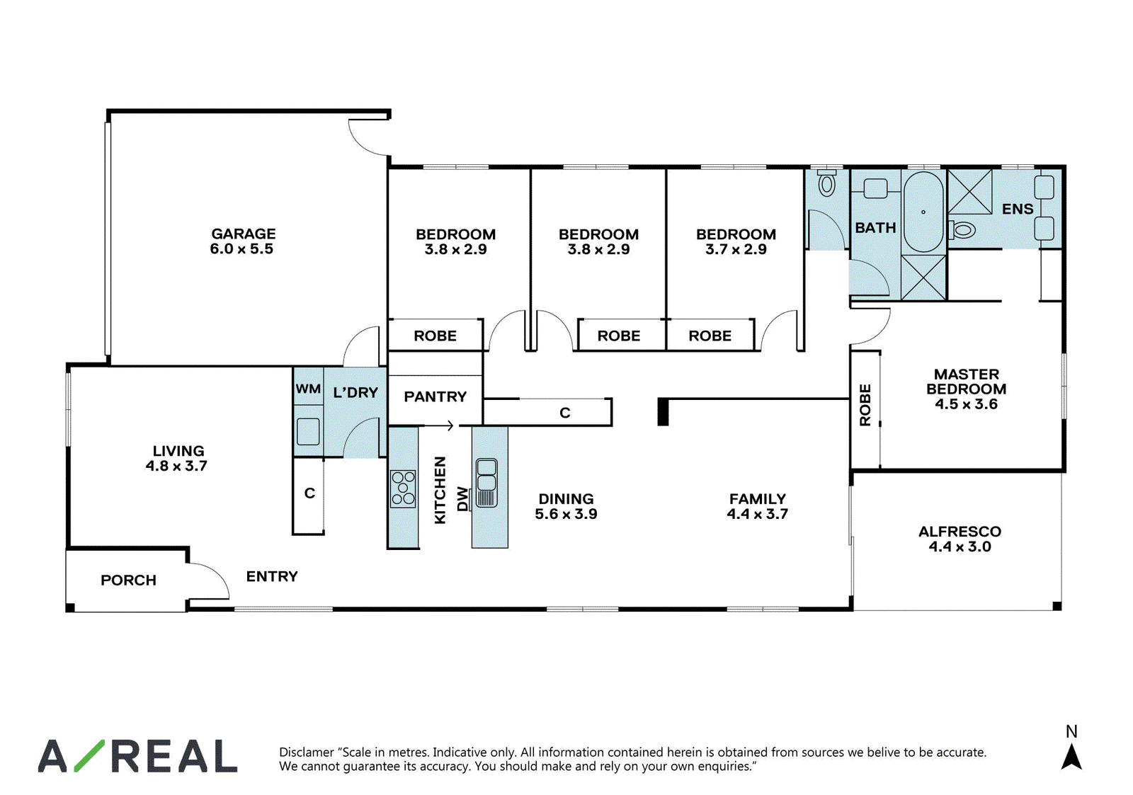 The three family bedrooms have built-in robes, and the main bathroom has a separate bathtub and a detached toilet. The master bedroom has a built-in cupboard and a walk-in robe with an ensuite. Both bathrooms have a contemporary look with modern tiling and spacious vanities.