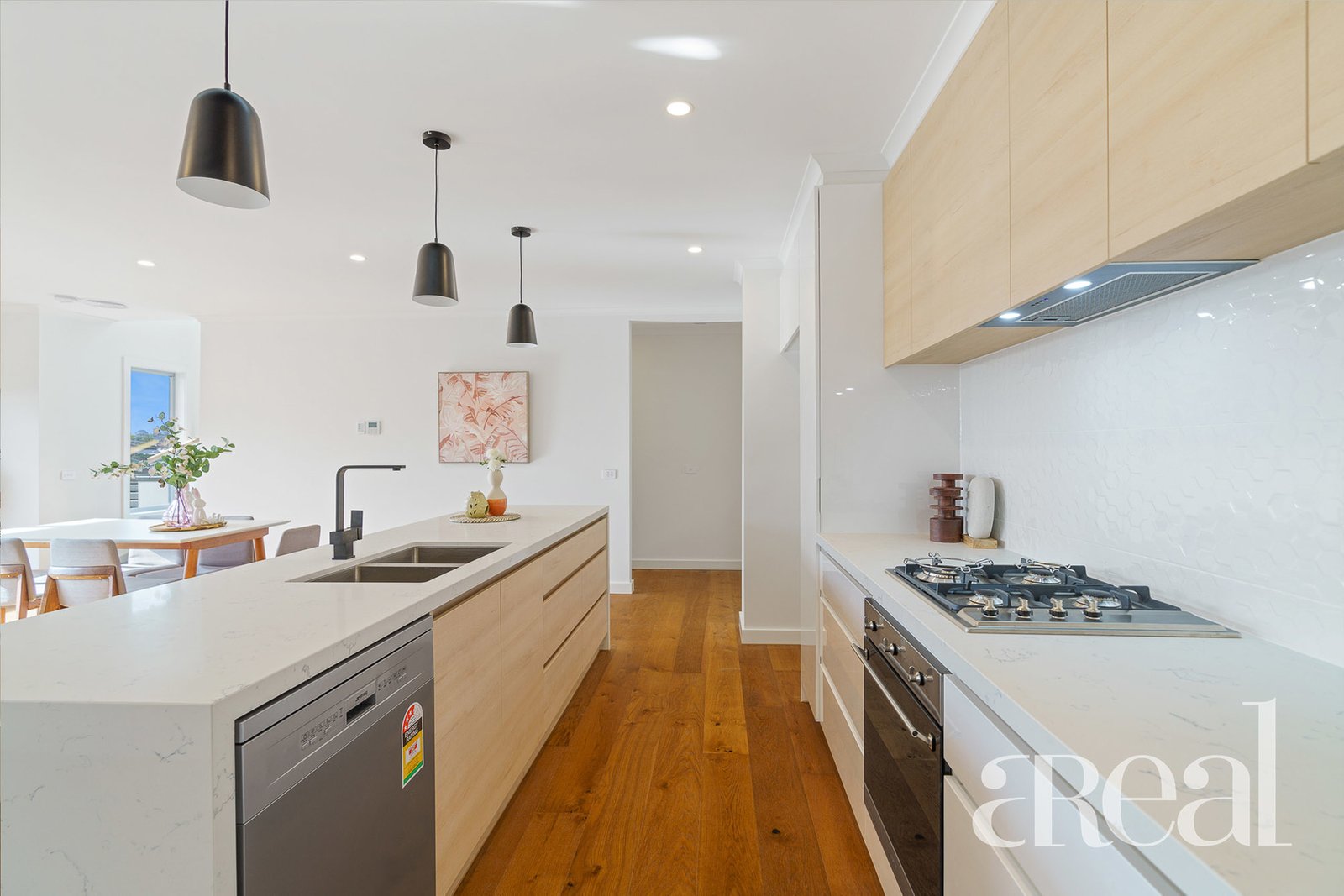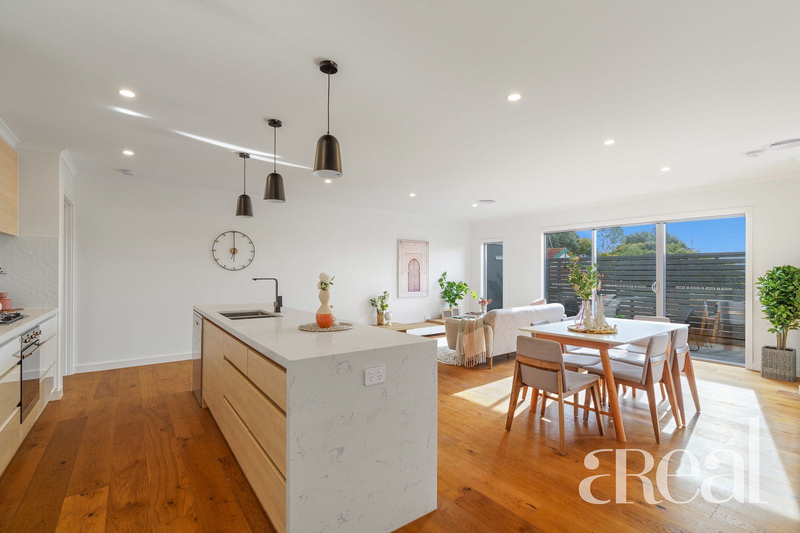 Engineered floating timber floors are on show throughout including in the gourmet kitchen with 40mm stone benchtops, Smeg appliances and an oversized island with breakfast bar seating. The eager cook can get creative while overlooking the large living and meals area that connects to the private entertainer's balcony.