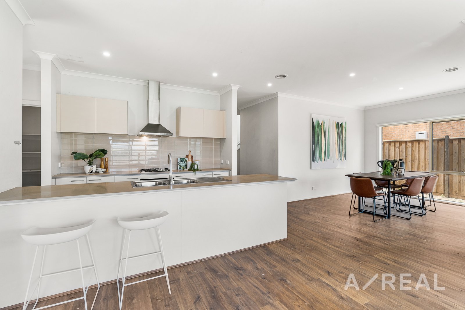 Inside the light-filled contemporary home, there is air-conditioning, timber flooring and quality fittings throughout. Meet in the central open-plan family/dining/kitchen area that extends outside to an alfresco dining patio and backyard – perfect for entertaining.