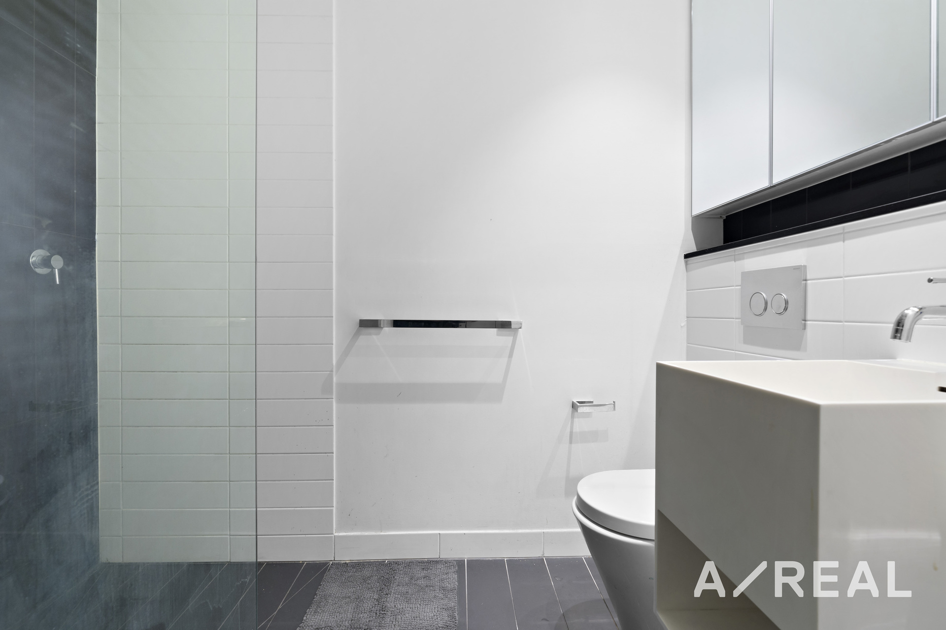 The chic chef's kitchen runs along one wall and boasts dark-coloured cabinetry and benchtops, a suite of stainless steel appliances, a good-size pantry and a mirrored backsplash. You can prepare delicious meals for friends while chatting with guests in the living room complete with air-conditioning for absolute comfort.