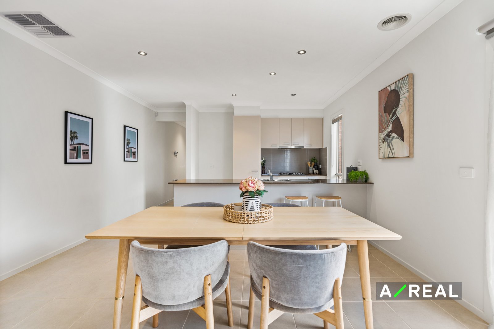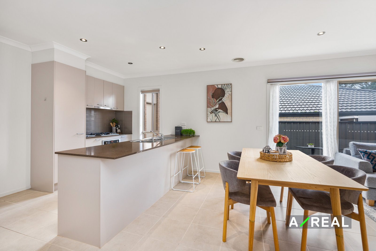 You can gather in the open-plan living area with a large kitchen where there is an island bench and seating for easy meals and conversation. Plus, there is plenty of cupboard storage, a gas cooktop and oven and room for a double-door fridge.