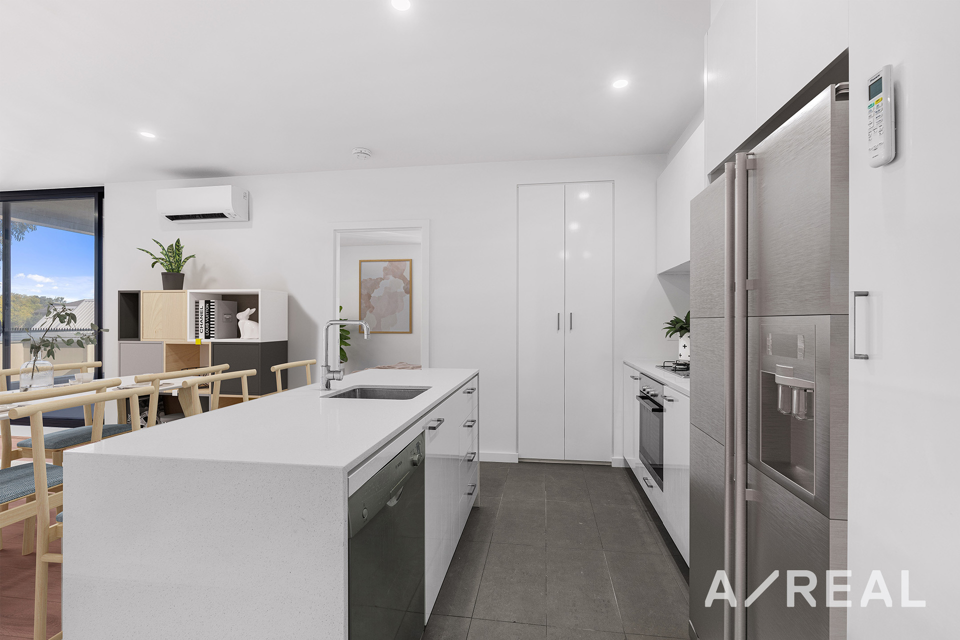 Your home chef will appreciate the sleek white stone top kitchen, equipped with stainless-steel appliances, gas cooking, and a pantry.