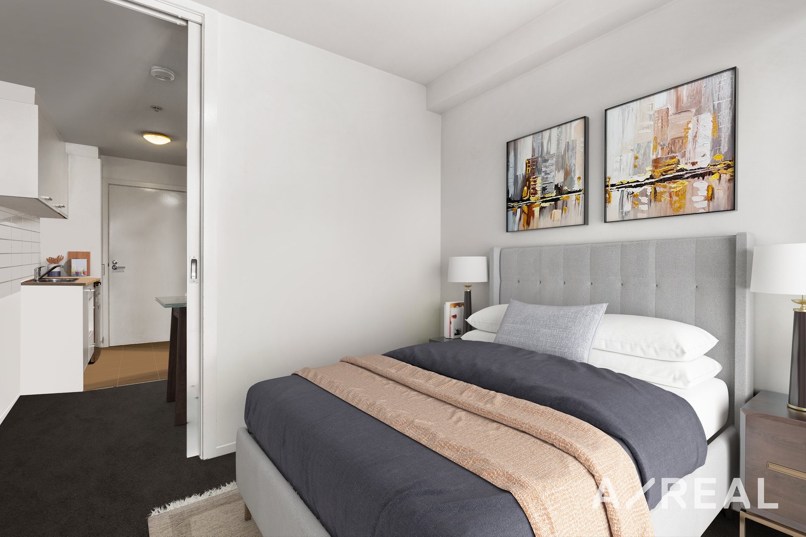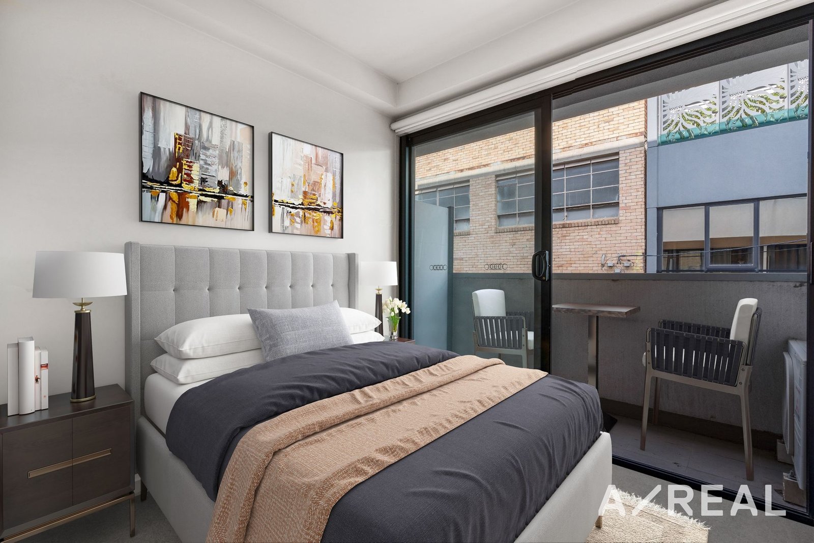 This bedroom space features a large glass sliding door with roller blinds that offer the perfect amount of peace and privacy when needed, whilst also allowing airflow throughout the unit.