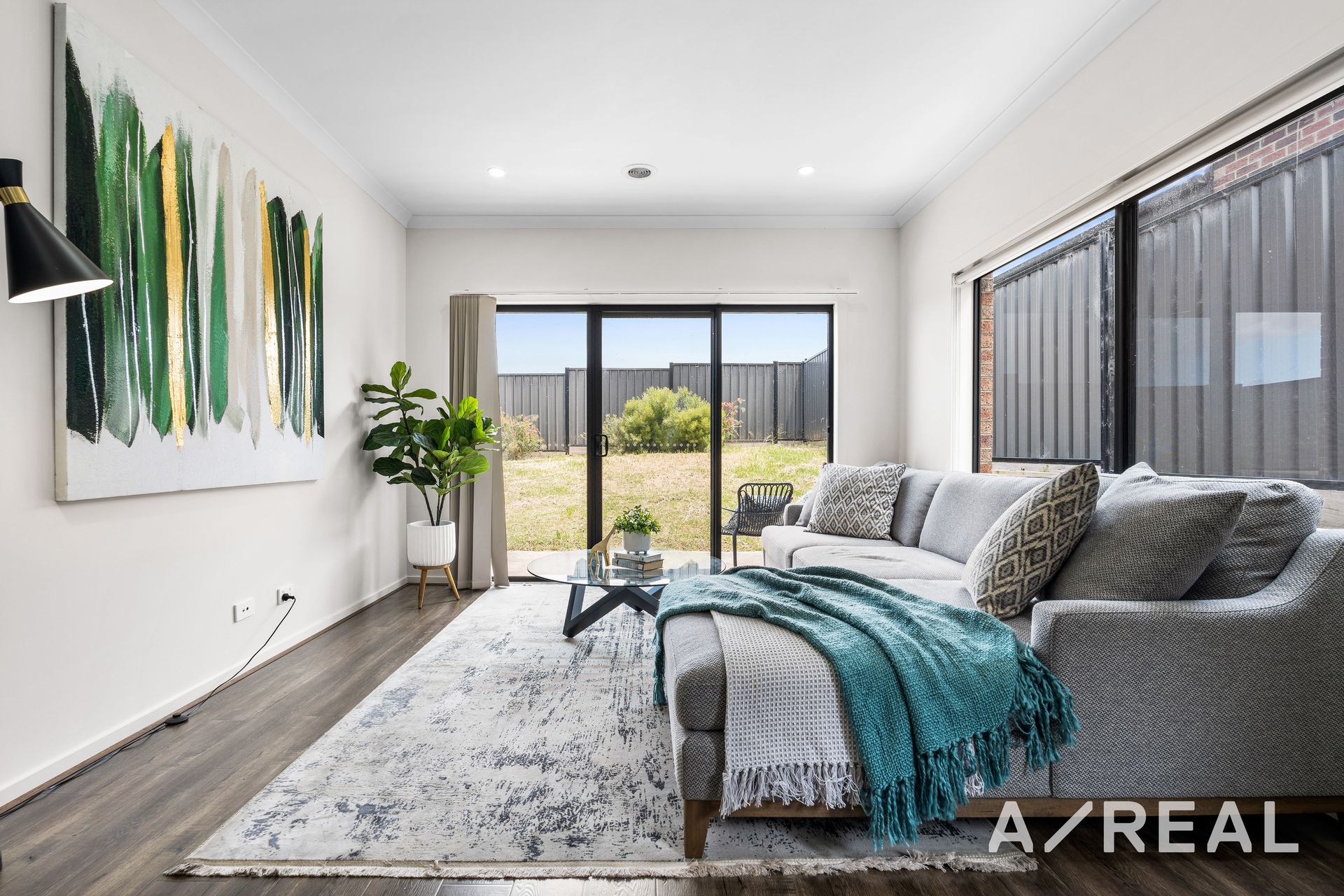 Upon arrival, we're greeted by a neat garden and patio that leads to a welcoming entry. There's a neutral colour pallet throughout with timber floors, roller blinds and modern black framed windows.