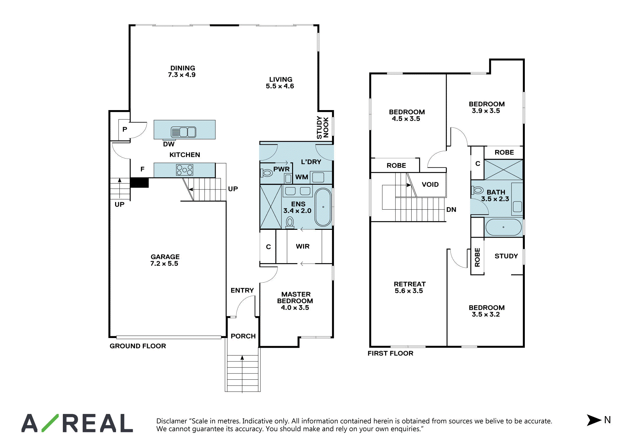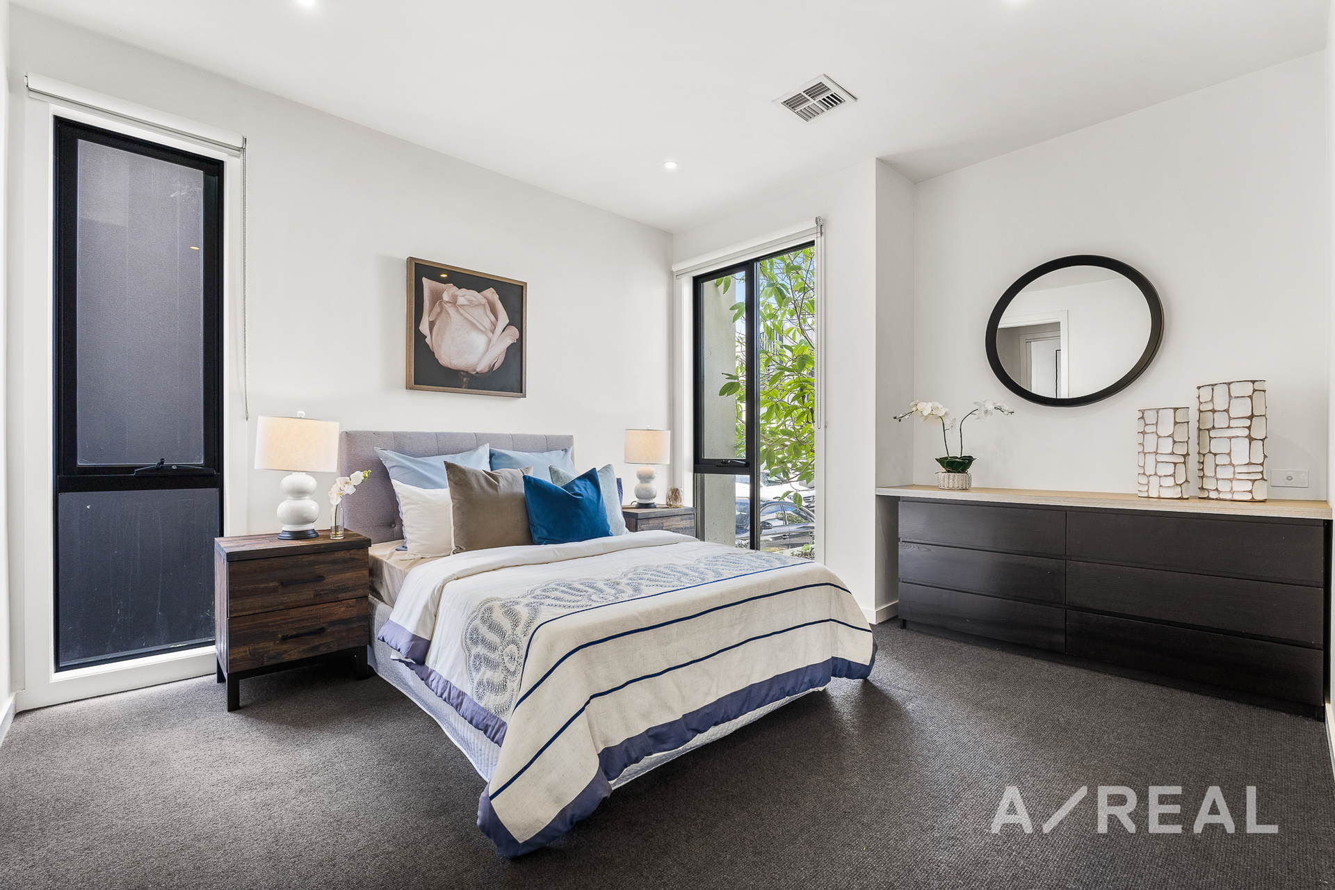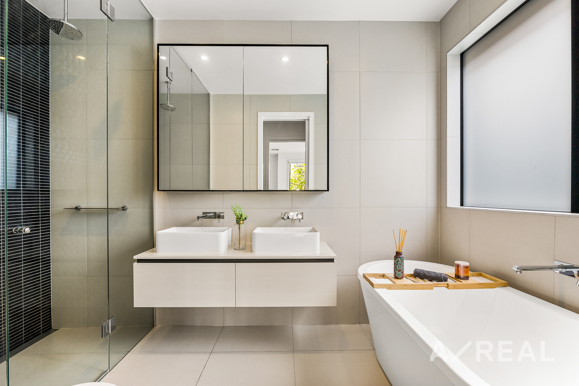 The master bedroom on the ground floor is a relaxing sanctuary with a large walk-in wardrobe, an ensuite with twin vanity, a huge, mirrored cabinet, a shower and a free-standing bath, so you can indulge in a soak in the tub.