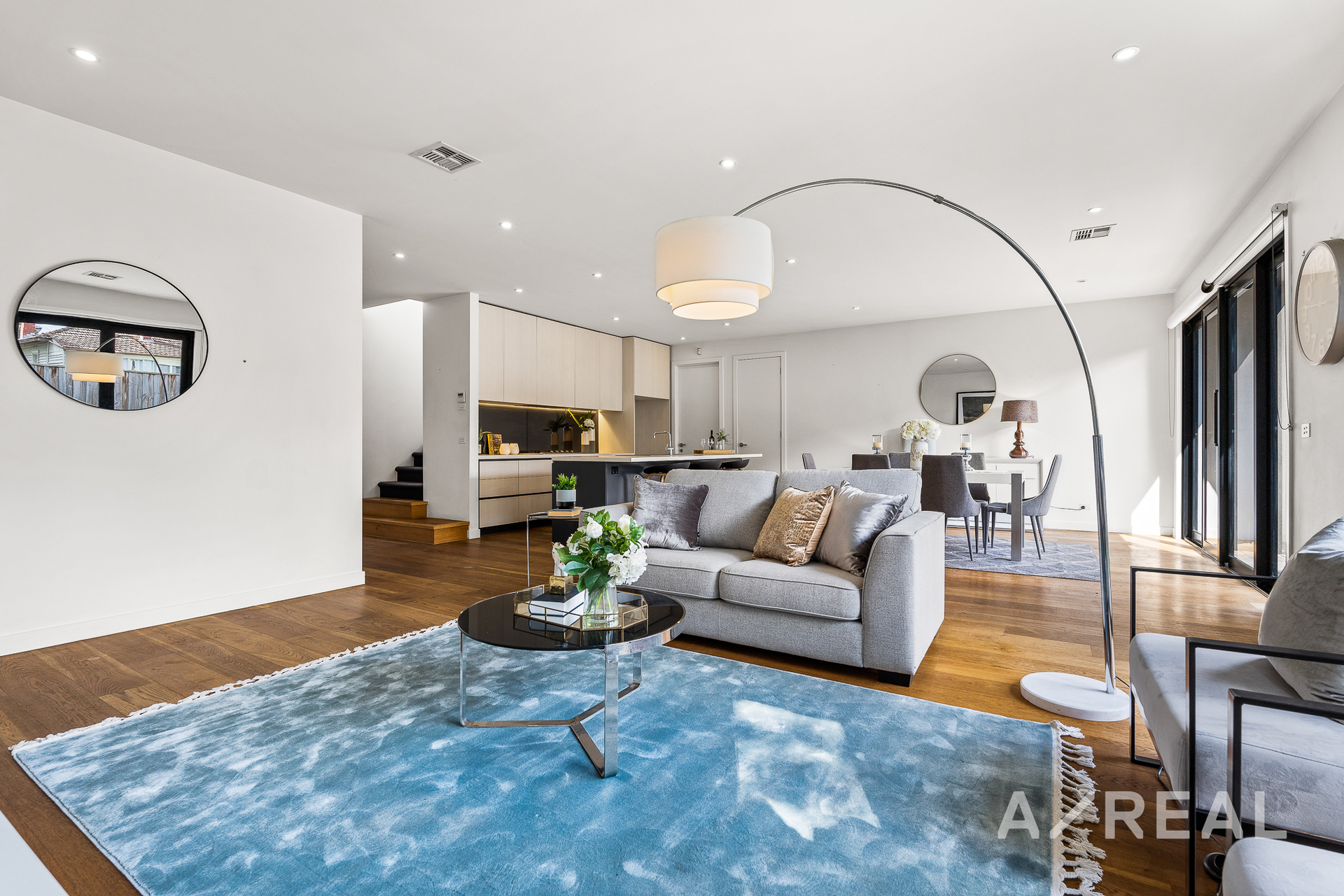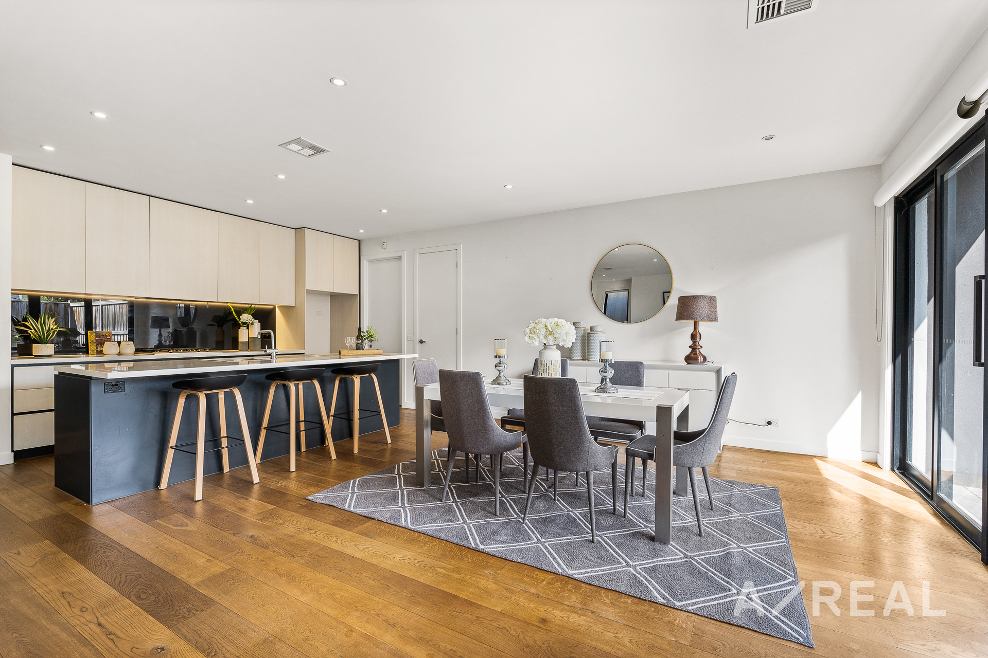 The sophisticated interior has a timeless neutral colour scheme with a stunning gourmet kitchen in the heart of the open-plan layout. It has a stone top breakfast bar for gathering for quick meals. You'll love the handleless cabinets and the quality stainless-steel Miele appliances. The living area extends out from the dining and the lounge through sliding doors to a paved courtyard and backyard - perfect for entertaining guests. There's also a powder room and laundry on the main level for convenience.