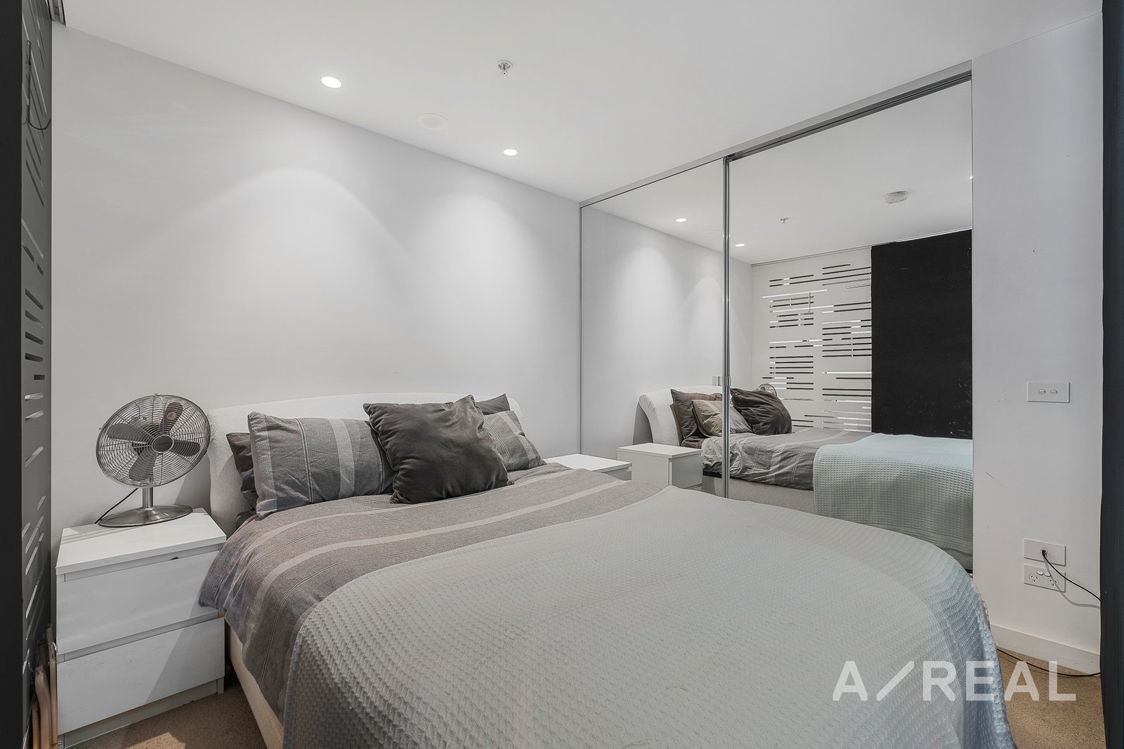 The spacious layout presents an exquisite blend of comfort and style with a large bedroom with a mirrored built-in robe. The tiled bathroom features a stone-topped sink with a wall-mounted vanity for a touch of luxury.