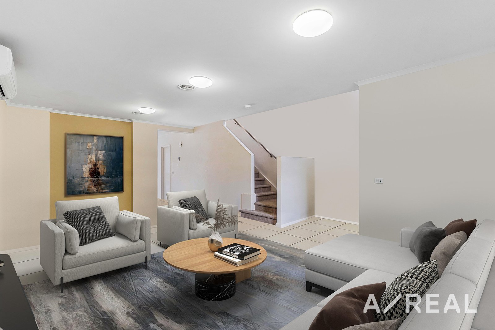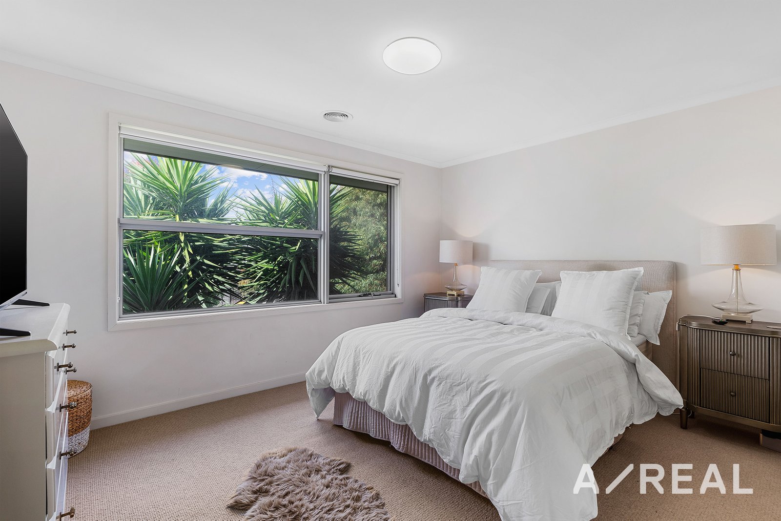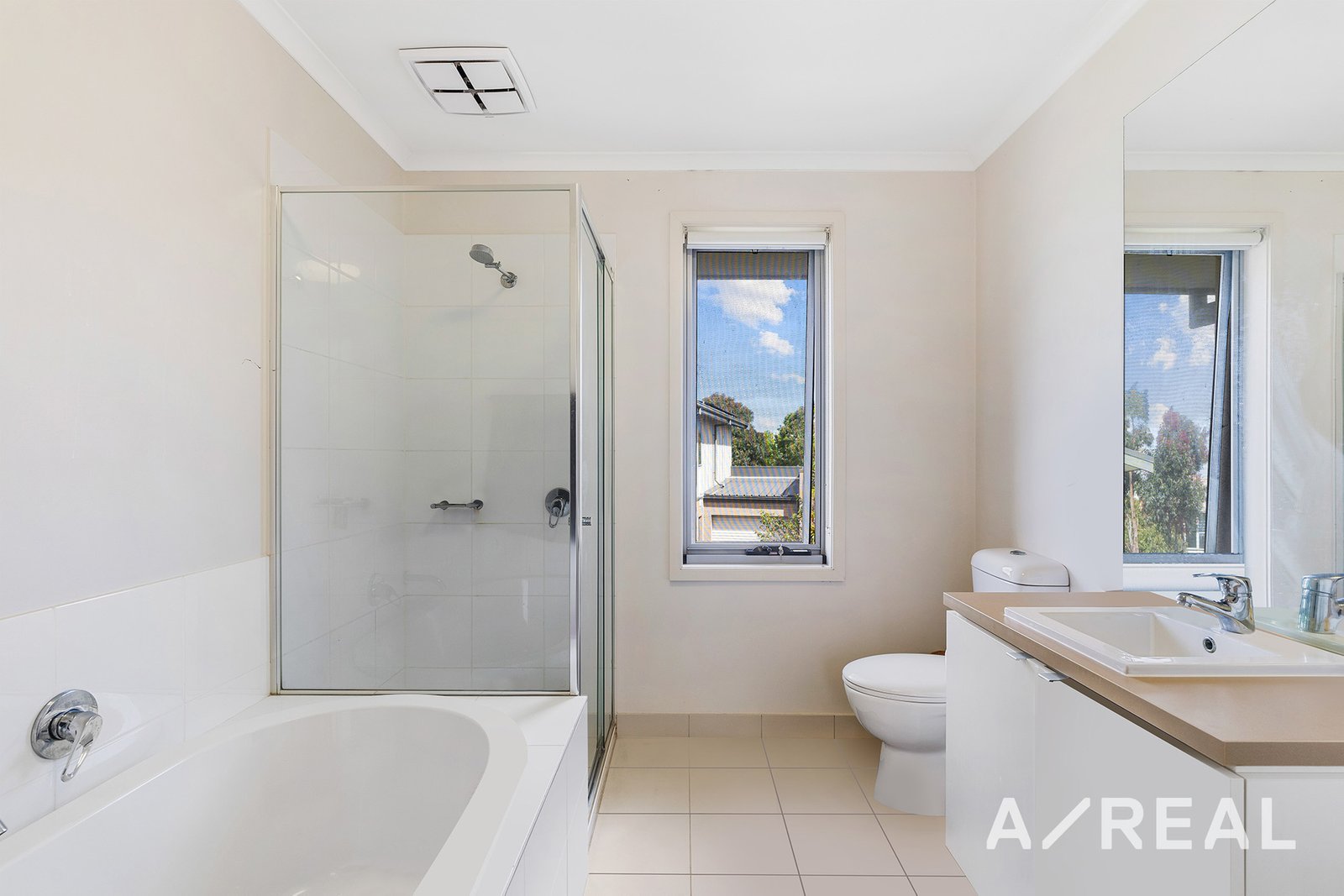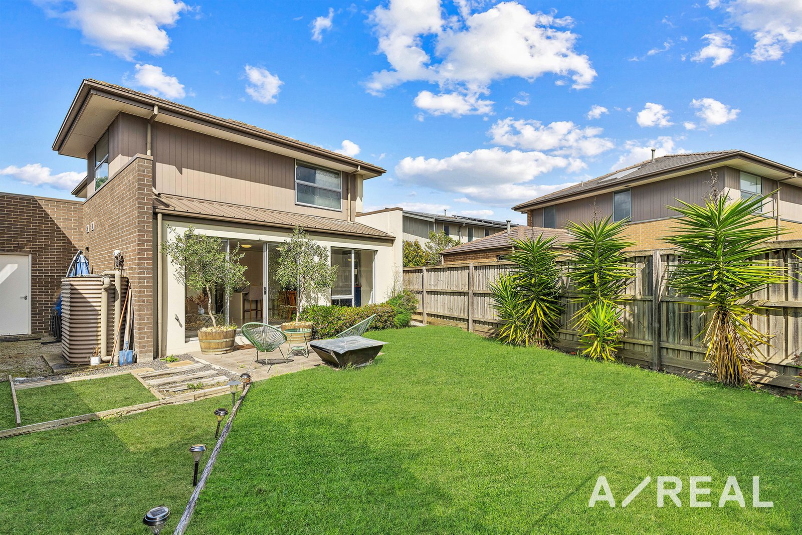 Upstairs, the master suite includes a walk-in robe and an ensuite bathroom. Two additional bedrooms have built-in robes and share a main bathroom with a shower-over-bath.