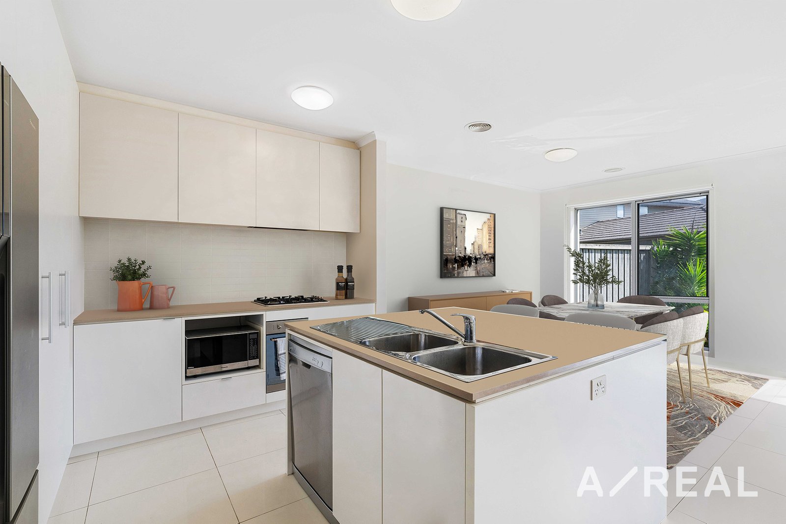 As you approach, you're immediately captivated by a welcoming front porch and a tropical landscaped garden, setting the tone for what lies within. Step inside to discover a spacious lounge room at the front, providing a perfect place to unwind. Moving further, you'll find the heart of the house – an open-plan living area comprising a modern kitchen, dining space, and a cozy family room that seamlessly connects to a sunny patio and a lush grassy backyard. The kitchen is a delight, featuring a large island breakfast bar, elegant stone countertops, a pantry, high-quality appliances, and ample storage.